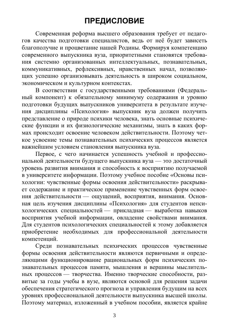 Учебное пособие «Основы психологии: чувственные формы освоения действительности» раскрывает теоретическое содержание и практическое использование таких основополагающих психических форм освоения действительности, как ощущение, восприятие, а также внимание. Чувственные формы освоения действительности являются первичными и определяющими функционирование высших психических форм познавательных процессов: памяти, мышления и вершины мыслительных процессов — творчества. Пособие содержит основные теоретические положения, которые должны быть усвоены, а для практической отработки тем предлагает контрольные вопросы, тестовые задания и психологические задачи нормативной и повышенной сложности, а также тематику рефератов исследований по рассматриваемым темам. Данное пособие составлено на основе лекций и практических занятий, которые проводились автором в течение более 20 лет с помощью инновационных педагогических технологий. Целью его является оказание помощи бакалаврам психологических и непсихологических направлений подготовки при освоении такой дисциплины социально-гуманитарного цикла, как «Психология».