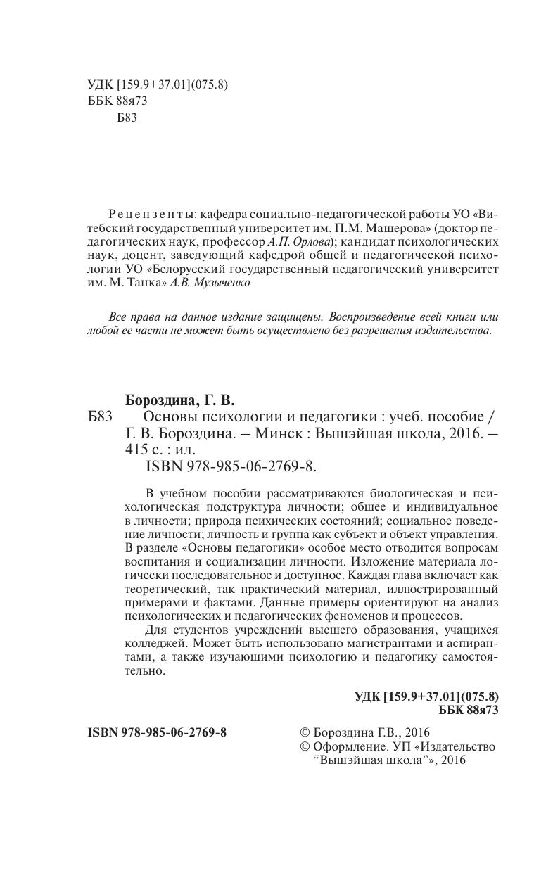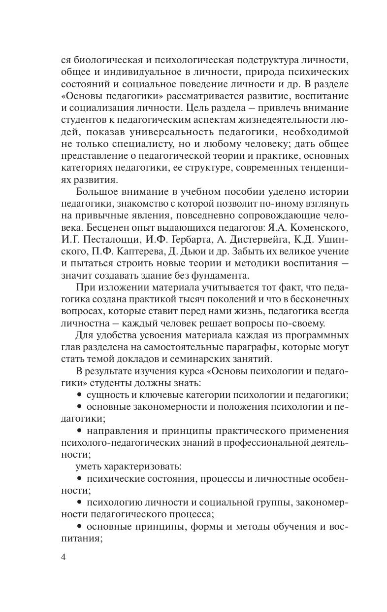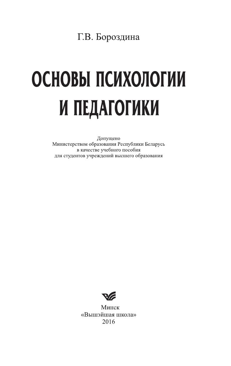 В разделе «Основы педагогики» особое место отводится вопросам воспитания и социализации личности. Изложение материала логически последовательное и доступное. Каждая глава включает как теоретический, так практический материал, иллюстрированный примерами и фактами. Данные примеры ориентируют на анализ психологических и педагогических феноменов и процессов. Для студентов учреждений высшего образования, учащихся колледжей. Может быть использовано магистрантами и аспирантами, а также изучающими психологию и педагогику самостоятельно.