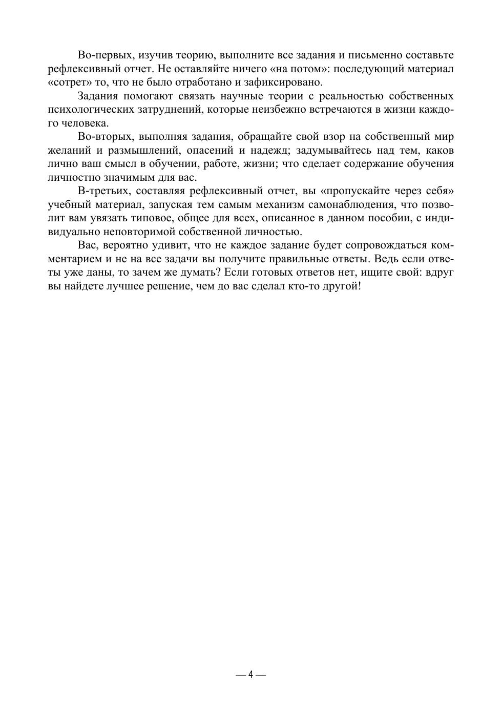 Практика показывает, что даже блестяще подготовленный специалист порой оказывается профессионально непригодным по причинам психологического характера. И тогда неизбежно приходится учиться находить пути в одном из самых запутанных лабиринтов — лабиринте человеческих отношений. Процесс изучения психологии может стать лучшим средством для повышения своей психологической компетентности, что позволит выпускнику вуза достичь личностного роста и профессионального успеха. Данное пособие представляет собой практико-ориентированный курс, направленный на формирование универсальных психологических компетенций будущего специалиста. Пособие предназначено как для бакалавров и магистрантов высших учебных заведений, так и для обучающихся в системе специалитета, а также будет интересно тем, кто ищет психологический инструментарий и техники, позволяющие достичь целей самореализации.