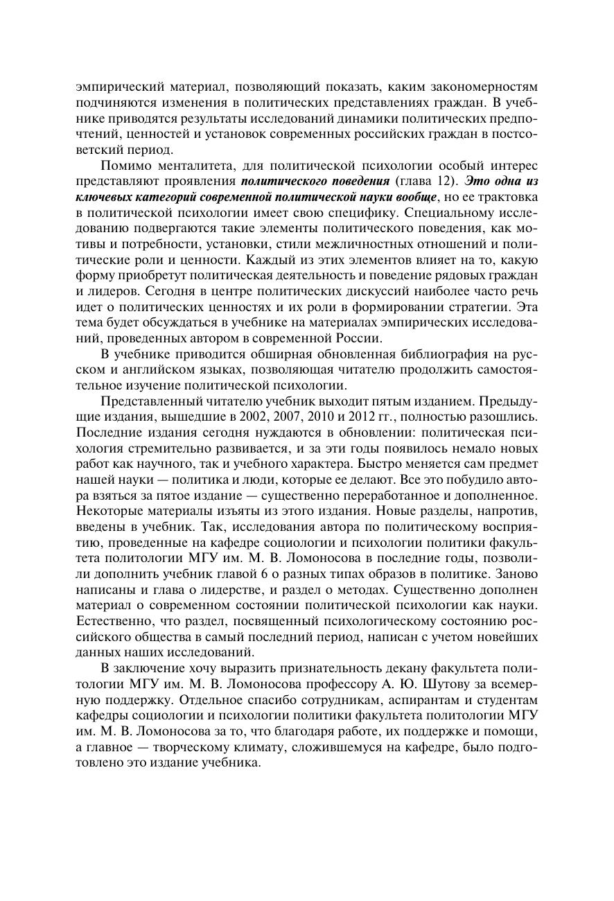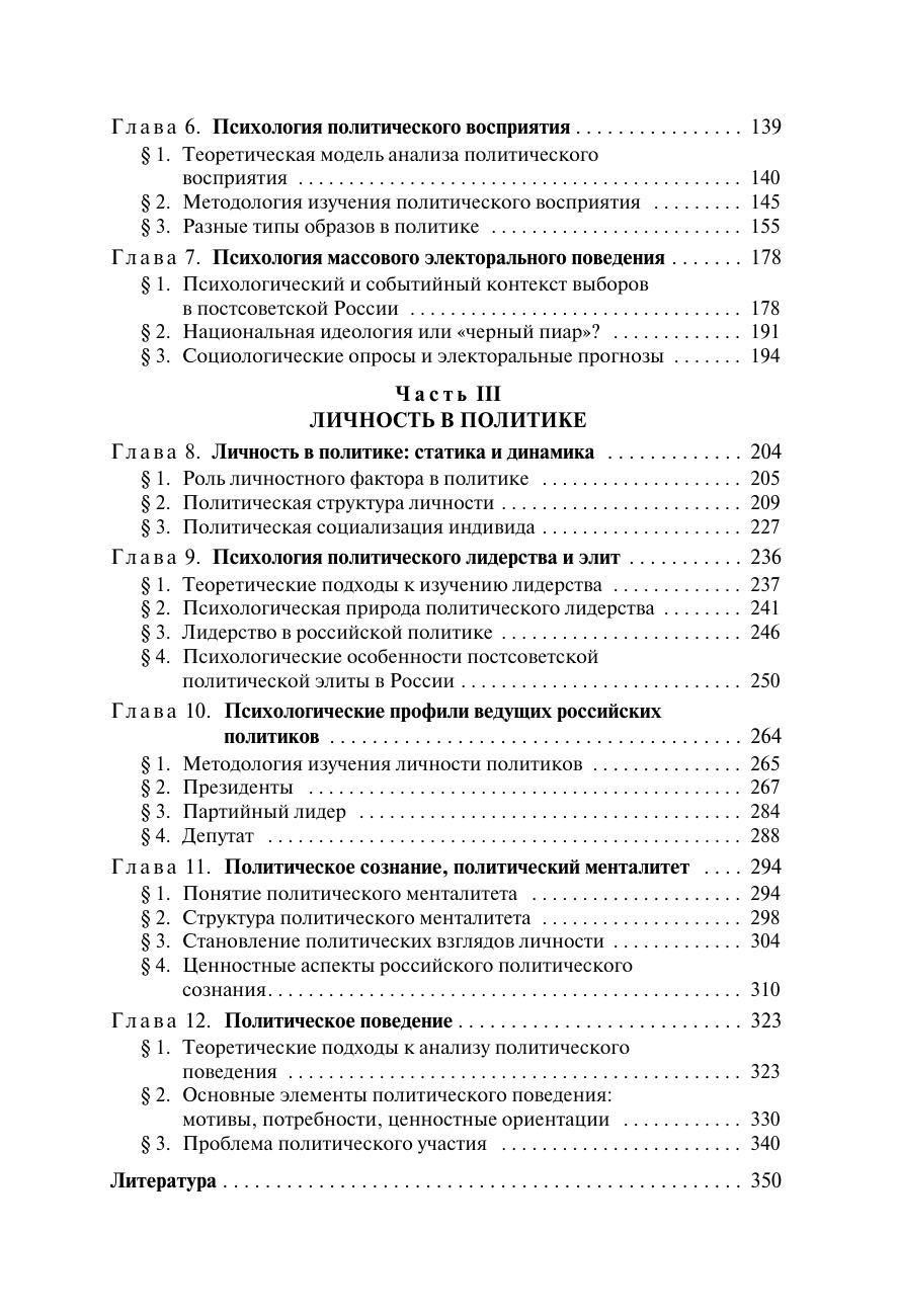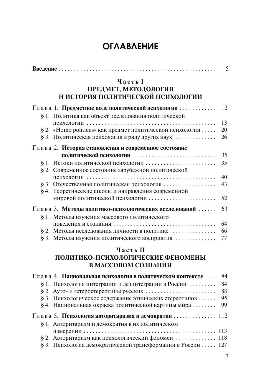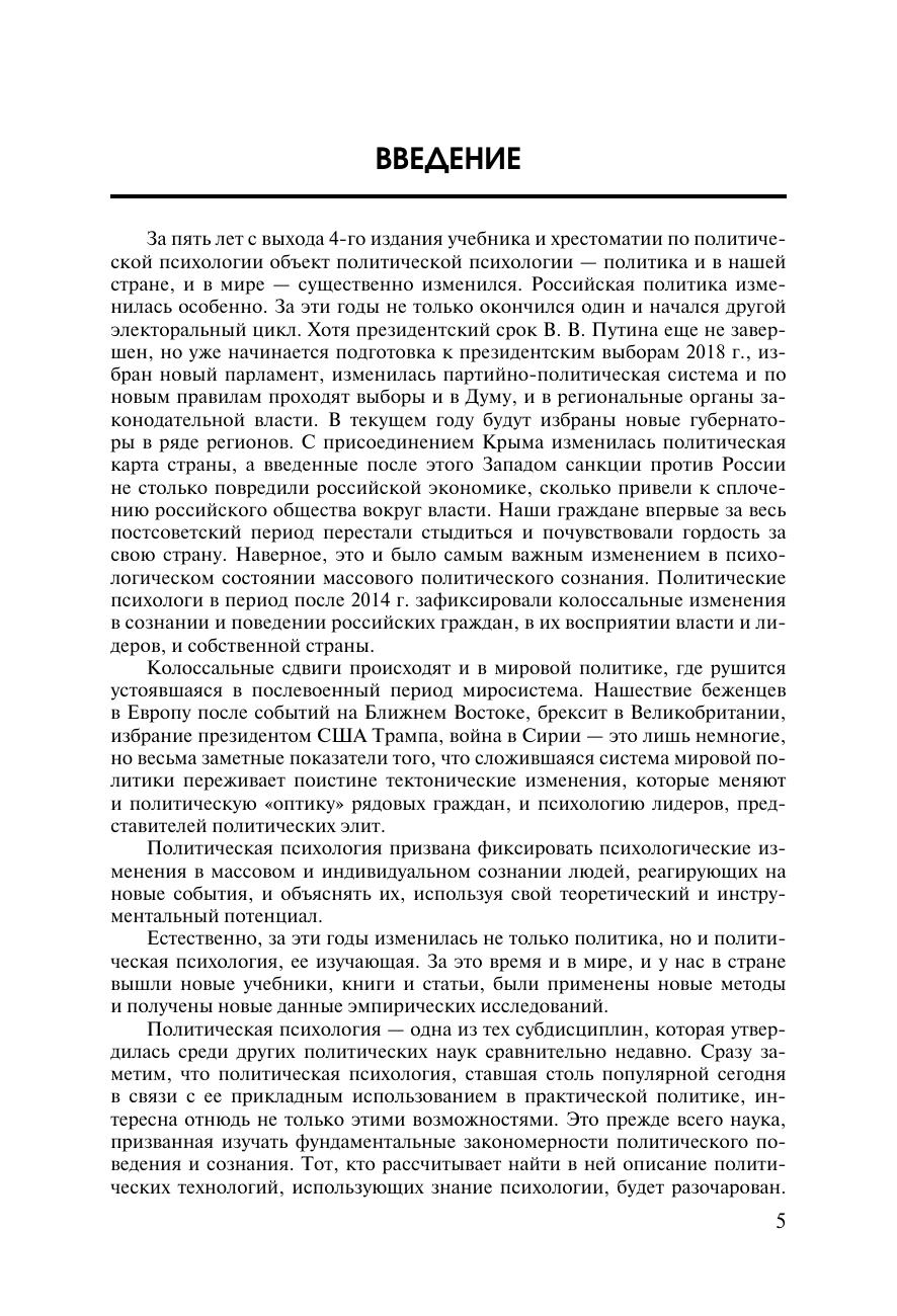 Учебник представляет собой систематическое изложение предмета политической психологии — науки о человеческом измерении политики. Она уже зарекомендовала себя как академическая и научная дисциплина и вошла в число обязательных предметов при подготовке политологов и психологов. Пятое издание учебника полностью соответствует учебному плану по этому курсу, принятому Федеральным учебно-методическим объединением вузов. Издание существенно исправлено и дополнено новыми разделами и результатами новых исследований. Обновлена библиография. Для студентов, магистрантов, аспирантов, изучающих политические и психологические науки.