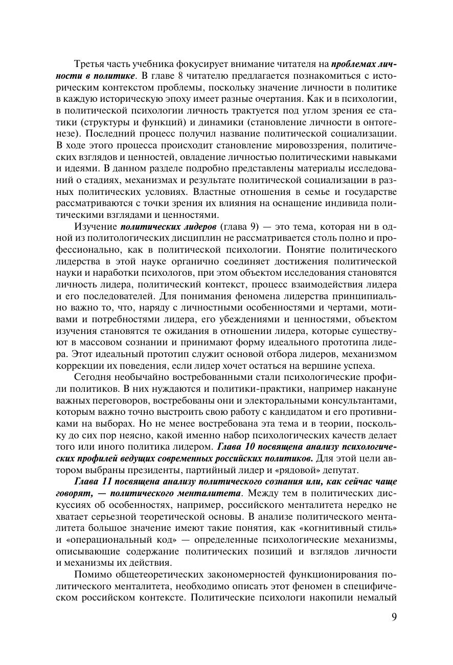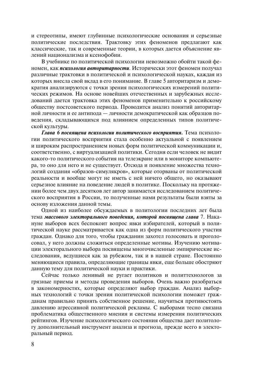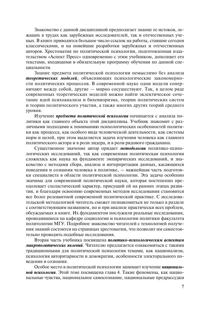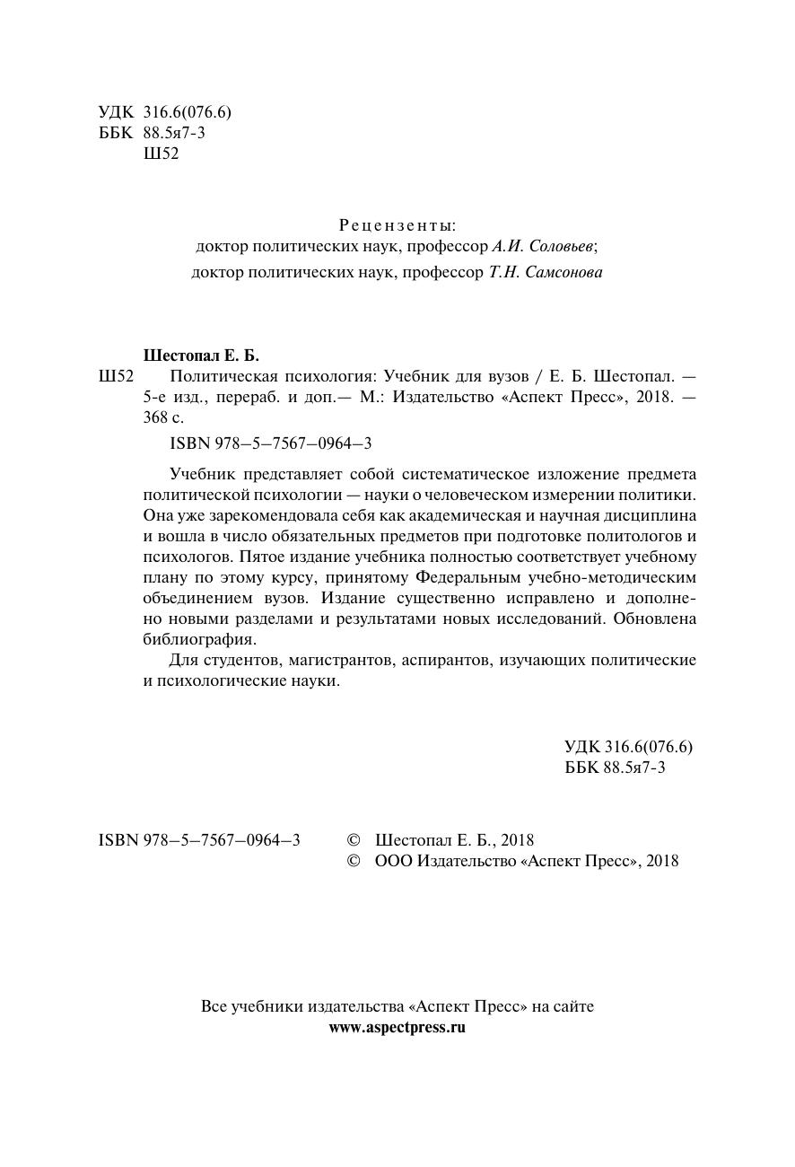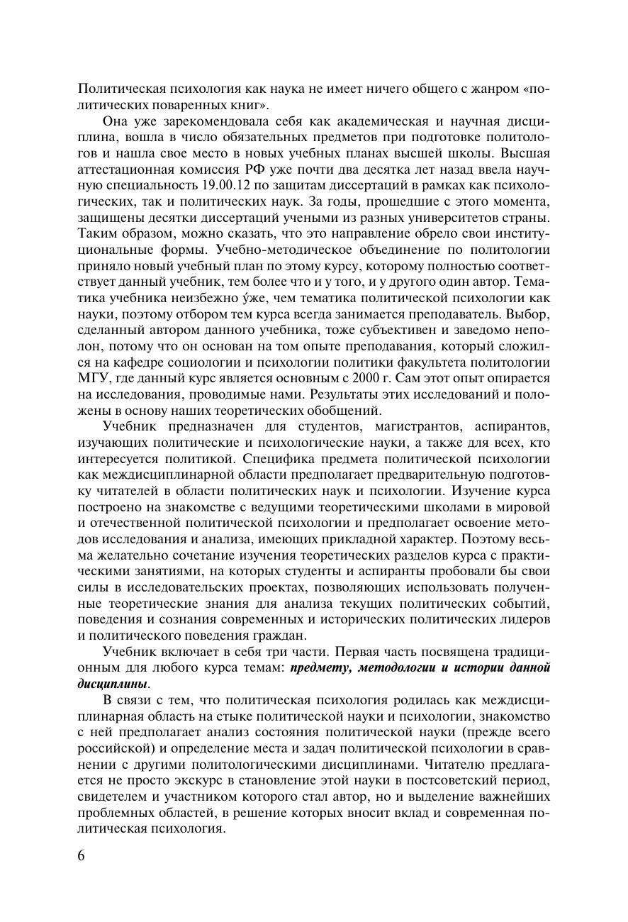 Учебник представляет собой систематическое изложение предмета политической психологии — науки о человеческом измерении политики. Она уже зарекомендовала себя как академическая и научная дисциплина и вошла в число обязательных предметов при подготовке политологов и психологов. Пятое издание учебника полностью соответствует учебному плану по этому курсу, принятому Федеральным учебно-методическим объединением вузов. Издание существенно исправлено и дополнено новыми разделами и результатами новых исследований. Обновлена библиография. Для студентов, магистрантов, аспирантов, изучающих политические и психологические науки.
