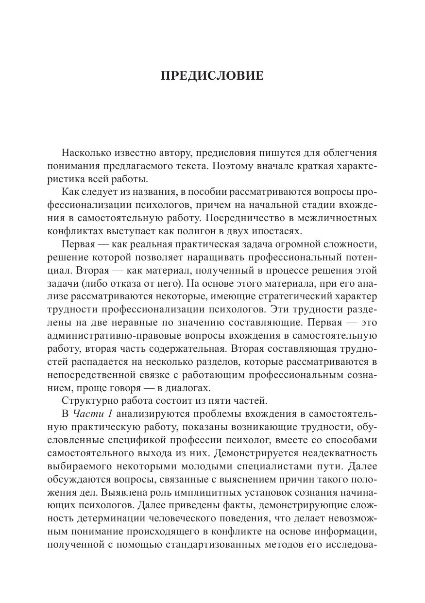 В пособии рассматриваются вопросы профессионализации психологов, причем на начальной стадии вхождения в самостоятельную работу. Посредничество в межличностных конфликтах выступает как полигон в двух ипостасях. Первая — как реальная практическая задача огромной сложности, решение которой позволяет наращивать профессиональный потенциал. Вторая — как материал, полученный в процессе решения этой задачи (либо отказа от него).