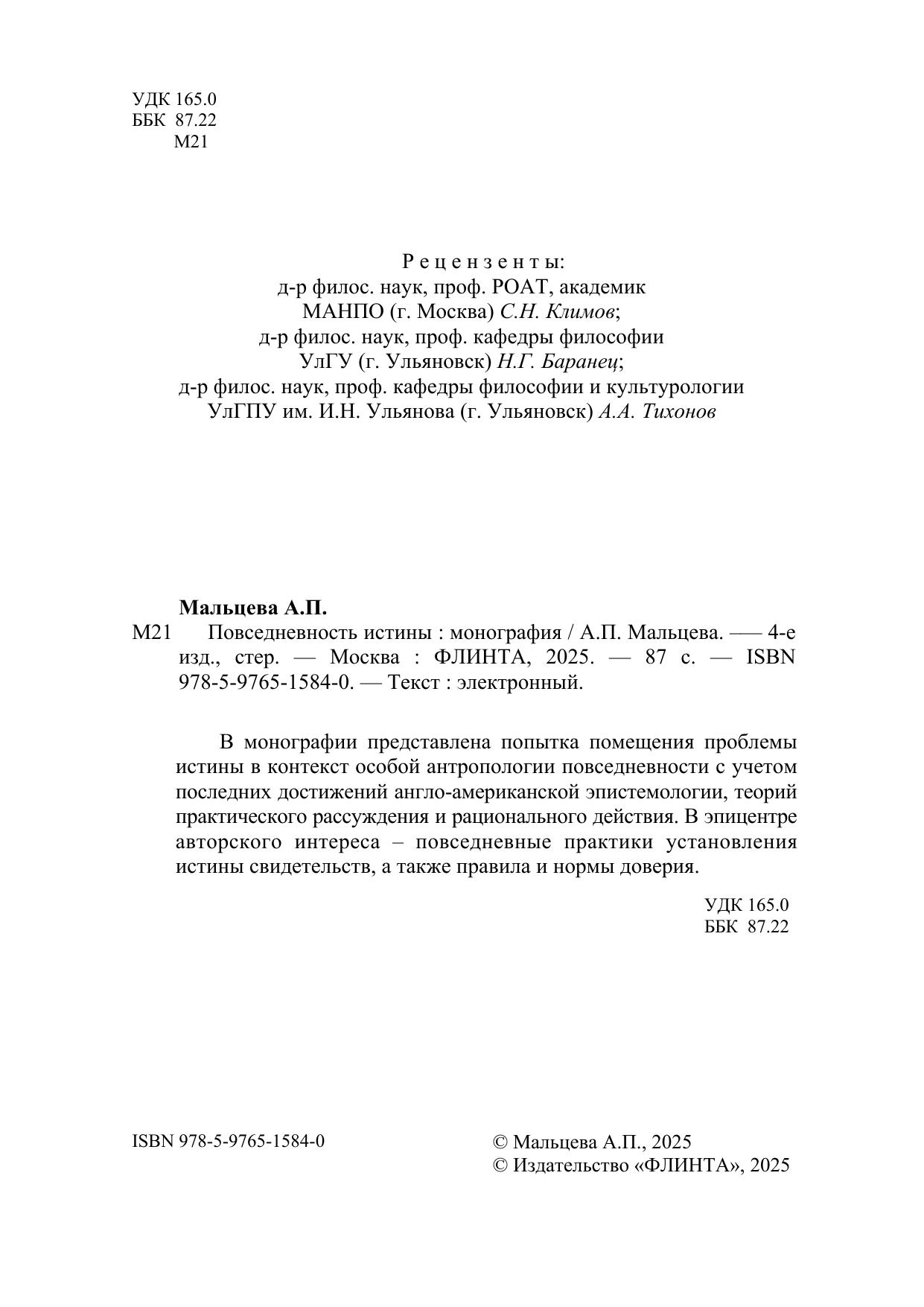 В монографии представлена попытка помещения проблемы истины в контекст особой антропологии повседневности с учетом последних достижений англо-американской эпистемологии, теорий практического рассуждения и рационального действия. В эпицентре авторского интереса – повседневные практики установления истины свидетельств, а также правила и нормы доверия.