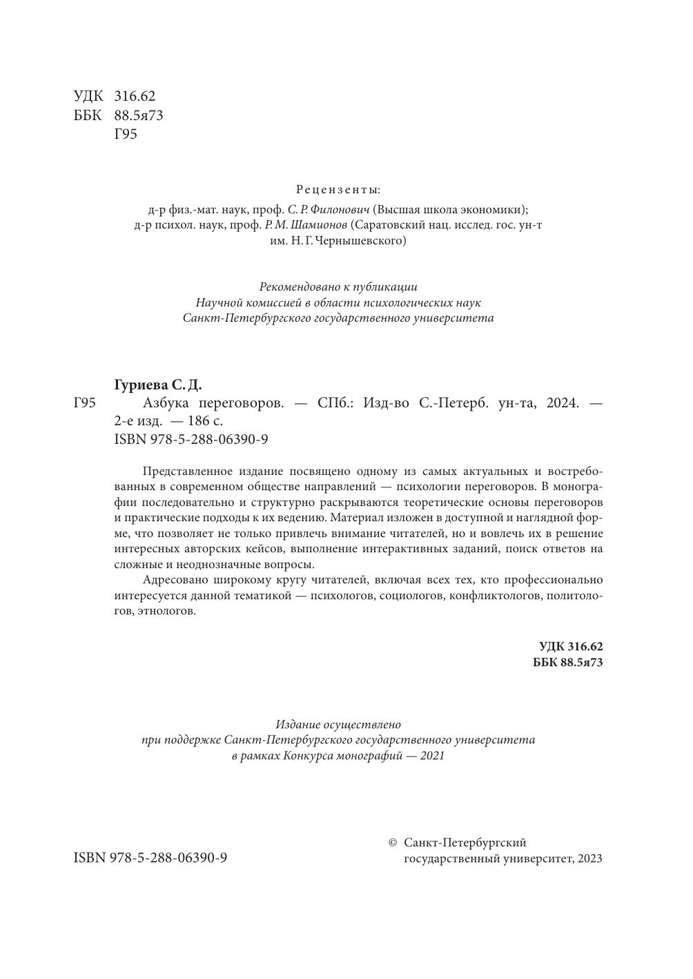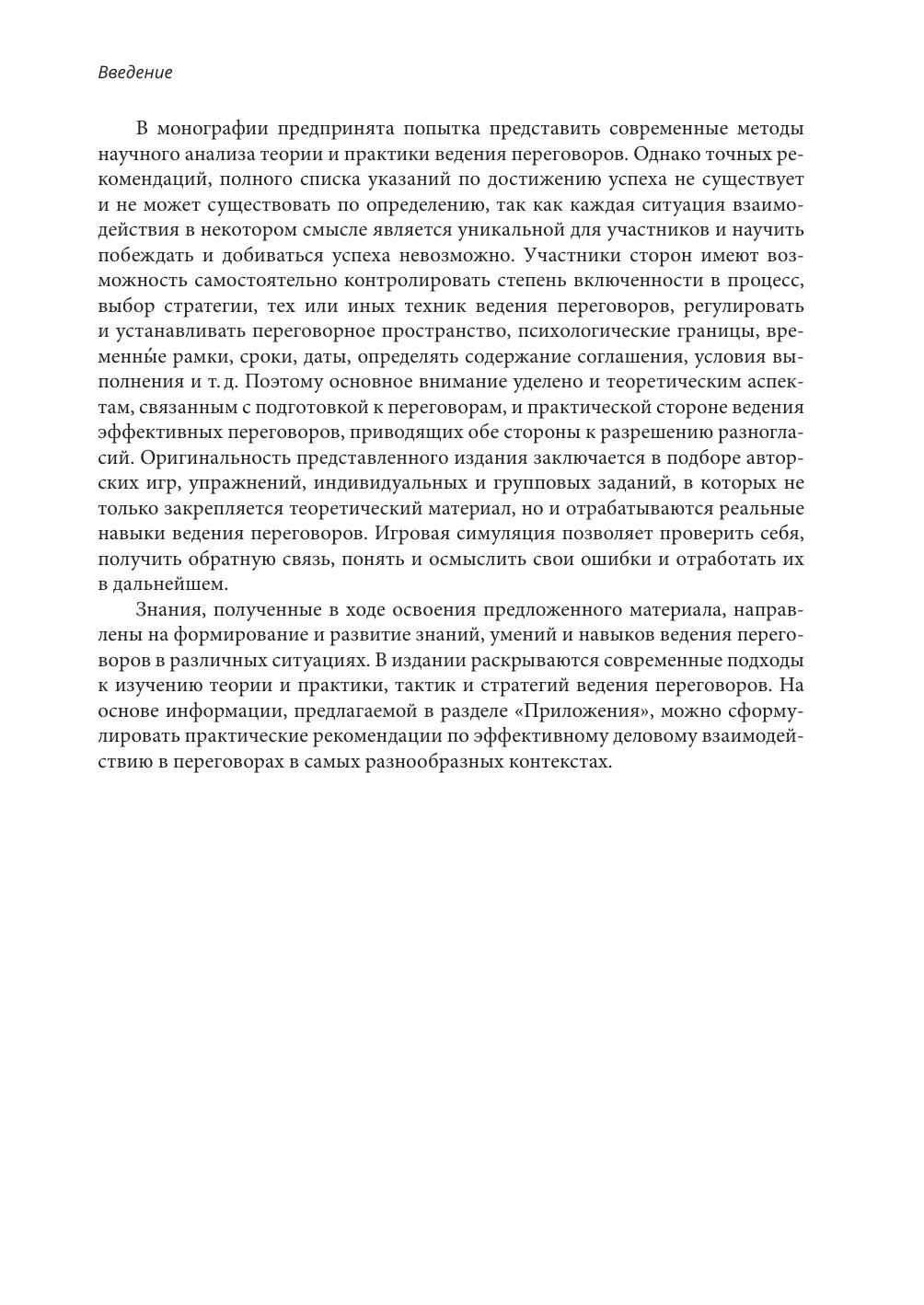 Представленное издание посвящено одному из самых актуальных и востребованных в современном обществе направлений - психологии переговоров. В монографии последовательно и структурно раскрываются теоретические основы переговоров и практические подходы к их ведению. Материал изложен в доступной и наглядной форме, что позволяет не только привлечь внимание читателей, но и вовлечь их в решение интересных авторских кейсов, выполнение интерактивных заданий, поиск ответов на сложные и неоднозначные вопросы. Адресовано широкому кругу читателей, включая всех тех, кто профессионально интересуется данной тематикой - психологов, социологов, конфликтологов, политологов, этнологов.