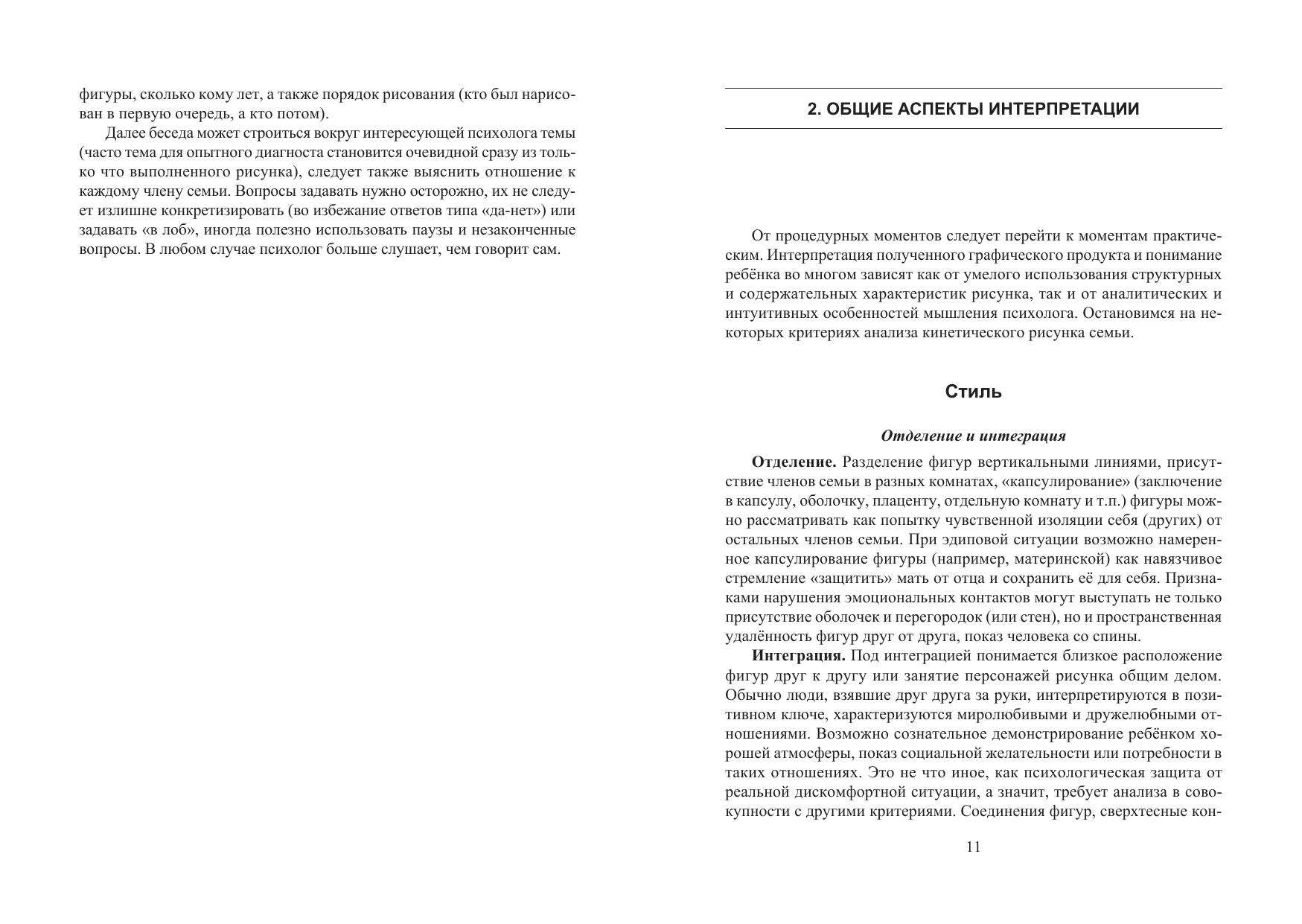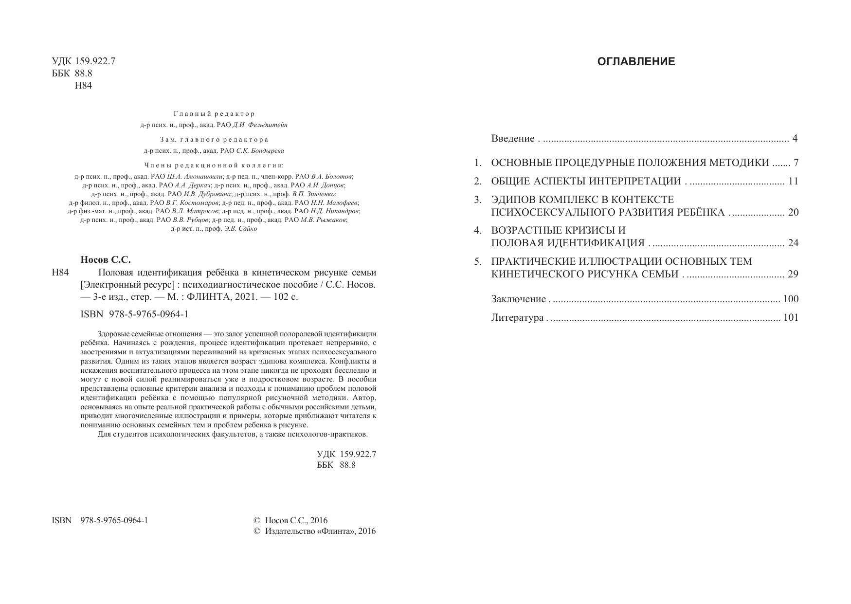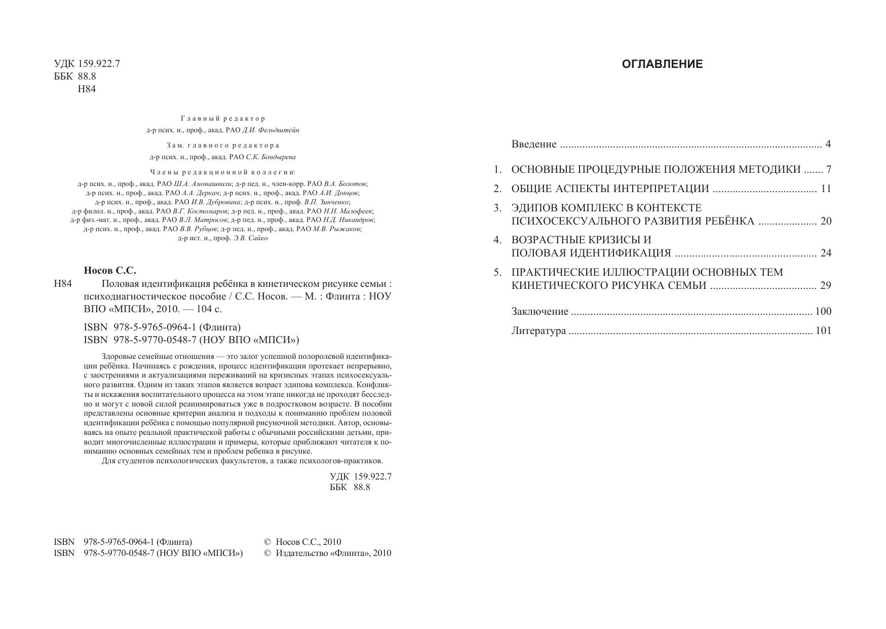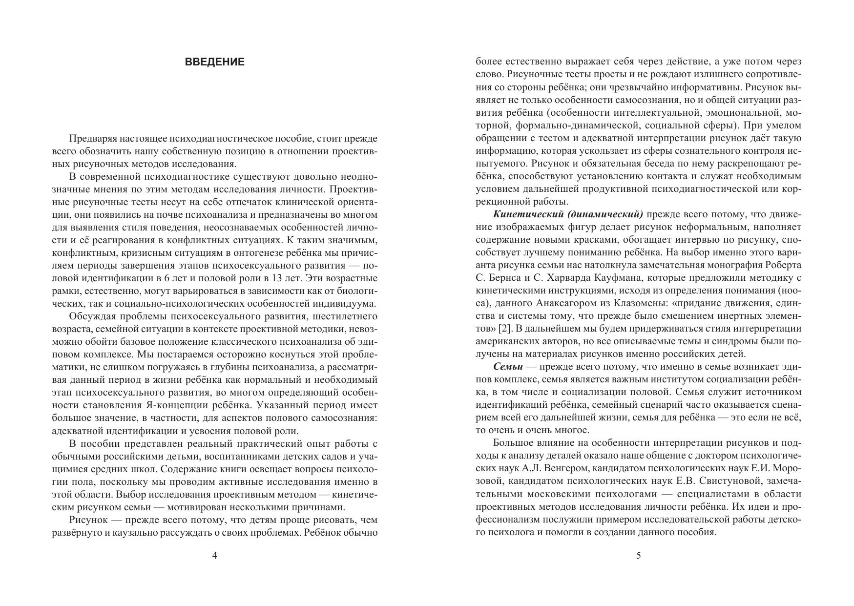 Здоровые семейные отношения — это залог успешной полоролевой идентификации ребёнка. Начинаясь с рождения, процесс идентификации протекает непрерывно, с заострениями и актуализациями переживаний на кризисных этапах психосексуального развития. Одним из таких этапов является возраст эдипова комплекса. Конфликты и искажения воспитательного процесса на этом этапе никогда не проходят бесследно и могут с новой силой реанимироваться уже в подростковом возрасте. В пособии представлены основные критерии анализа и подходы к пониманию проблем половой идентификации ребёнка с помощью популярной рисуночной методики. Автор, основываясь на опыте реальной практической работы с обычными российскими детьми, приводит многочисленные иллюстрации и примеры, которые приближают читателя к пониманию основных семейных тем и проблем ребенка в рисунке. Для студентов психологических факультетов, а также психологов-практиков.