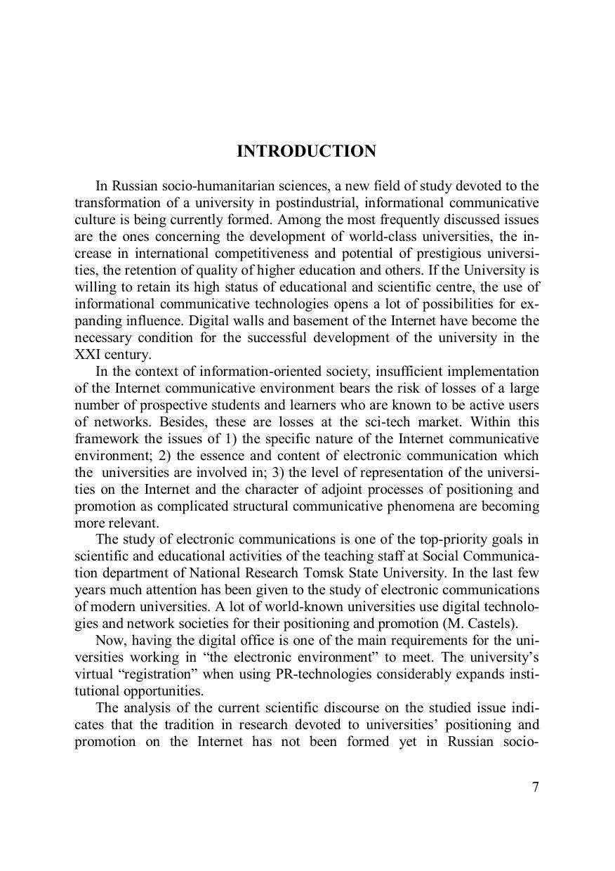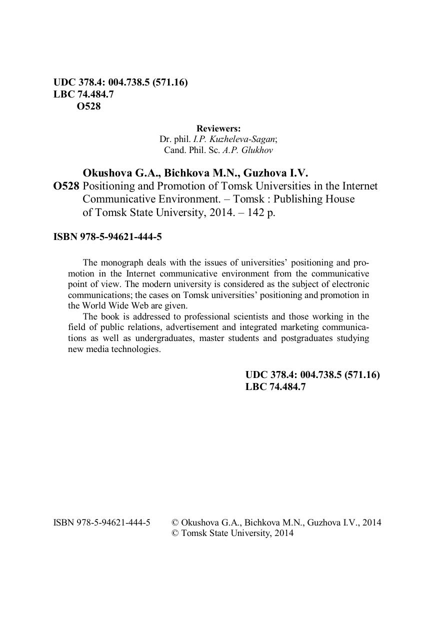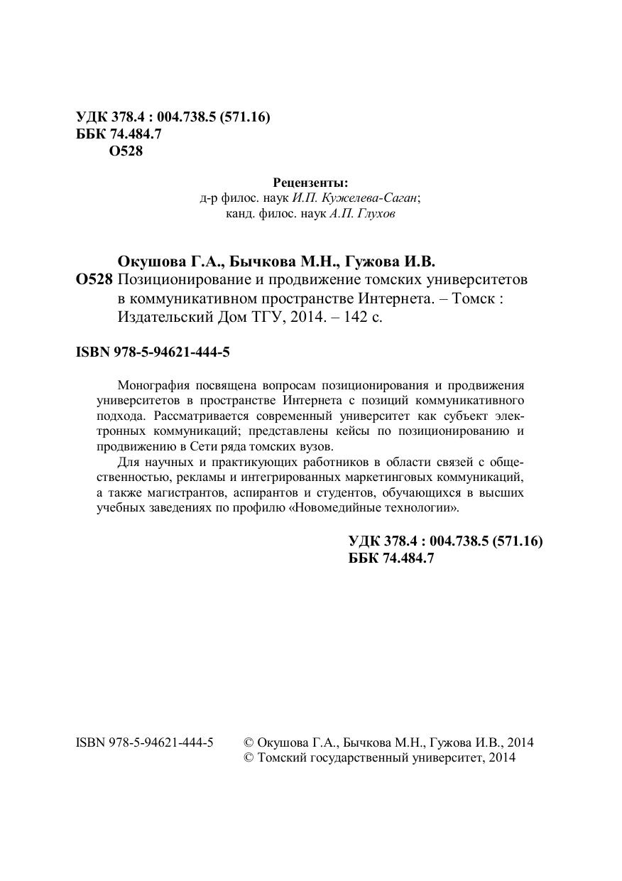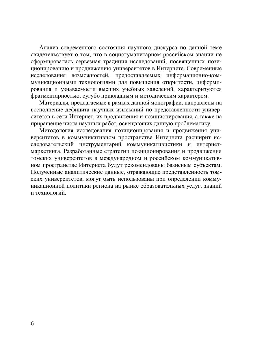 Монография посвящена вопросам позиционирования и продвижения университетов в пространстве Интернета с позиций коммуникативного подхода. Рассматривается современный университет как субъект электронных коммуникаций, представлены кейсы по позиционированию и продвижению в Сети ряда томских вузов. Для научных и практикующих работников в области связей с общественностью, рекламы и интегрированных маркетинговых коммуникаций, а также магистрантов, аспирантов и студентов, обучающихся в высших учебных заведениях по профилю «Новомедийные технологии».