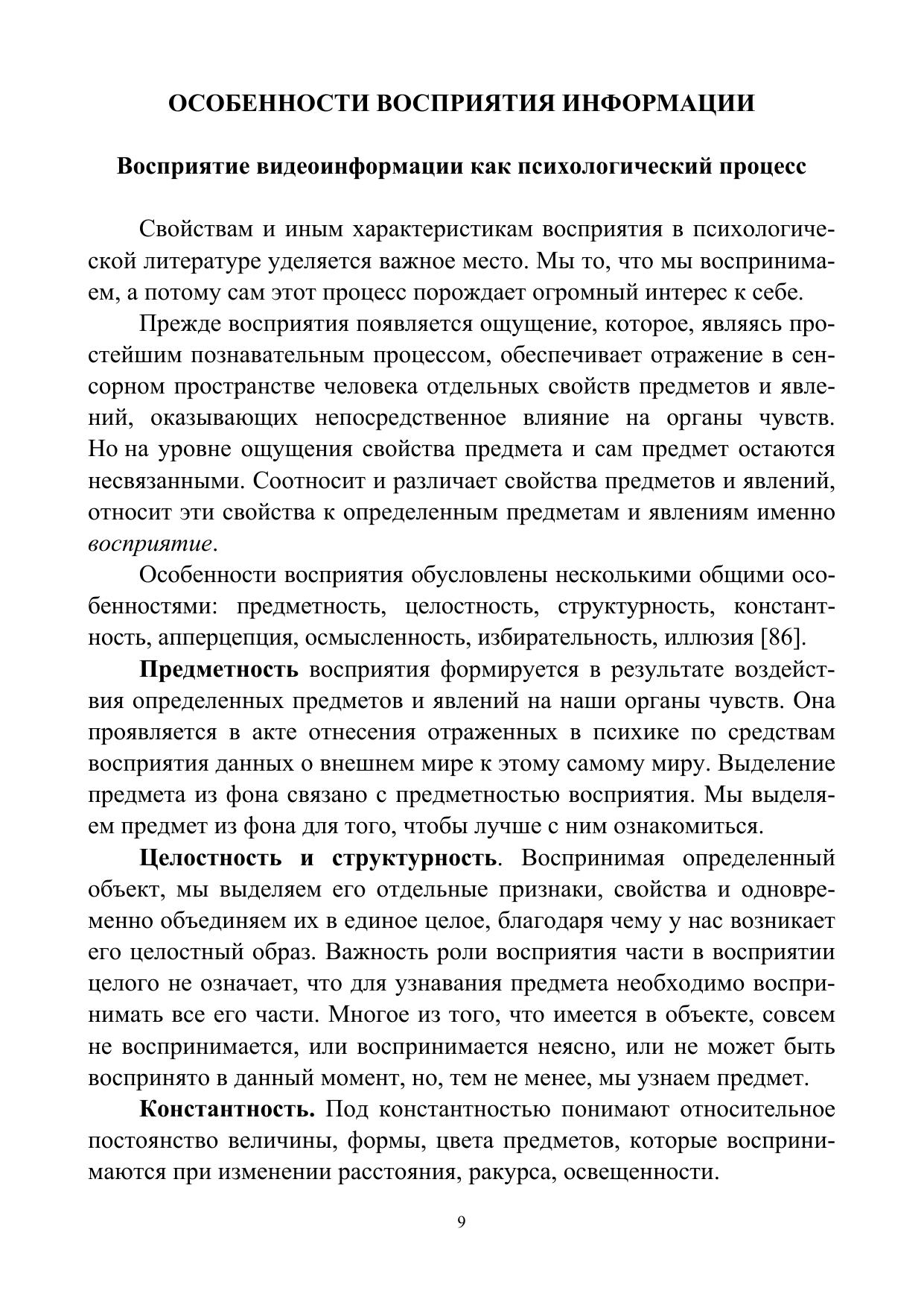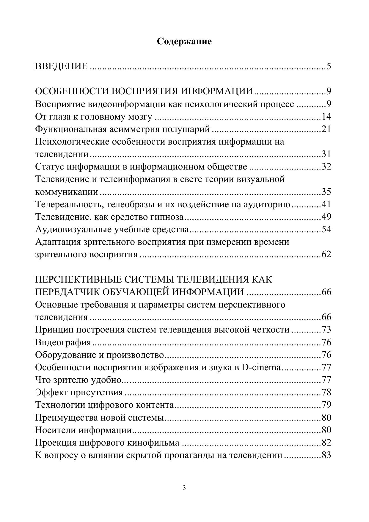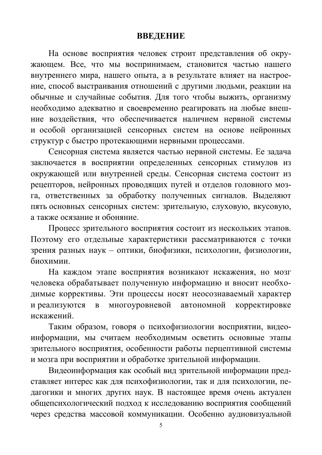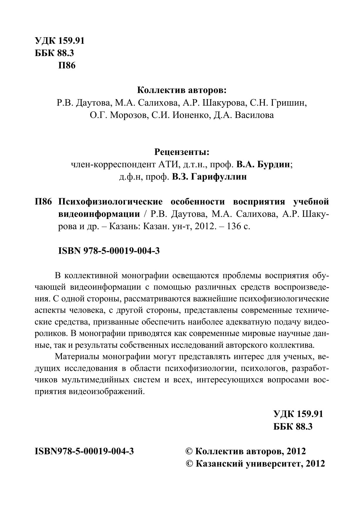 В коллективной монографии освещаются проблемы восприятия обучающей видеоинформации с помощью различных средств воспроизведения. С одной стороны, рассматриваются важнейшие психофизиологические аспекты человека, с другой стороны, представлены современные технические средства, призванные обеспечить наиболее адекватную подачу видеороликов. В монографии приводятся как современные мировые научные данные, так и результаты собственных исследований авторского коллектива. Материалы монографии могут представлять интерес для ученых, ведущих исследования в области психофизиологии, психологов, разработчиков мультимедийных систем и всех, интересующихся вопросами восприятия видеоизображений.