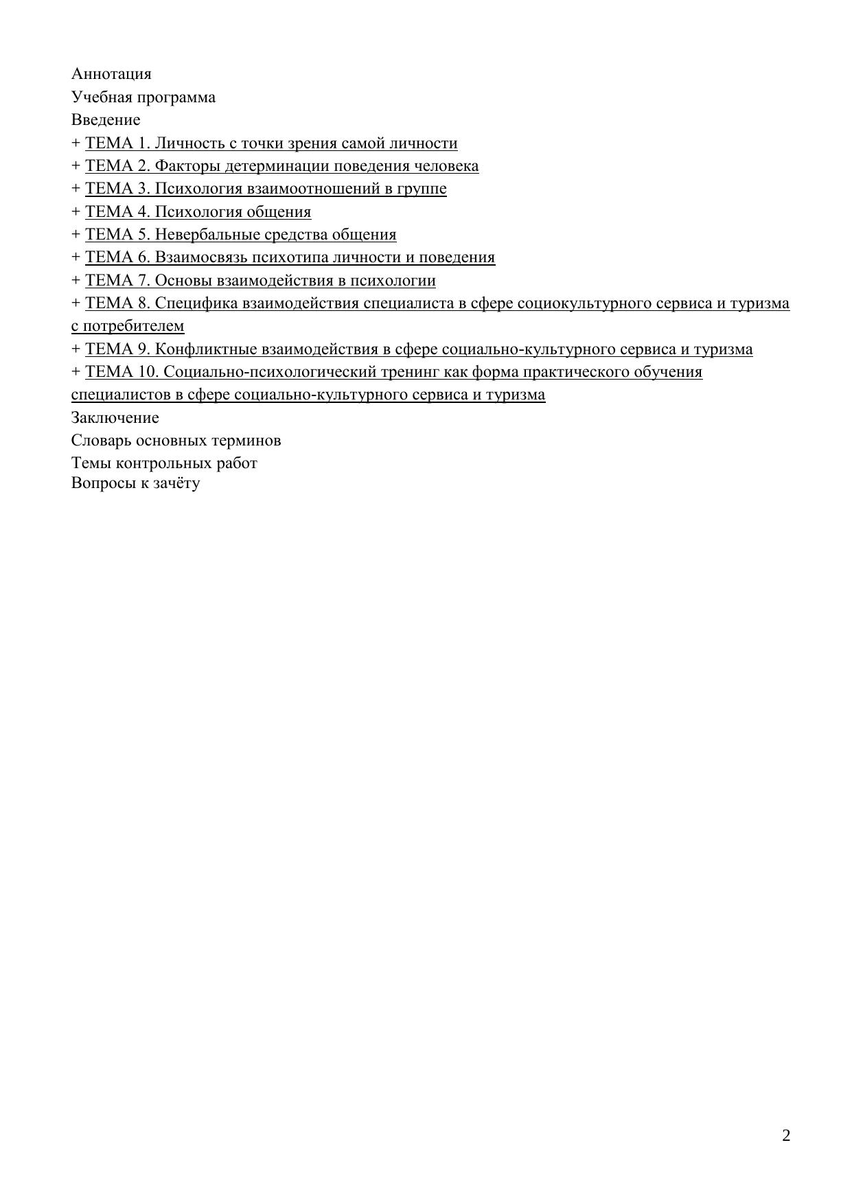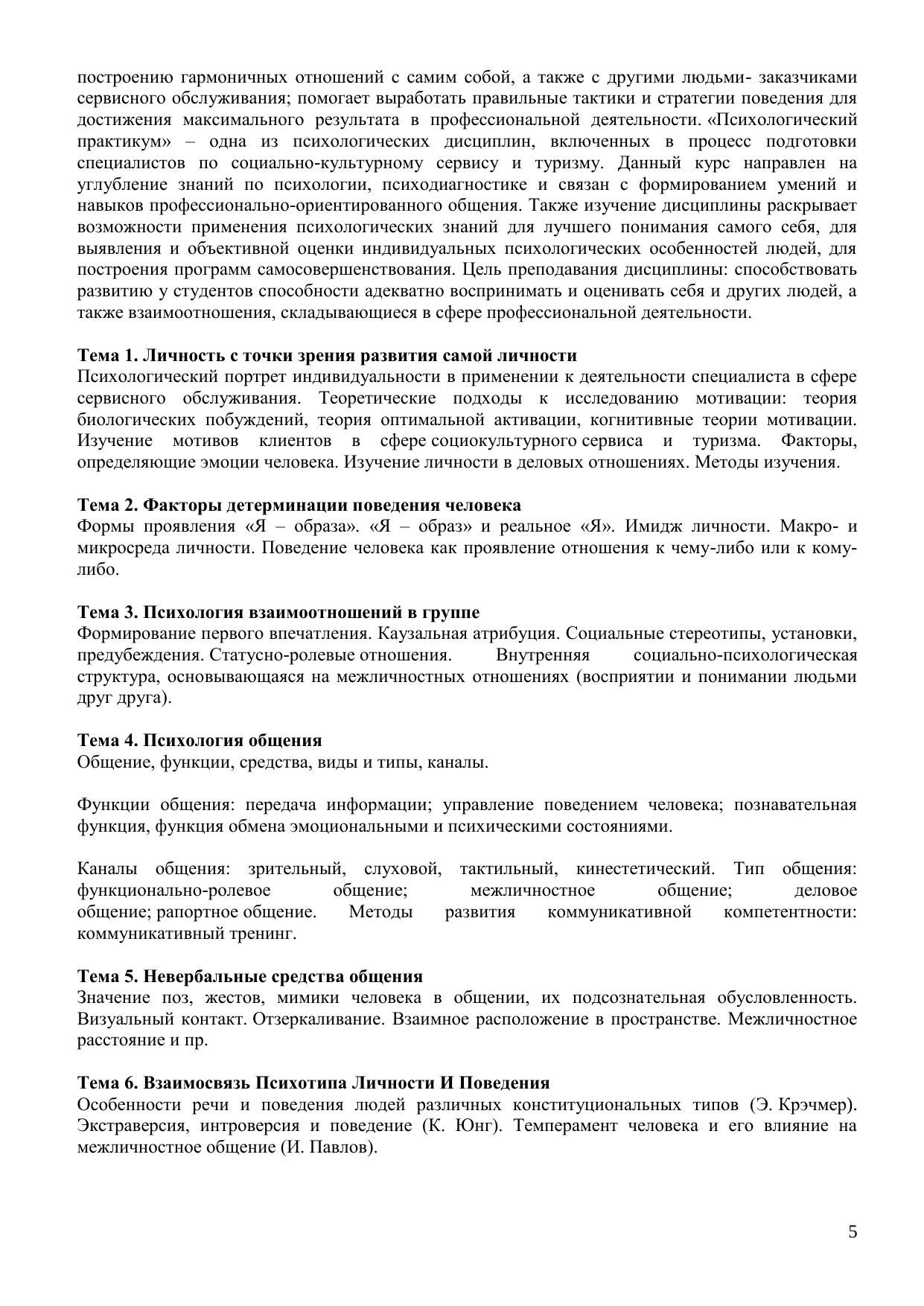 Электронное пособие знакомит студентов с психологическими аспектами, такими как индивидуальные особенности личности, самопознание, общение, управление поведением, психическое здоровье и др. Обучает умению использовать психодиагностические методики формирует навыки построения гармоничных отношений с самим собой, а также с другими людьми - заказчиками сервисного обслуживания помогает выработать правильные тактики и стратегии поведения для достижения максимального результата в деятельности. Пособие предназначено для студентов, обучающихся по специальности 100103 «Социально-культурный сервис и туризм». Электронное учебное пособие для дистанционного обучения