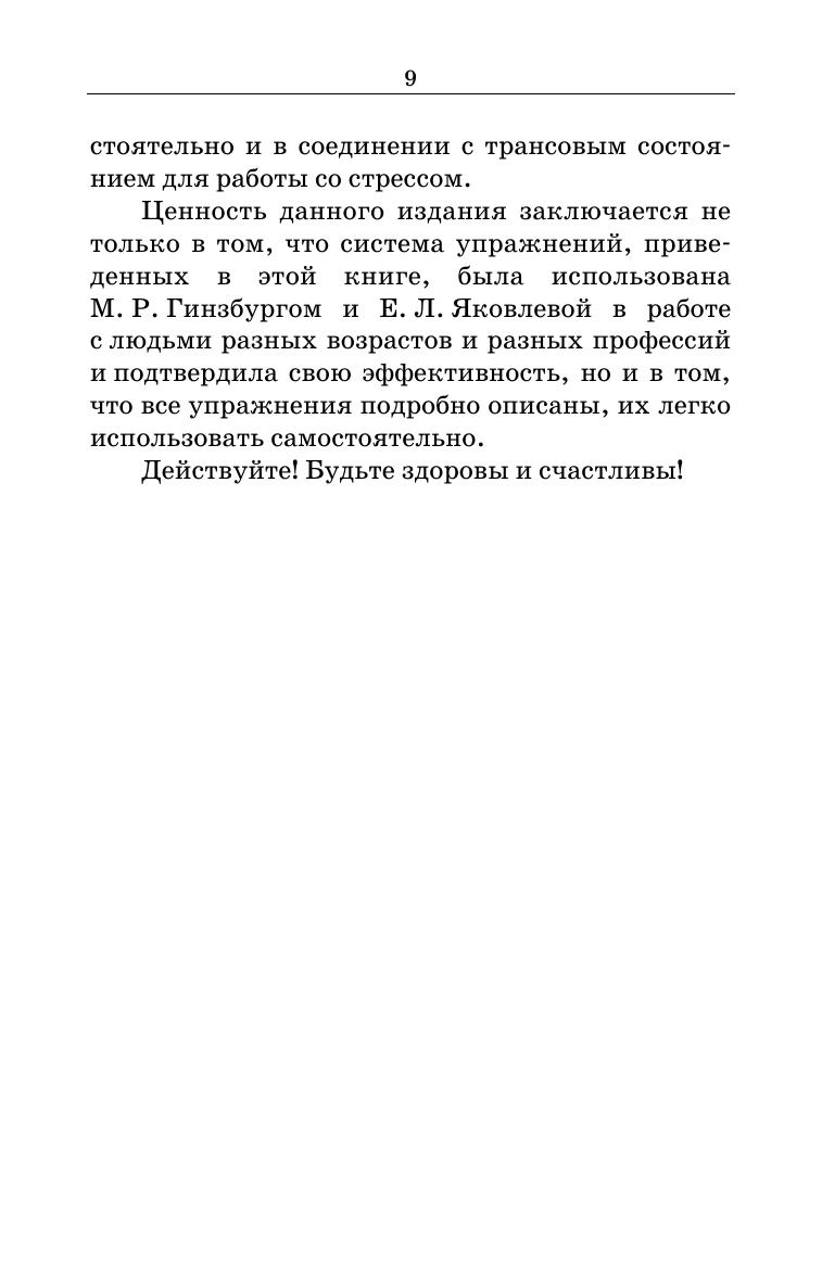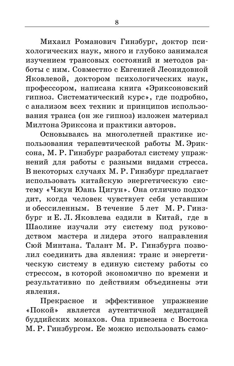В учебном пособии известных российских психологов М. Р. Гинзбурга и Е. Л. Яковлевой представлен опыт терапевтической работы авторов по использованию специальных методик в борьбе со стрессовыми состояниями, которые стали постоянными спутниками жизни современного человека. Основываясь на многолетней практике использования терапевтической методики М. Эриксона, а также китайской системы «Чжун Юань Цигун», М. Р. Гинзбург разработал собственную систему упражнений для преодоления различных видов стресса, которую изложил в данной книге. Ценность этой системы заключается в том, что она подходит для работы с людьми разных возрастов и разных профессий, а также в том, что она на практике подтвердила свою эффективность. Учебное пособие можно использовать в высших учебных заведениях, осуществляющих профессиональную подготовку психологов, медицинских и социальных работников, изучающих курсы «Общей психологии» и «Психологии личности», особенно при проведении практических занятий. Возможно использование в системе дополнительного образования. Кроме того, все упражнения системы так подробно и доступно описаны, что их можно легко применять самостоятельно.