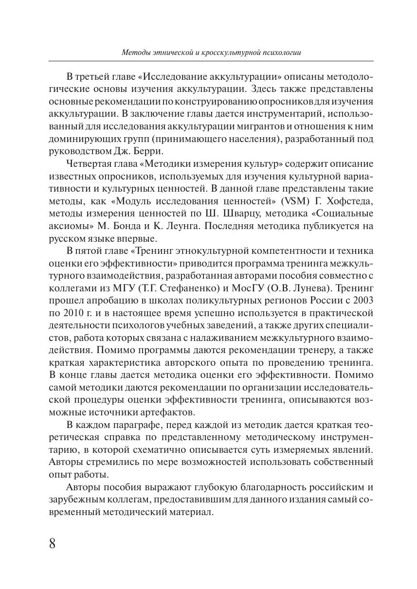 В учебном пособии «Методы этнической и кросскультурной психологии» представлены как достаточно известные, так и относительно новые исследовательские методики, используемые в данной научной области. Помимо методического инструментария пособие включает описание активных методов повышения этнокультурной компетентности, применяемых, в частности, в тренинге этнокультурной компетентности, программа которого также приводится в этом издании. Для преподавателей, ведущих практические занятия по этнической и кросскультурной психологии, студентов-психологов, специалистов в области социологии, педагогики, конфликтологии, а также всех, кто интересуется проблематикой этничности и межэтнических отношений.
