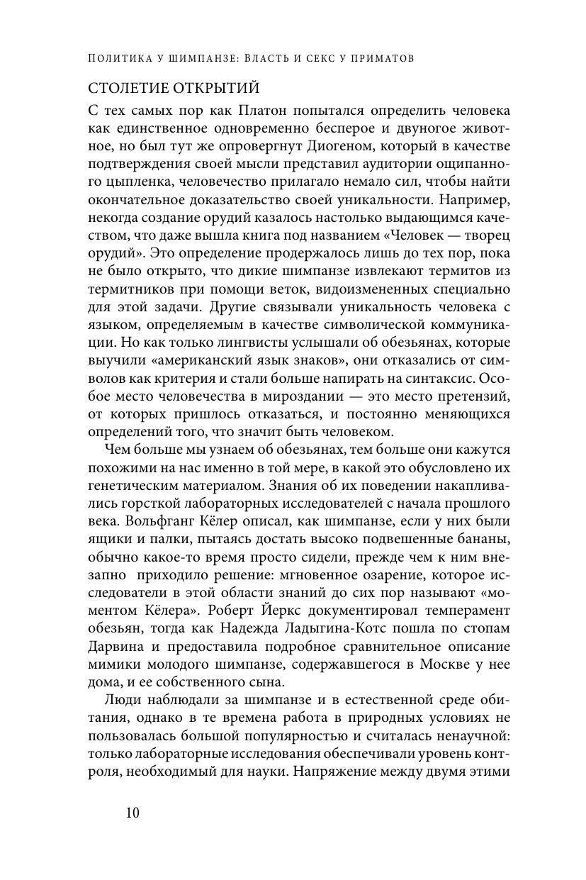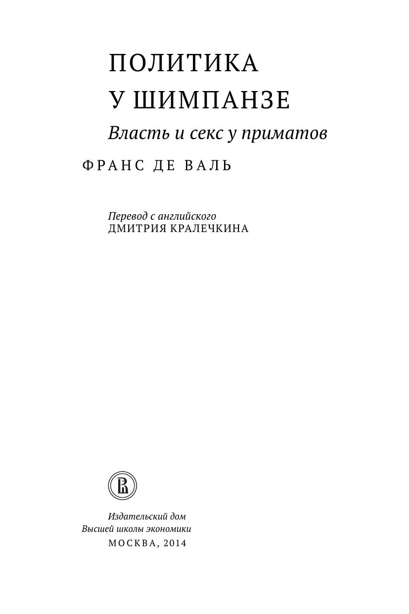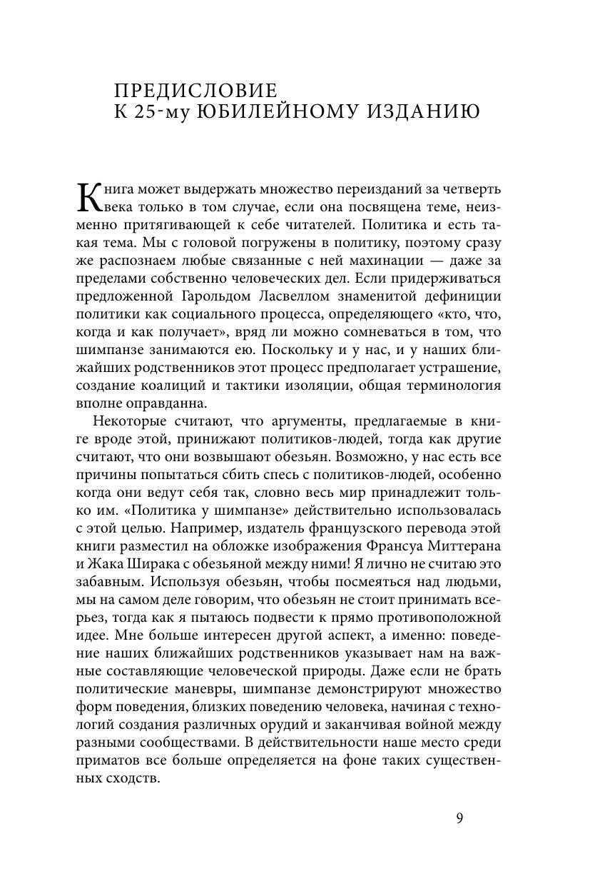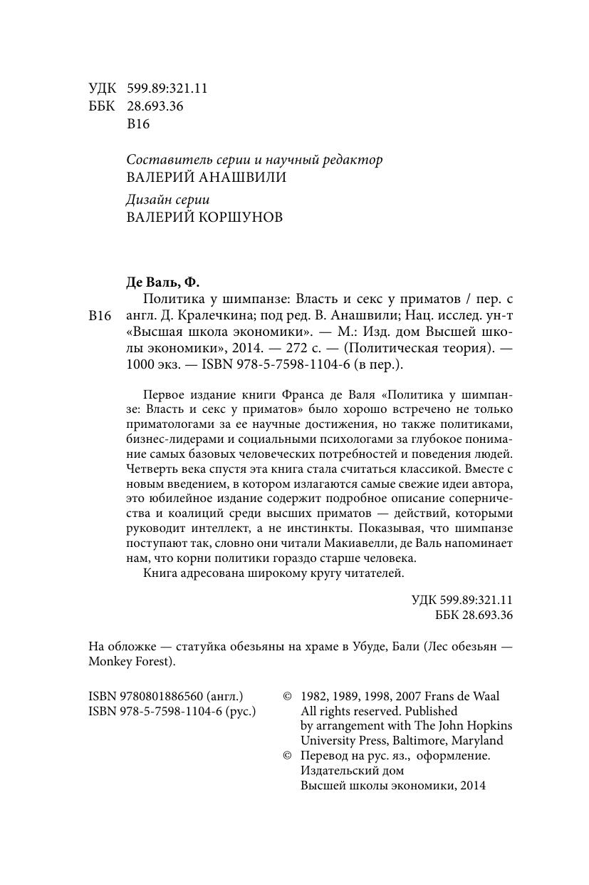 Первое издание книги Франса де Валя «Политика у шимпанзе: Власть и секс у приматов» было хорошо встречено не только приматологами за ее научные достижения, но также политиками, бизнес-лидерами и социальными психологами за глубокое понимание самых базовых человеческих потребностей и поведения людей. Четверть века спустя эта книга стала считаться классикой. Вместе с новым введением, в котором излагаются самые свежие идеи автора, это юбилейное издание содержит подробное описание соперничества и коалиций среди высших приматов — действий, которыми руководит интеллект, а не инстинкты. Показывая, что шимпанзе поступают так, словно они читали Макиавелли, де Валь напоминаем нам, что корни политики гораздо старше человека. Книга адресована широкому кругу читателей.
