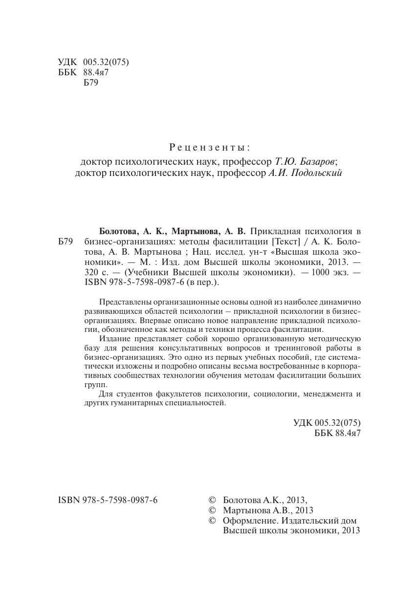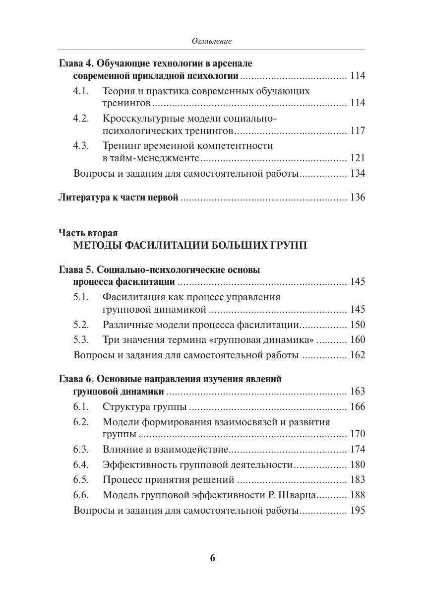 Представлены организационные основы одной из наиболее динамично развивающихся областей психологии – прикладной психологии в бизнес-организациях. Впервые описано новое направление прикладной психологии, обозначенное как методы и техники процесса фасилитации. Издание представляет собой хорошо организованную методическую базу для решения консультативных вопросов и тренинговой работы в бизнес-организациях. Это одно из первых учебных пособий, где систематически изложены и подробно описаны весьма востребованные в корпоративных сообществах технологии обучения методам фасилитации больших групп. Для студентов факультетов психологии, социологии, менеджмента и других гуманитарных специальностей.