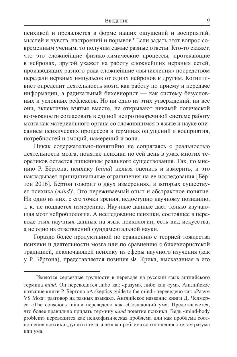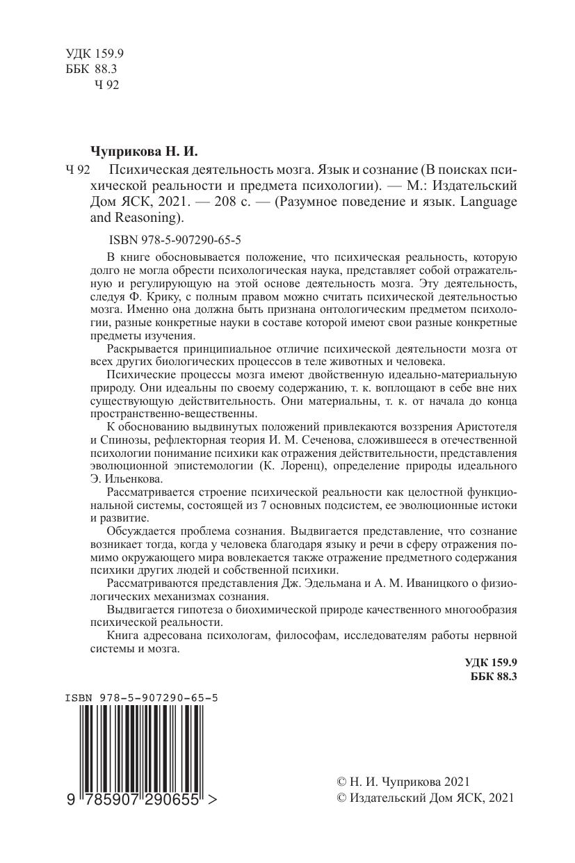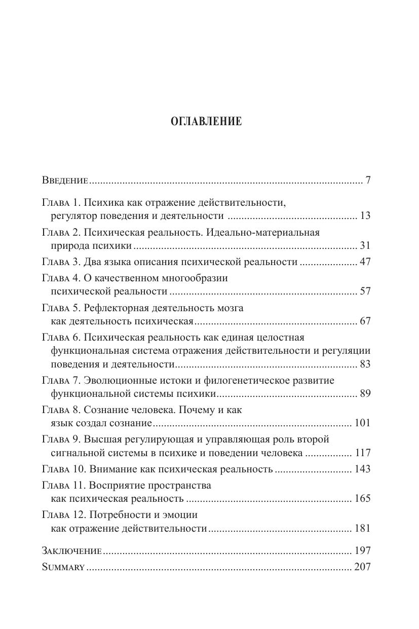 В книге обосновывается положение, что психическая реальность, которую долго не могла обрести психологическая наука, представляет собой отражательную и регулирующую на этой основе деятельность мозга. Эту деятельность, следуя Ф. Крику, с полным правом можно считать психической деятельностью мозга. Именно она должна быть признана онтологическим предметом психологии, разные конкретные науки в составе которой имеют свои разные конкретные предметы изучения. Раскрывается принципиальное отличие психической деятельности мозга от всех других биологических процессов в теле животных и человека. Психические процессы мозга имеют двойственную идеально-материальную природу. Они идеальны по своему содержанию, т. к. воплощают в себе вне них существующую действительность. Они материальны, т. к. от начала до конца пространственно-вещественны. К обоснованию выдвинутых положений привлекаются воззрения Аристотеля и Спинозы, рефлекторная теория И. М. Сеченова, сложившееся в отечественной психологии понимание психики как отражения действительности, представления эволюционной эпистемологии (К. Лоренц), определение природы идеального Э. Ильенкова. Рассматривается строение психической реальности как целостной функциональной системы, состоящей из 7 основных подсистем, ее эволюционные истоки и развитие. Обсуждается проблема сознания. Выдвигается представление, что сознание возникает тогда, когда у человека благодаря языку и речи в сферу отражения помимо окружающего мира вовлекается также отражение предметного содержания психики других людей и собственной психики. Рассматриваются представления Дж. Эдельмана и А. М. Иваницкого о физиологических механизмах сознания. Выдвигается гипотеза о биохимической природе качественного многообразия психической реальности. Книга адресована психологам, философам, исследователям работы нервной системы и мозга.