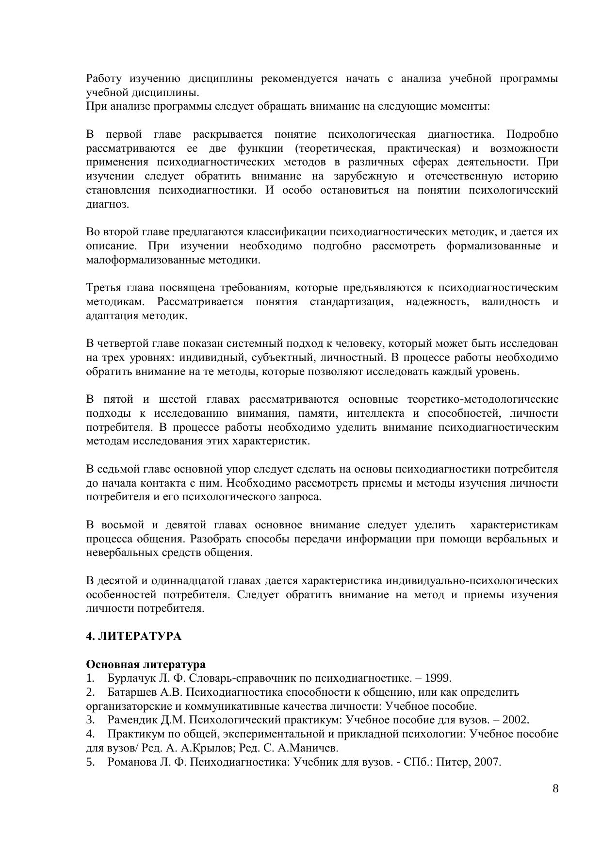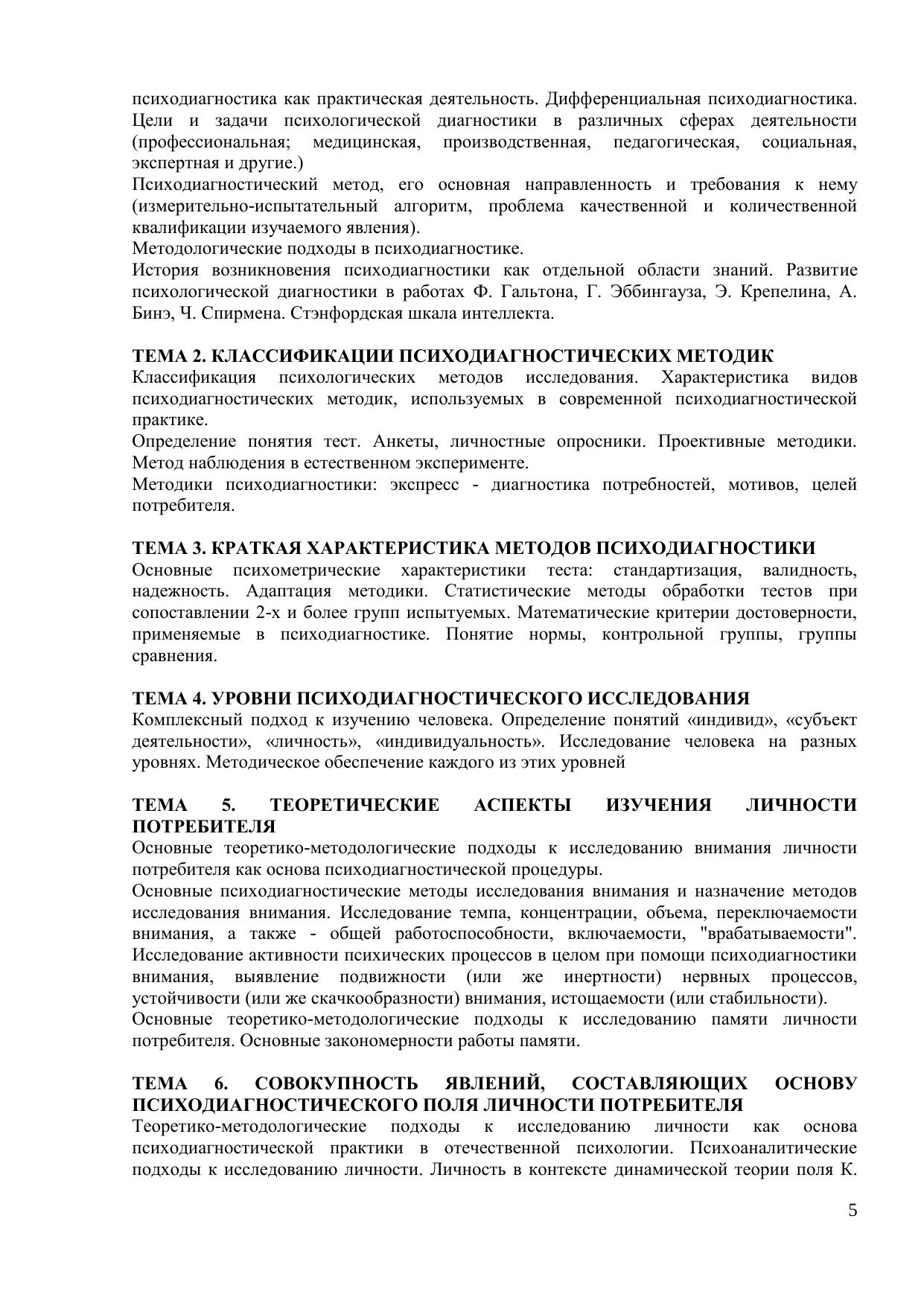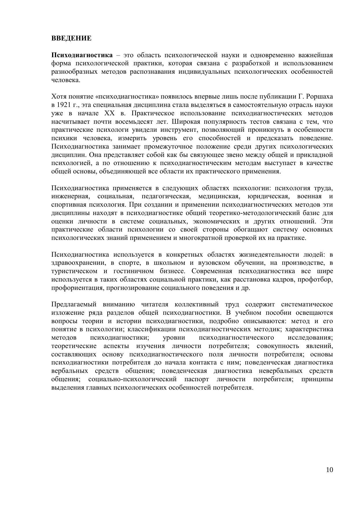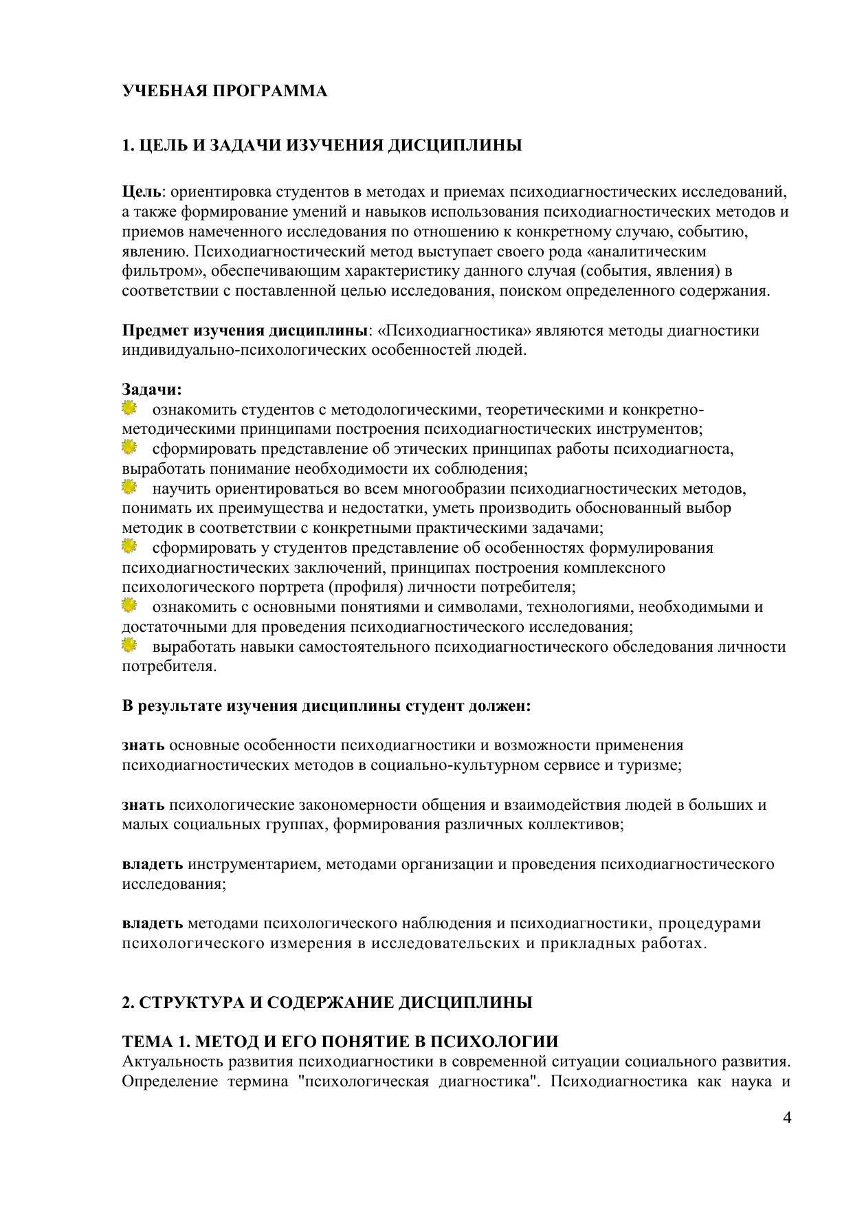Курс знакомит студентов с теоретическими основами психодиагностики, методологическими, теоретическими и конкретно-методическими принципами построения психодиагностических инструментов формирует представления об этических принципах работы психодиагноста. Курс помогает студентам ориентироваться во всем многообразии психодиагностических методов, понять их преимущества и недостатки, научиться производить обоснованный выбор методик в соответствии с конкретными практическими задачами, вырабатывает умения постановки психодиагностических задач и комплектования психодиагностических батарей. Также курс формирует у студентов представление об особенностях формулирования психодиагностических заключений, принципах построения комплексного психологического портрета (профиля) личности потребителя и о психологическом диагнозе вырабатывает навыки самостоятельного психодиагностического обследования потребителя. Курс закладывает основы профессиональных знаний и мотивационную базу для осмысленного восприятия и усвоения курса «Психологический практикум». В программе учитывается, что социально-культурный сервис и туризм относится к сферам деятельности, в которых невозможно обойтись без знаний психологии, поэтому необходимо освоение и развитие психологического мышления и знания методов исследования личности. Особенностью этого курса является комплексный, интегральный подход к исследованию личности. Электронное учебное пособие для дистанционного обучения