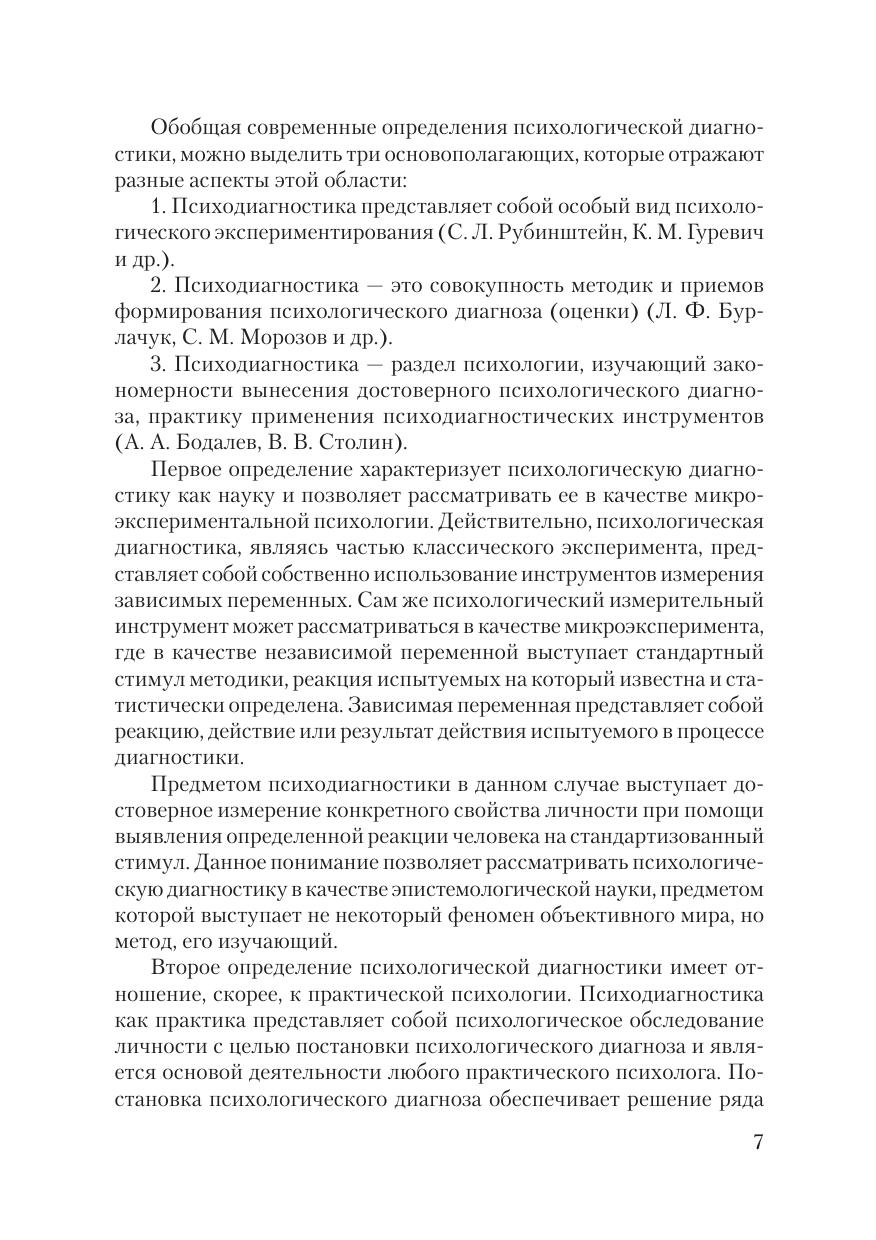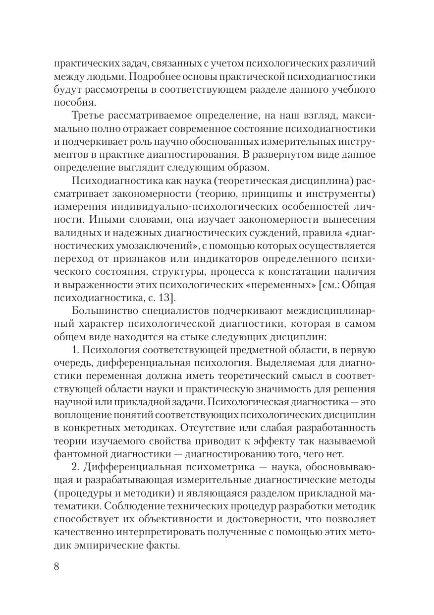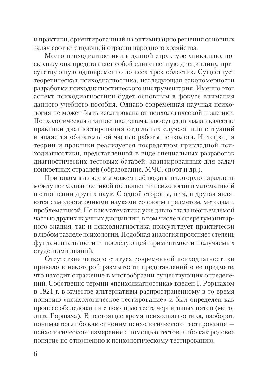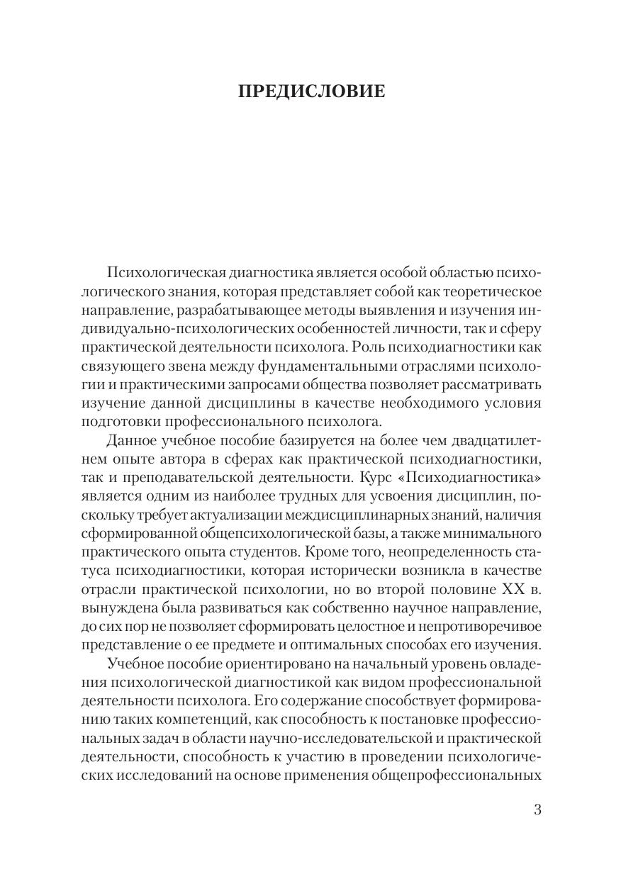 В учебном пособии рассматриваются основные вопросы психологической диагностики как научной дисциплины и практической деятельности психолога. Представлены психометрические модели измеряемых свойств, базовые психометрические характеристики основных групп методик и рекомендации относительно правил работы с ними, в том числе сформулированы принципы оценки диагностического инструментария с точки зрения профессиональных задач психолога.