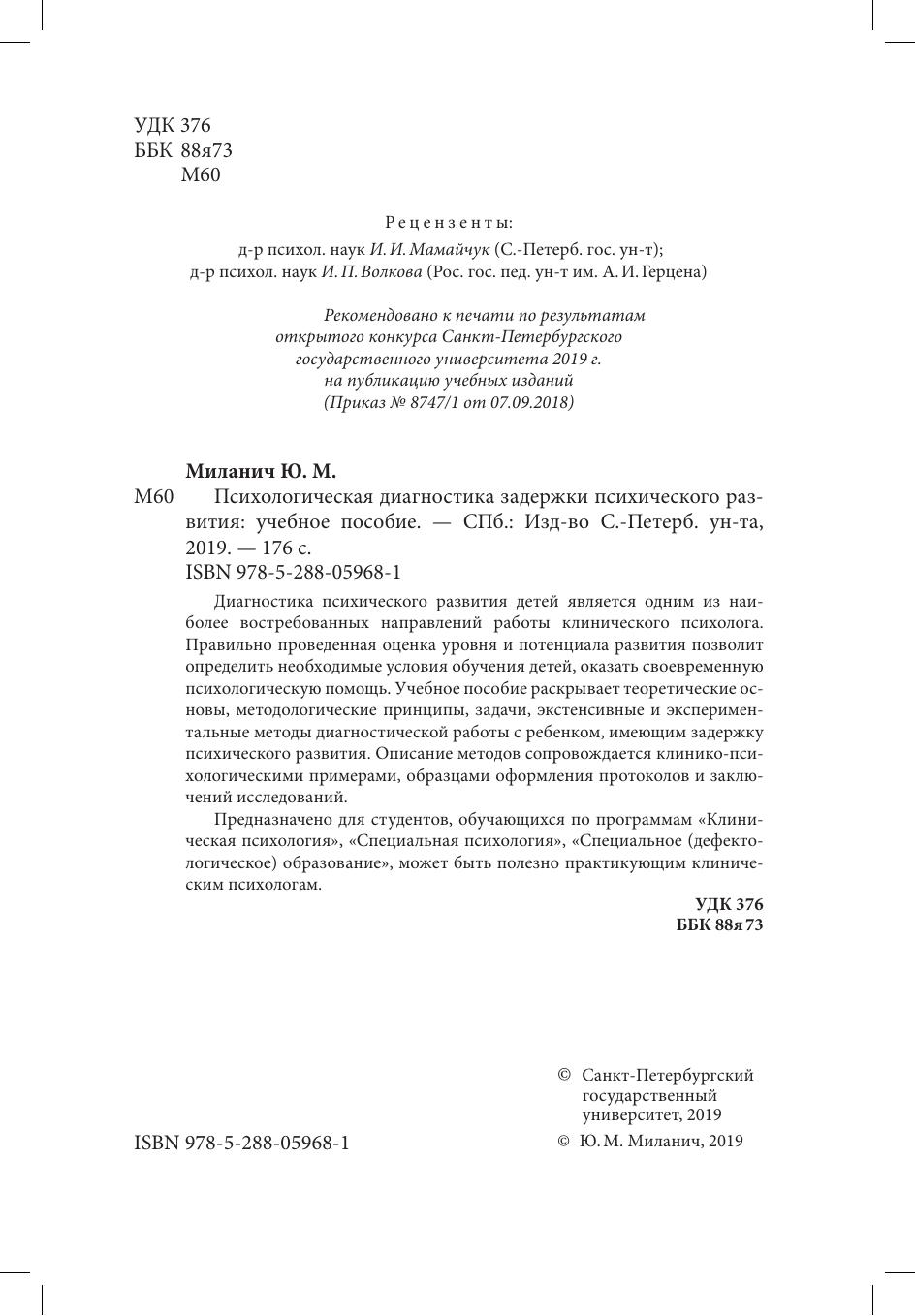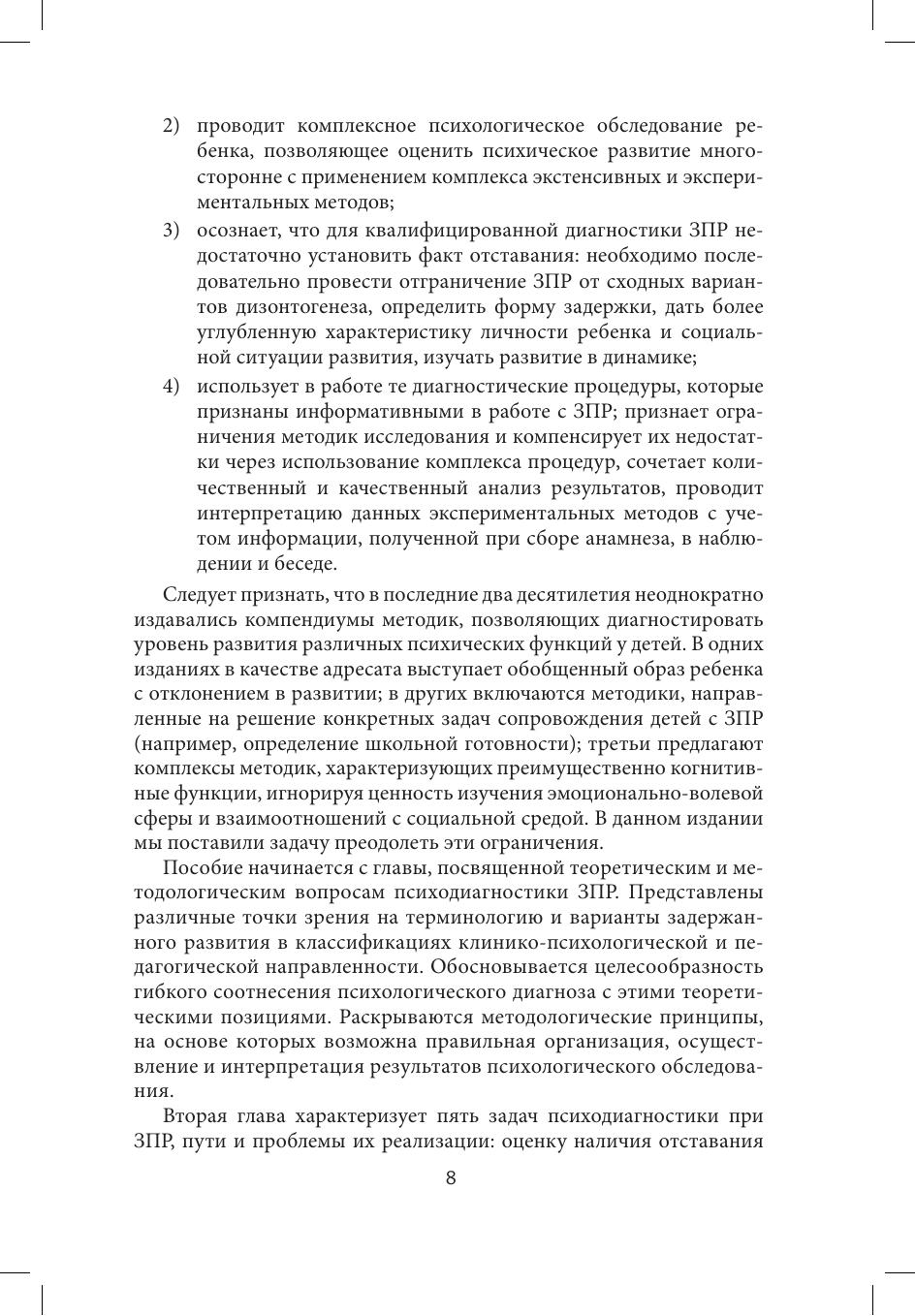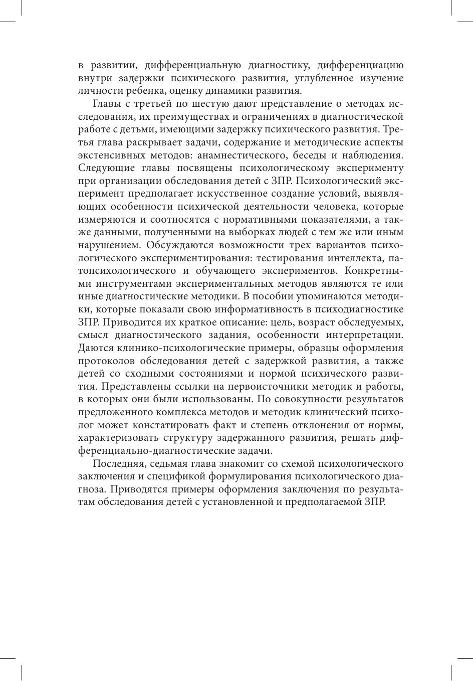Диагностика психического развития детей является одним из наиболее востребованных направлений работы клинического психолога. Правильно проведенная оценка уровня и потенциала развития позволит определить необходимые условия обучения детей, оказать своевременную психологическую помощь. Учебное пособие раскрывает теоретические основы, методологические принципы, задачи, экстенсивные и экспериментальные методы диагностической работы с ребенком, имеющим задержку психического развития. Описание методов сопровождается клиники-психологическими примерами, образцами оформления протоколов и заключений исследований.