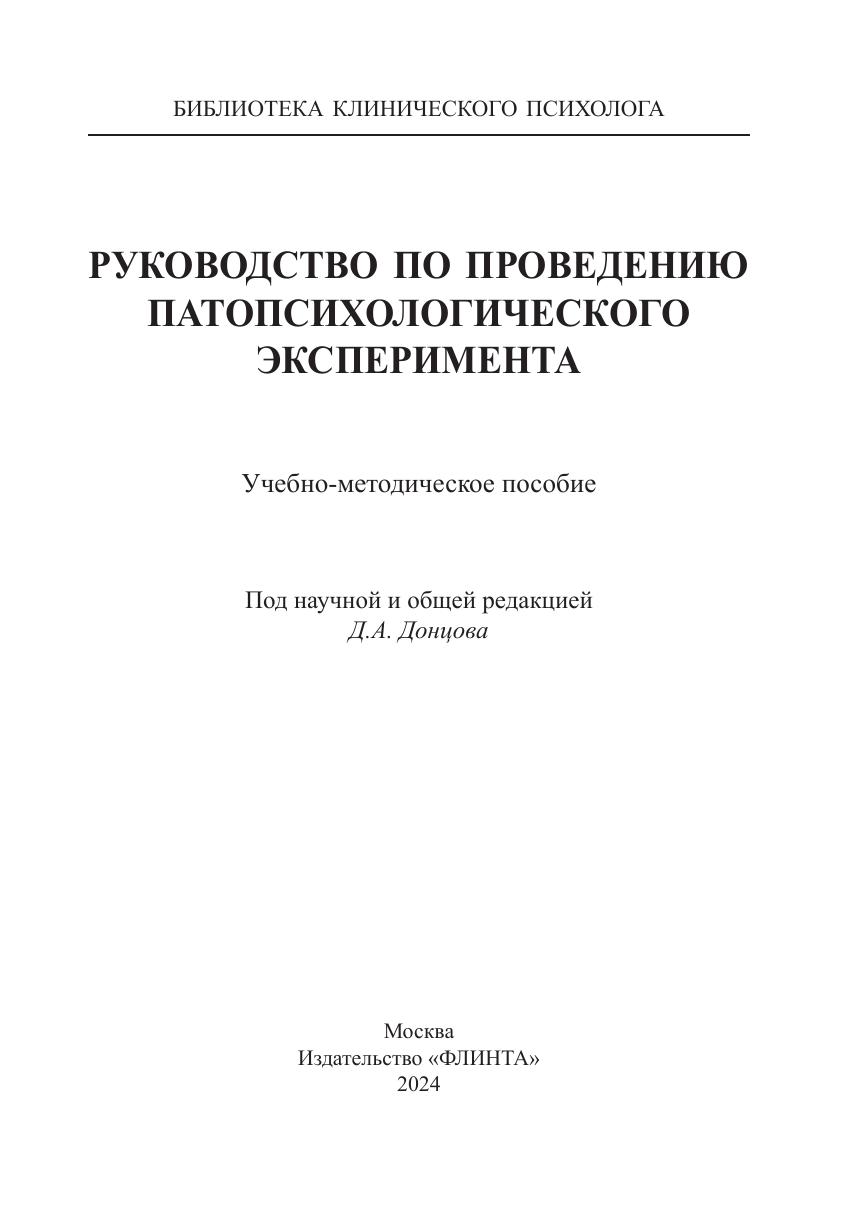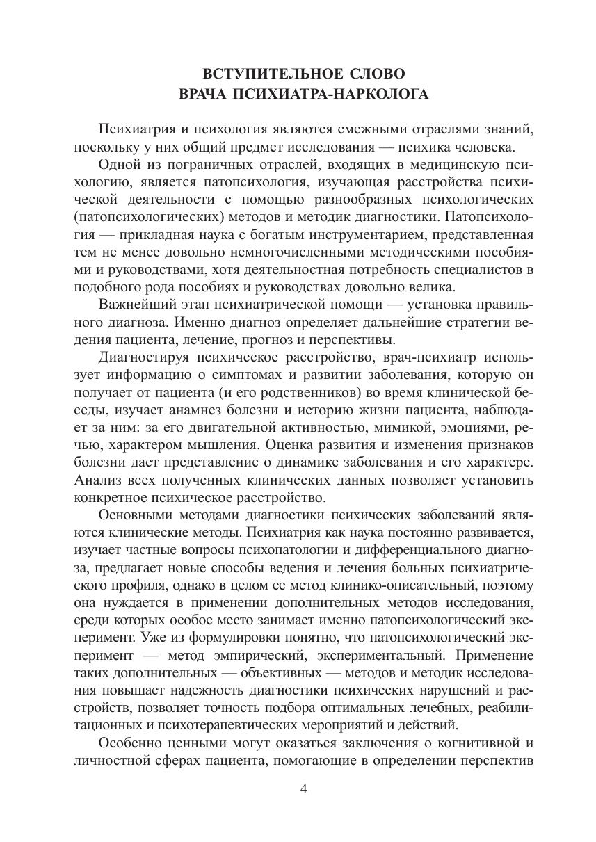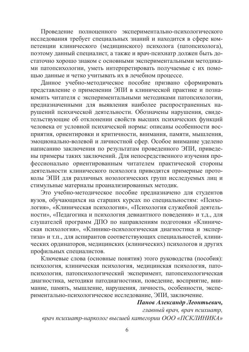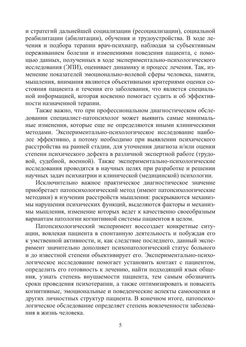 Пособие призвано сформировать представление о применении экспериментально-психологического исследования (ЭПИ) в клинической практике и познакомить читателя с экспериментальными методиками патопсихологии, предназначенными для выявления наиболее распространенных нарушений психической деятельности. Авторами обозначены нарушения, свидетельствующие об отклонении свойств высших психических функций человека от условной психической нормы: описаны особенности восприятия, ориентировки и критичности, внимания, памяти, мышления, эмоционально-волевой и личностной сфер. Особое внимание уделено написанию заключения по результатам проведенного ЭПИ, приведены примеры таких заключений. Для изучения практической стороны деятельности клинического психолога приводятся примерные протоколы ЭПИ для различных нозологических групп и стимульные материалы. Для студентов, обучающихся по специальностям: «Психология», «Клиническая психология», «Психология служебной деятельности», «Педагогика и психология девиантного поведения» и т.д., для слушателей программ ДПО, аспирантов, клинических ординаторов, медицинских (клинических) психологов и других профильных специалистов.