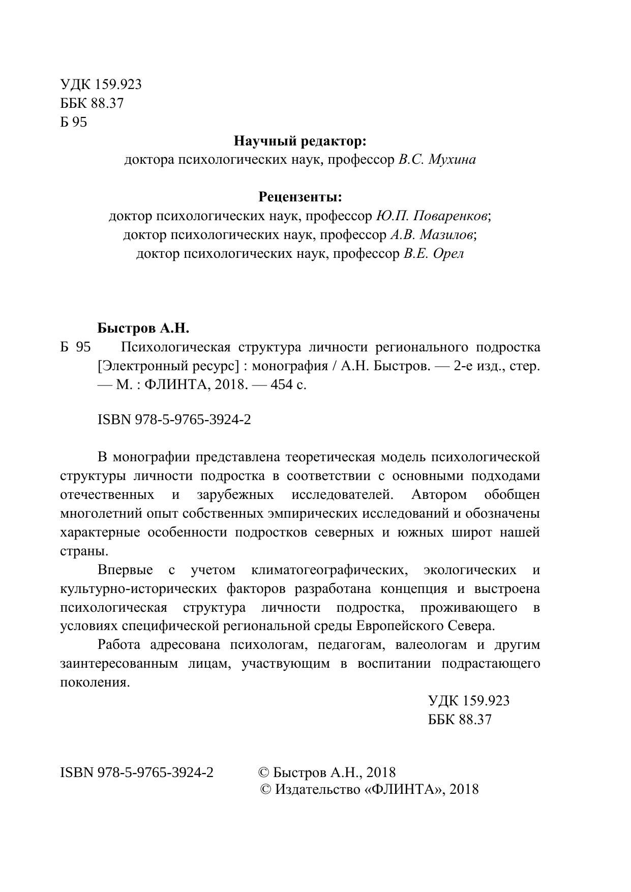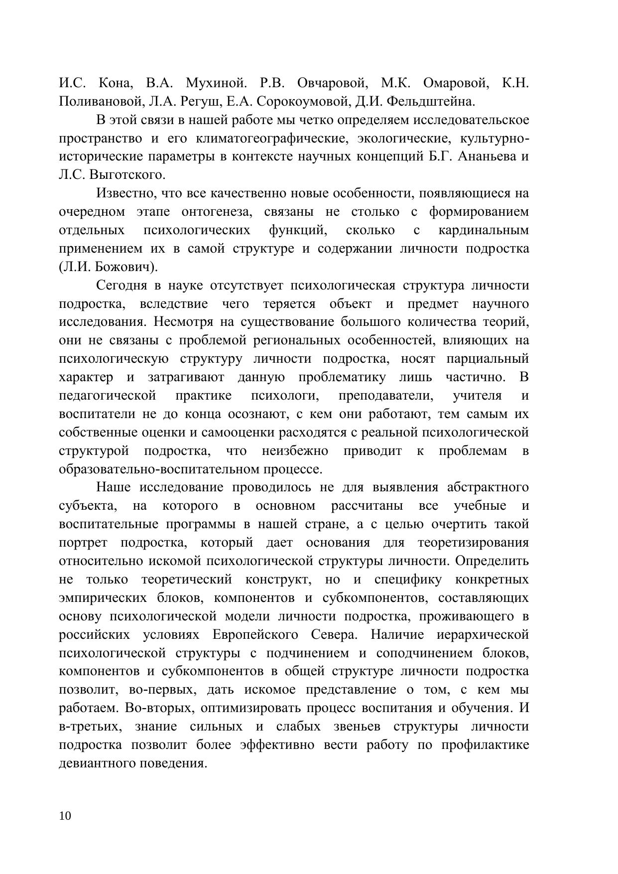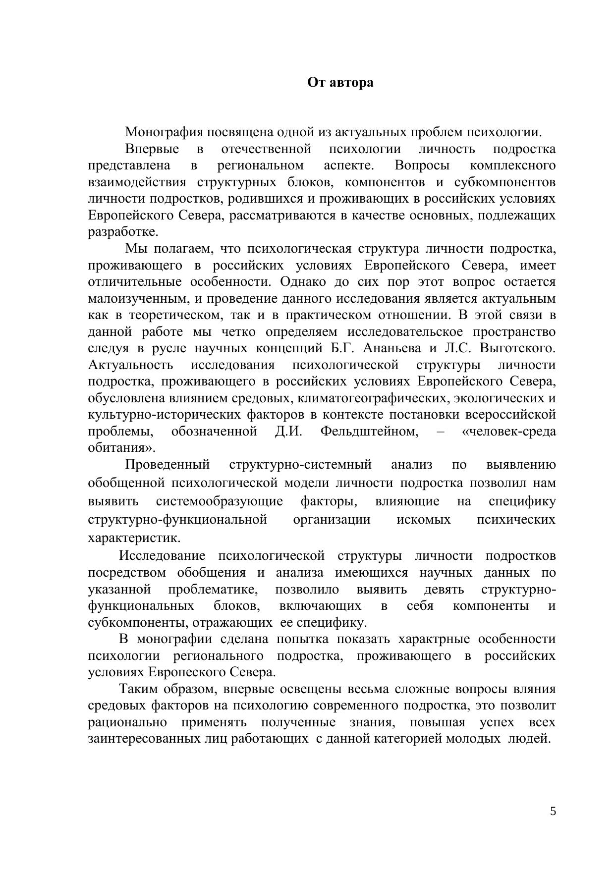 В монографии представлена теоретическая модель психологической структуры личности подростка в соответствии с основными подходами отечественных и зарубежных исследователей. Автором обобщен многолетний опыт собственных эмпирических исследований и обозначены характерные особенности подростков северных и южных широт нашей страны. Впервые с учетом климатогеографических, экологических и культурно-исторических факторов разработана концепция и выстроена психологическая структура личности подростка, проживающего в условиях специфической региональной среды Европейского Севера. Работа адресована психологам, педагогам, валеологам и другим заинтересованным лицам, участвующим в воспитании подрастающего поколения.