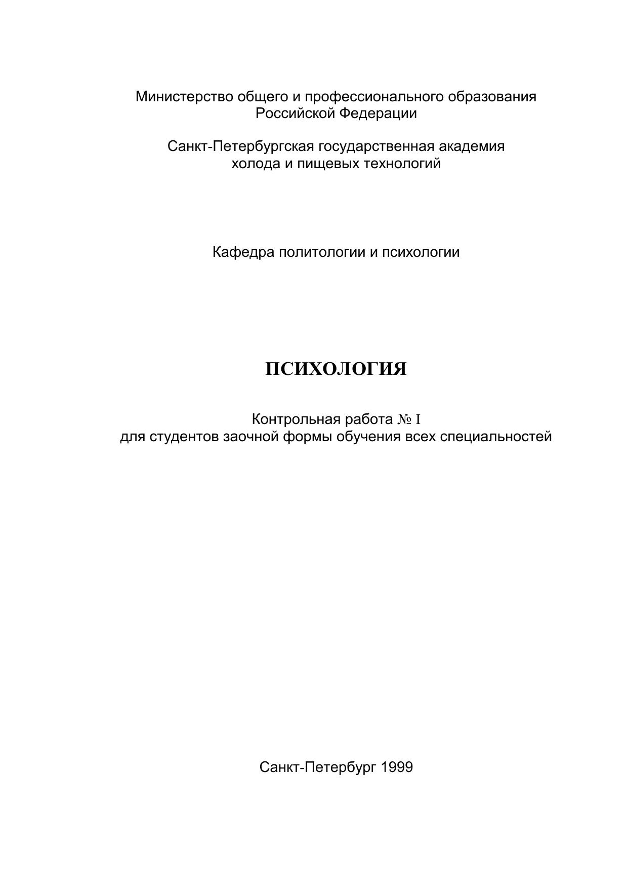Представлены требования к написанию и оформлению контрольной работы № I по психологии, требования к обязательному минимуму содержания, уровню подготовки студентов содержания работы. Приведен список рекомендуемой литературы.