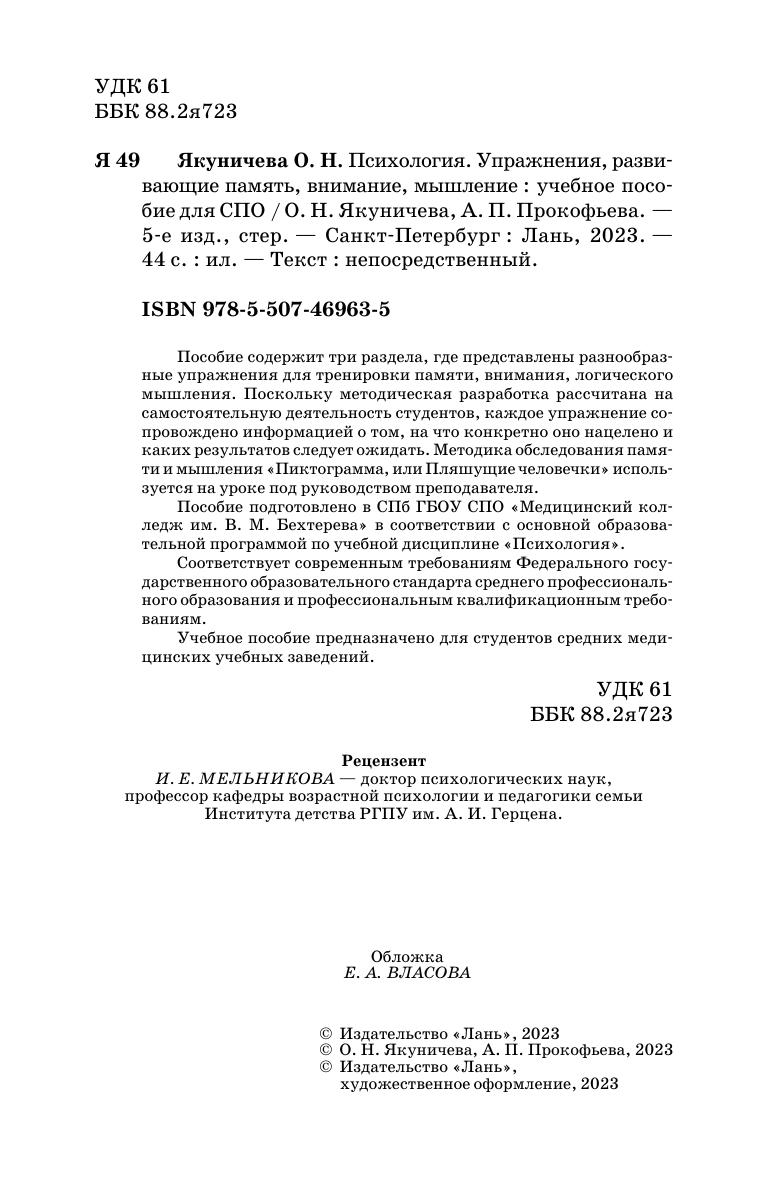 Пособие содержит три раздела, где представлены разнообразные упражнения для тренировки памяти, внимания, логического мышления. Поскольку методическая разработка рассчитана на самостоятельную деятельность студентов, каждое упражнение сопровождено информацией о том, на что конкретно нацелено и каких результатов следует ожидать. Методика обследования памяти и мышления «Пиктограмма, или Пляшущие человечки» используется на уроке под руководством преподавателя. Пособие подготовлено в СПб ГБОУ СПО «Медицинский колледж им. В. М. Бехтерева» в соответствии с основной образовательной программой по учебной дисциплине «Психология». Соответствует современным требованиям Федерального государственного образовательного стандарта среднего профессионального образования и профессиональным квалификационным требованиям. Учебное пособие предназначено для студентов средних медицинских учебных заведений.
