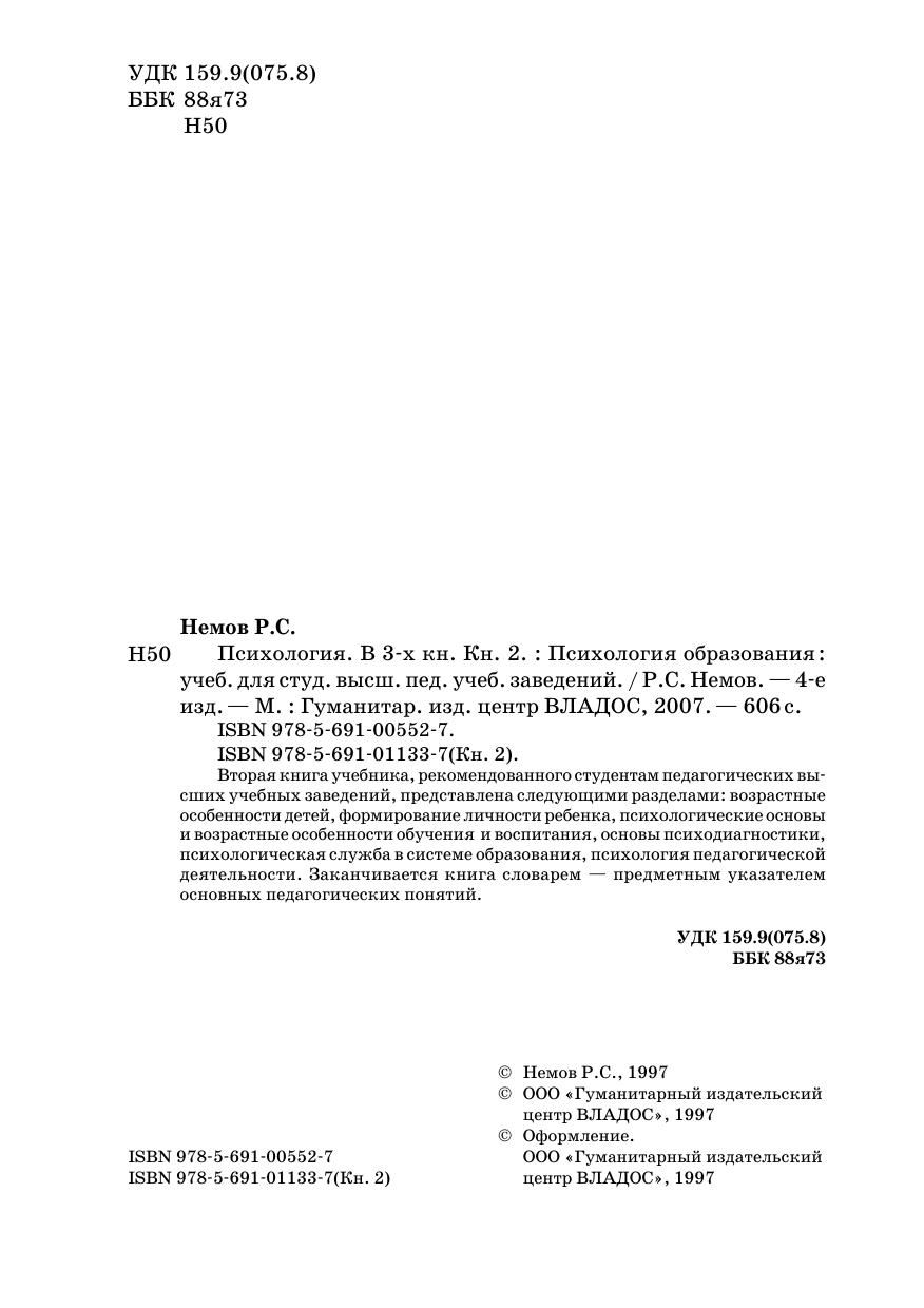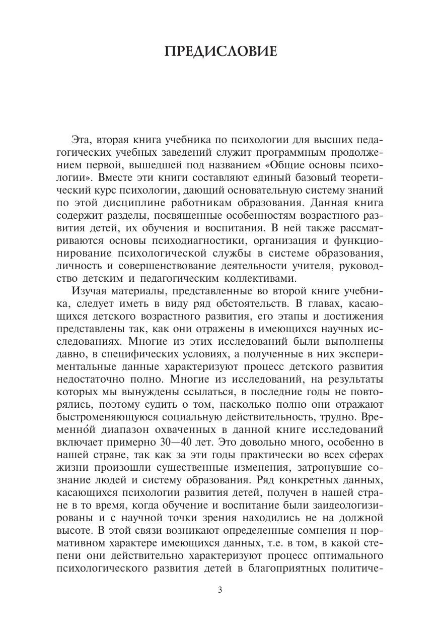 Вторая книга учебника, рекомендованного студентам педагогических высших учебных заведений, представлена следующими разделами: возрастные особенности детей, формирование личности ребенка, психологические основы и возрастные особенности обучения и воспитания, основы психо диагностики, психологическая служба в системе образования, психология педагогической деятельности. Заканчивается книга словарем — предметным указателем основных педагогических понятий.