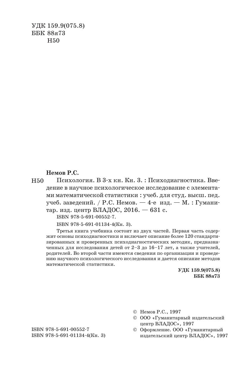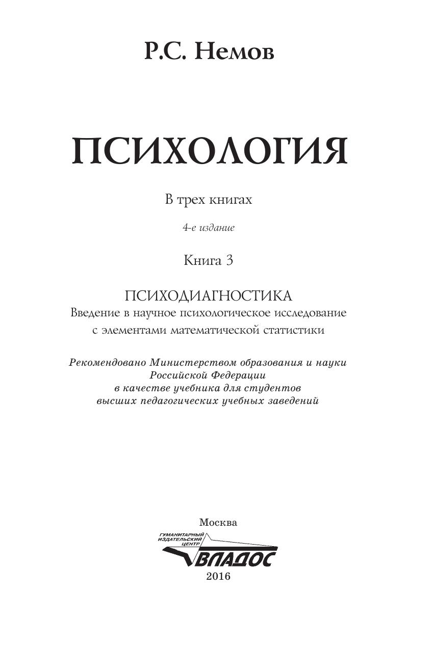Психология. В 3-х кн. Кн. 3. : Психодиагностика. Введение в научное психологическое исследование с элементами математической статистики : учебник для студ. высш. пед. учеб. заведений
