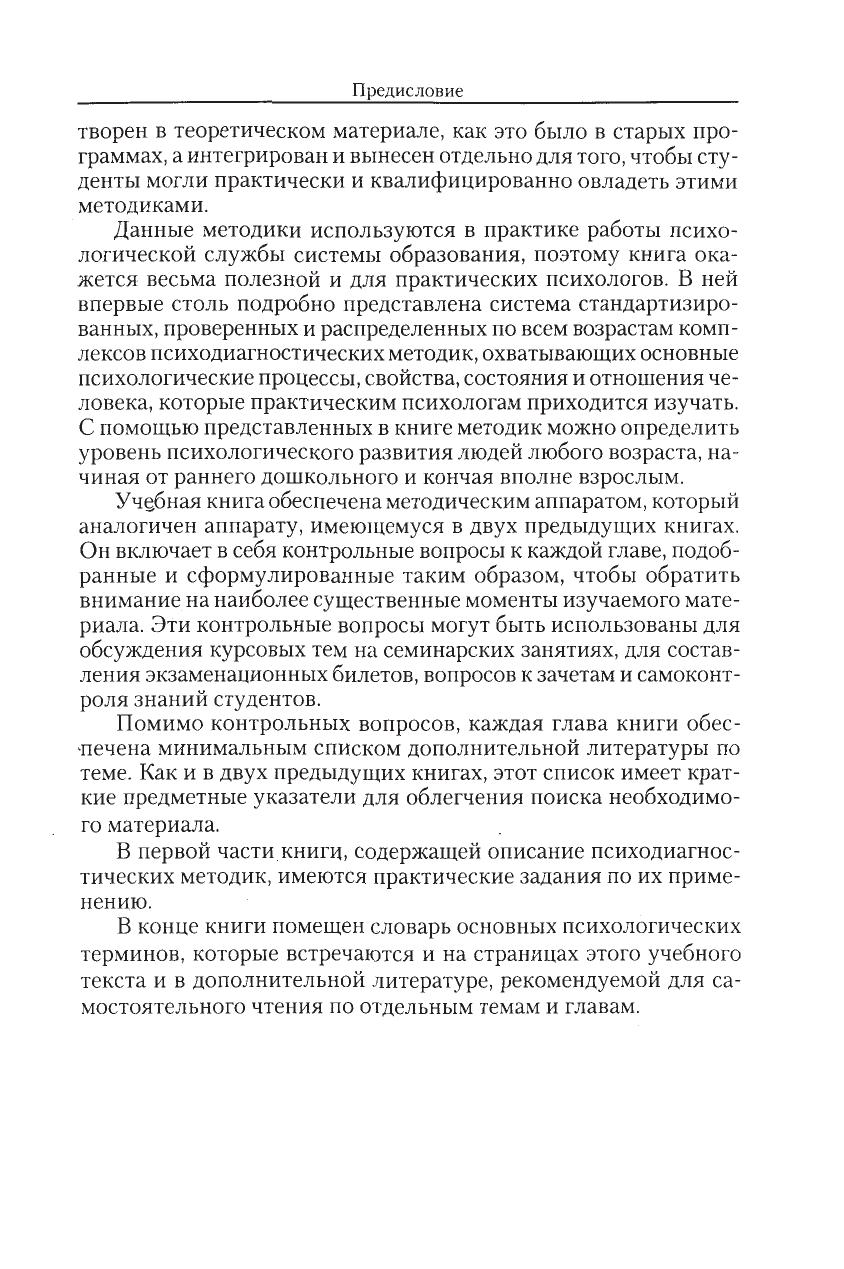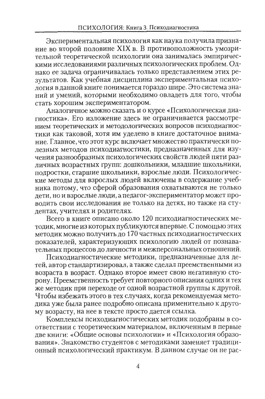 Третья книга учебника состоит из двух частей. Первая часть содержит основы психодиагностики и включает описание более 120 стандартизированных и гпроверенных психодиагностических методик, предназначенных для исследования детей от 2–3 до 16–17 лет, а также учителей, родителей. Во второй части имеются сведения по организации и проведению научного психологического исследования и дается описание методов математической статистики.