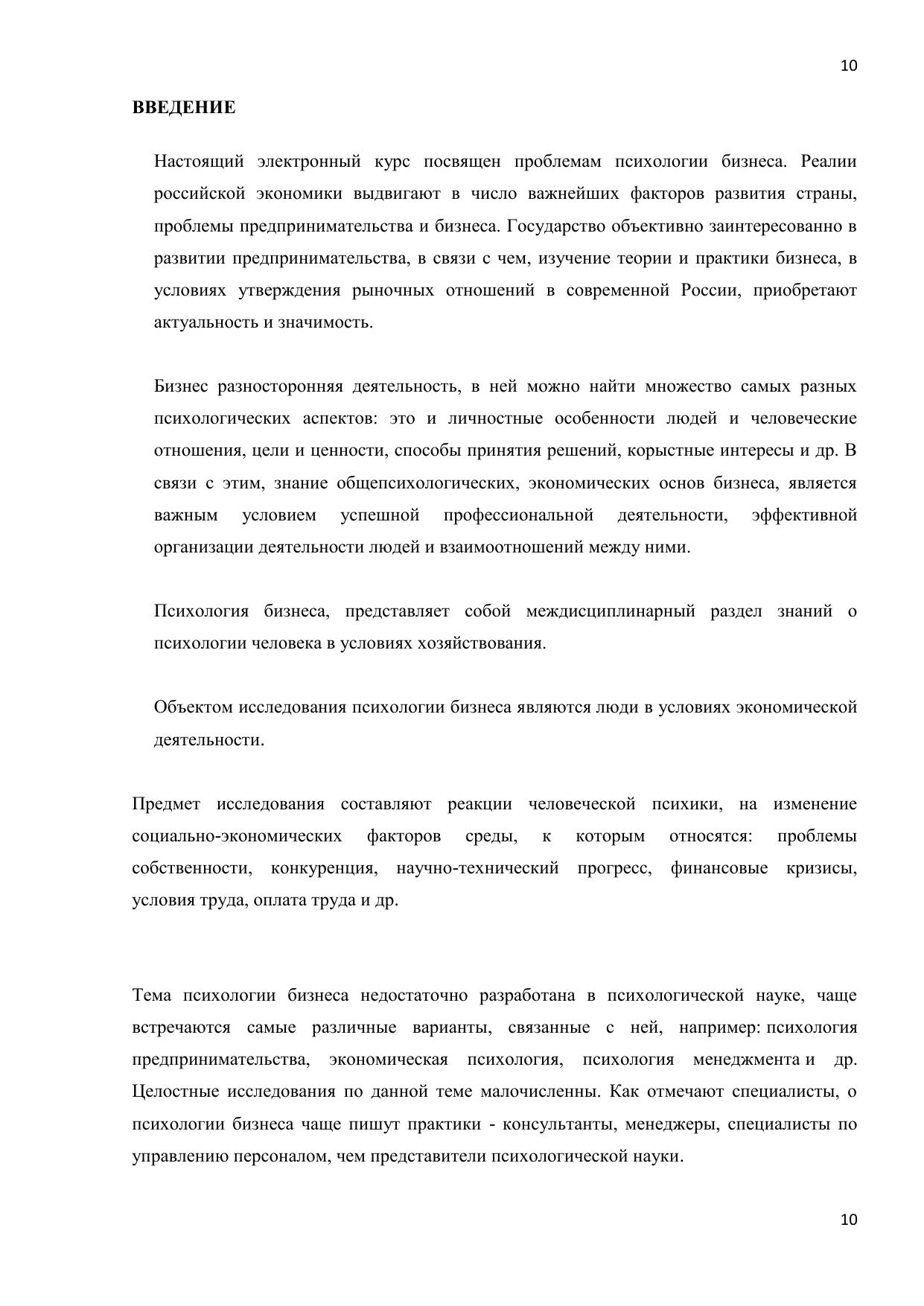 В данном электронном курсе изложены основы психологии бизнеса. Материал курса соответствует учебной программе для вузов по специальностям «Бухгалтерский учет, анализ и аудит», «Менеджмент организации». В электронном курсе рассматриваются теоретические и практические вопросы психологических особенностей поведения человека в бизнесе. Электронный курс состоит из восьми тем, в которых представлено последовательное системное изложение вопросов бизнеса, менеджмента, основ психологии личности и этики бизнеса. Каждая тема электронного курса содержит методические разработки для лучшего усвоения материала: вопросы для самопроверки, практикумы, тесты основную и дополнительную литературу, задача которых способствовать лучшему усвоению студентами основных понятий соответствующих тем и понимания основных психологических особенностей, влияющих на развитие и эффективность бизнеса. Данный курс подготовлен в соответствии с государственным образовательным стандартом для студентов, обучающихся по специальностям: «Менеджмент организации» и «Бухгалтерский учет, анализ и аудит», а также для специалистов в области управления организацией (бизнесом). Представленные материалы будут интересны широкому кругу читателей, интересующихся проблемами психологии бизнеса.