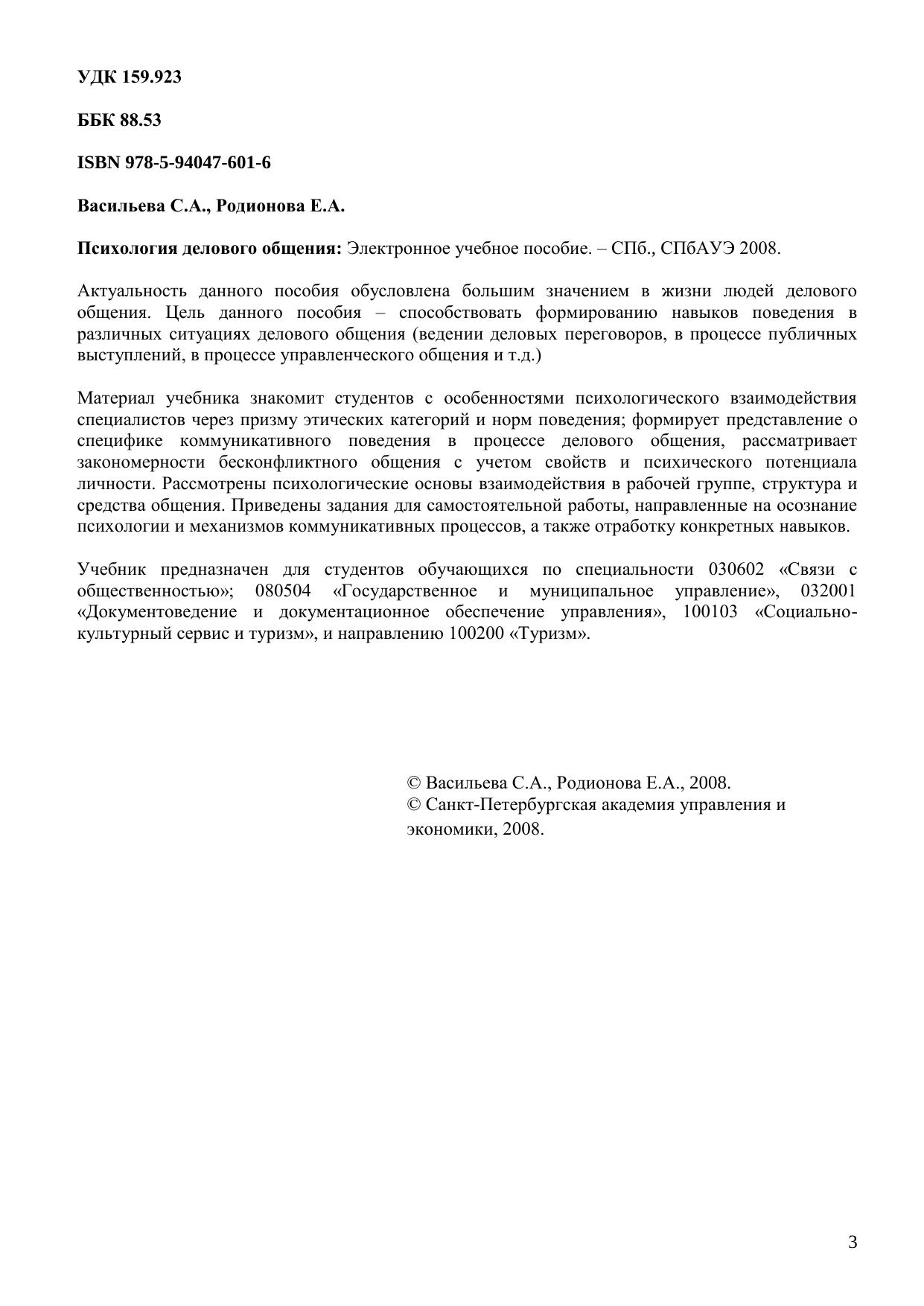 Актуальность данного пособия обусловлена большим значением в жизни людей делового общения. Цель данного пособия – способствовать формированию навыков поведения в различных ситуациях делового общения (ведении деловых переговоров, в процессе публичных выступлений, в процессе управленческого общения и т.д.). Материал учебника знакомит студентов с особенностями психологического взаимодействия специалистов через призму этических категорий и норм поведения формирует представление о специфике коммуникативного поведения в процессе делового общения, рассматривает закономерности бесконфликтного общения с учетом свойств и психического потенциала личности. Рассмотрены психологические основы взаимодействия в рабочей группе, структура и средства общения. Приведены задания для самостоятельной работы, направленные на осознание психологии и механизмов коммуникативных процессов, а также отработку конкретных навыков. Учебник предназначен для студентов, обучающихся по специальности 030602 «Связи с общественностью» 080504 «Государственное и муниципальное управление», 032001 «Документоведение и документационное обеспечение управления», 100103 «Социально-культурный сервис и туризм», и направлению 100200 «Туризм». Электронное учебное пособие для дистанционного обучения