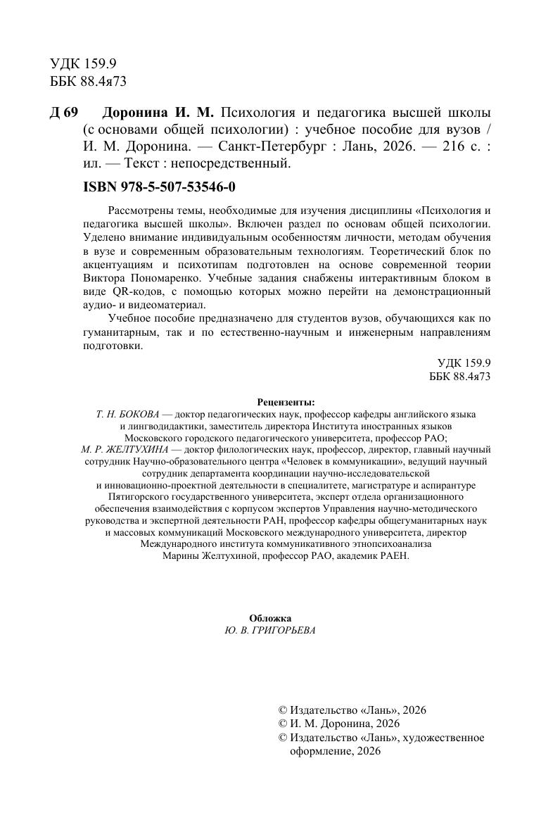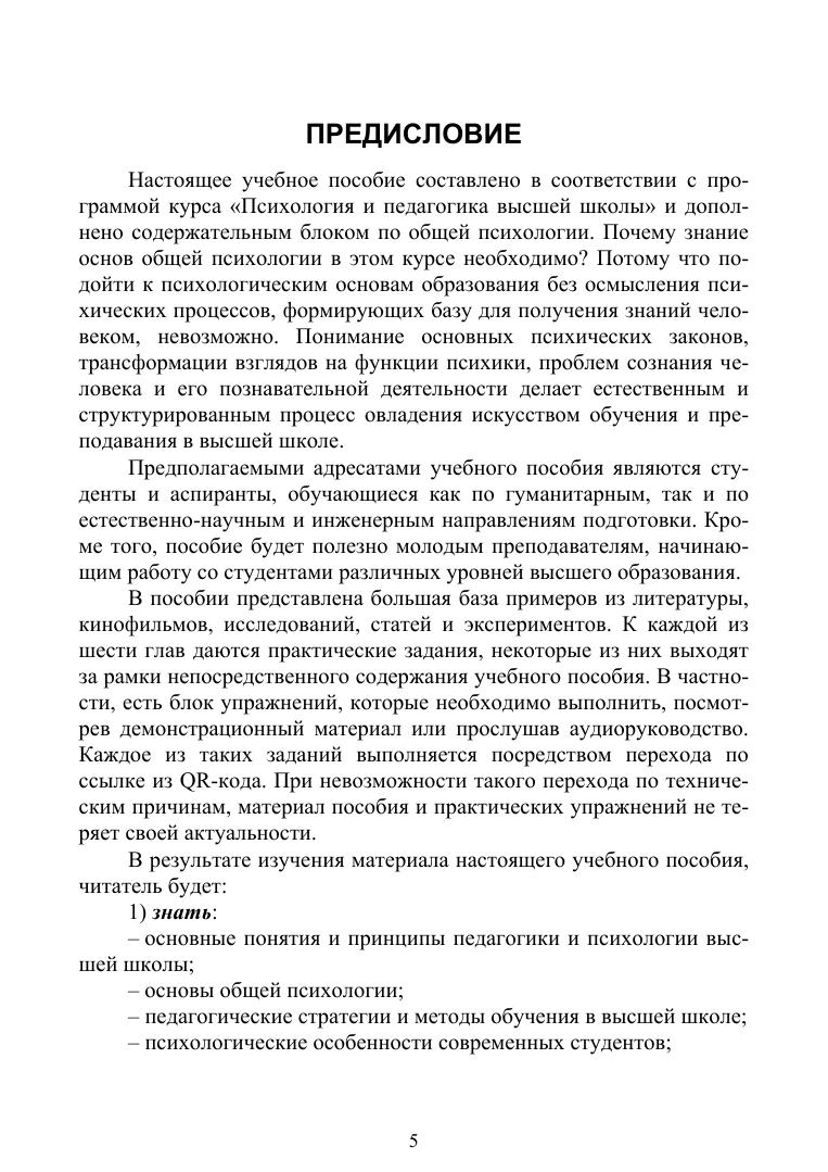 Рассмотрены темы, необходимые для изучения дисциплины «Психология и педагогика высшей школы». Включен раздел по основам общей психологии. Уделено внимание индивидуальным особенностям личности, методам обучения в вузе и современным образовательным технологиям. Теоретический блок по акцентуациям и психотипам подготовлен на основе современной теории Виктора Пономаренко. Учебные задания снабжены интерактивным блоком в виде QR-кодов, с помощью которых можно перейти на демонстрационный аудио- и видеоматериал. Учебное пособие предназначено для студентов вузов, обучающихся как по гуманитарным, так и по естественно-научным и инженерным направлениям подготовки.