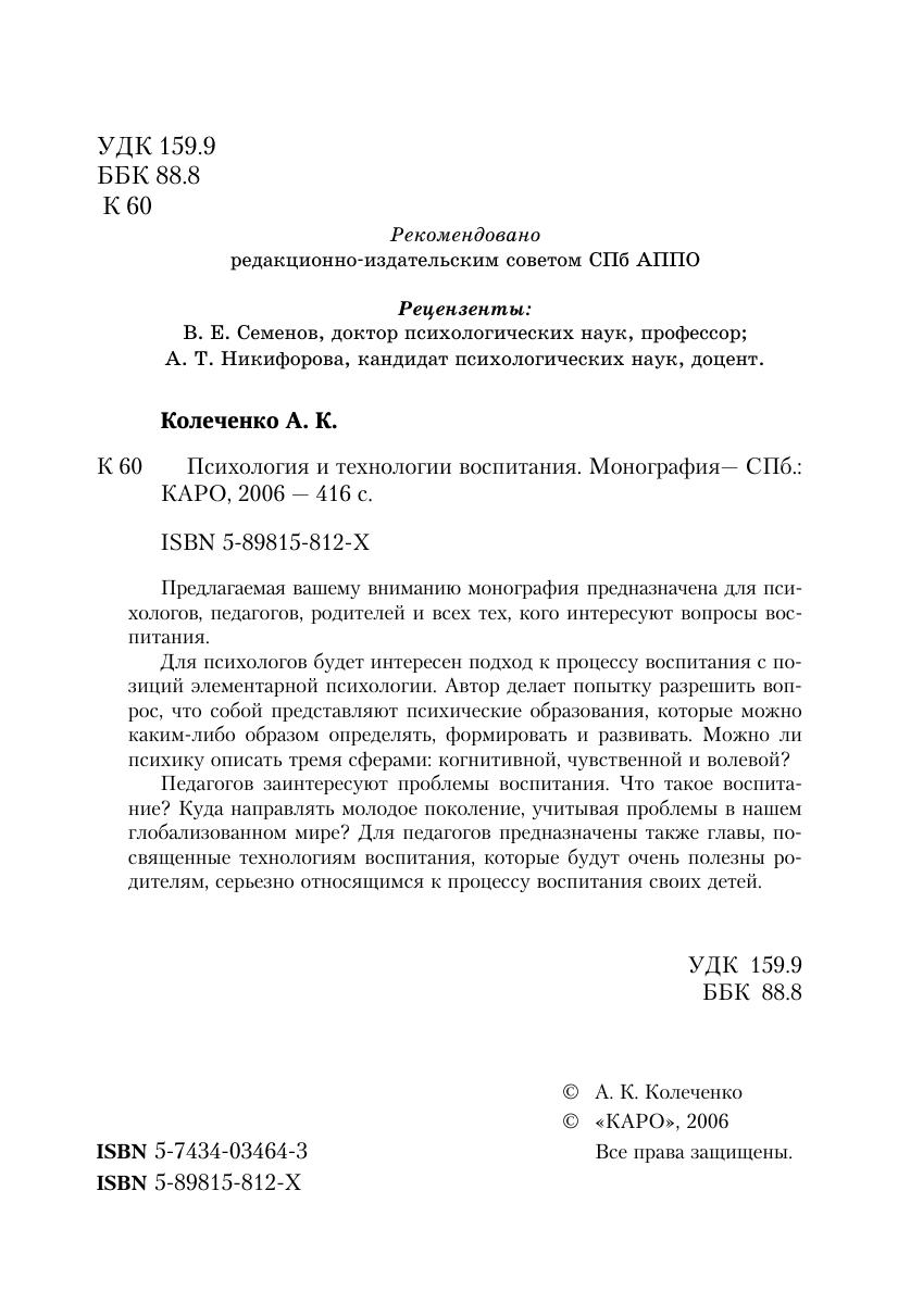 Предлагаемая вашему вниманию монография предназначена для психологов, педагогов, родителей и всех тех, кого интересуют вопросы воспитания.