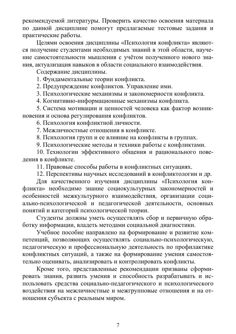 Учебное пособие содержит весь необходимый теоретический материал, объясняющий природу психологического конфликта. Цель работы — раскрыть содержание основных научных понятий: «конфликт», «теории конфликта», «типы конфликтов» и др. и определить роль явлений, описываемых этими понятиями, в регуляции поведения отдельного человека. Для этого в пособии рассматриваются стили поведения индивидов во всех типах конфликта, вводится понятие конфликтной личности, дается определение главных форм психологической защиты как одного из механизмов, активно участвующих в разрешении конфликтной ситуации. Пособие состоит из 20 глав, в каждой из которых есть контрольные вопросы для самопроверки и список дополнительной литературы, расширяющей представление о затронутой в данной главе теме. Учебное пособие предназначено для студентов и аспирантов вузов психологических и управленческих направлений подготовки, таких как «Психология» (по профилям «Социальная психология», «Психология личности»), «Конфликтология», «Психолого-педагогическое образование», «Государственное и муниципальное управление», «Менеджмент», «Управление персоналом» и др.