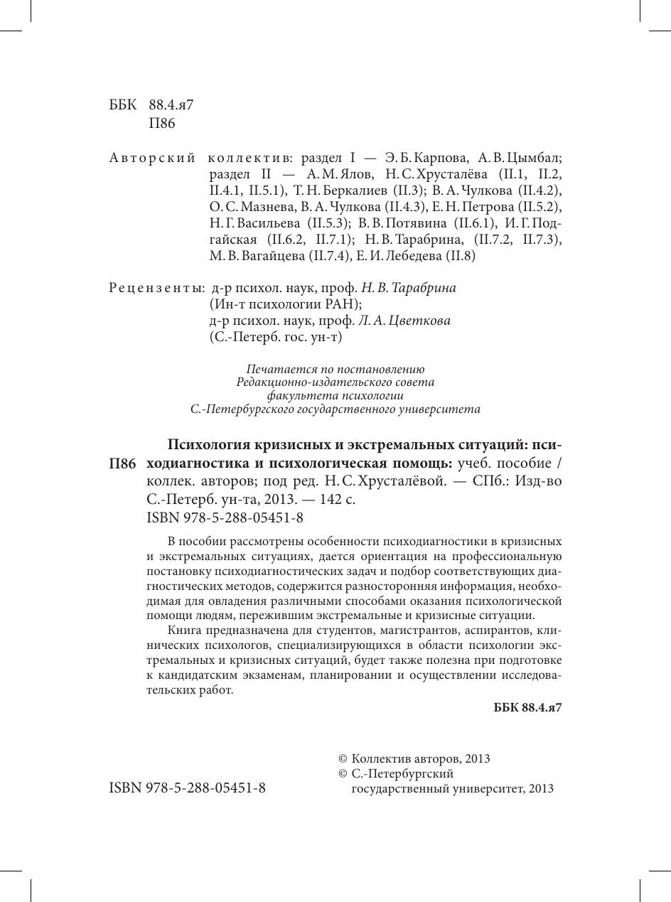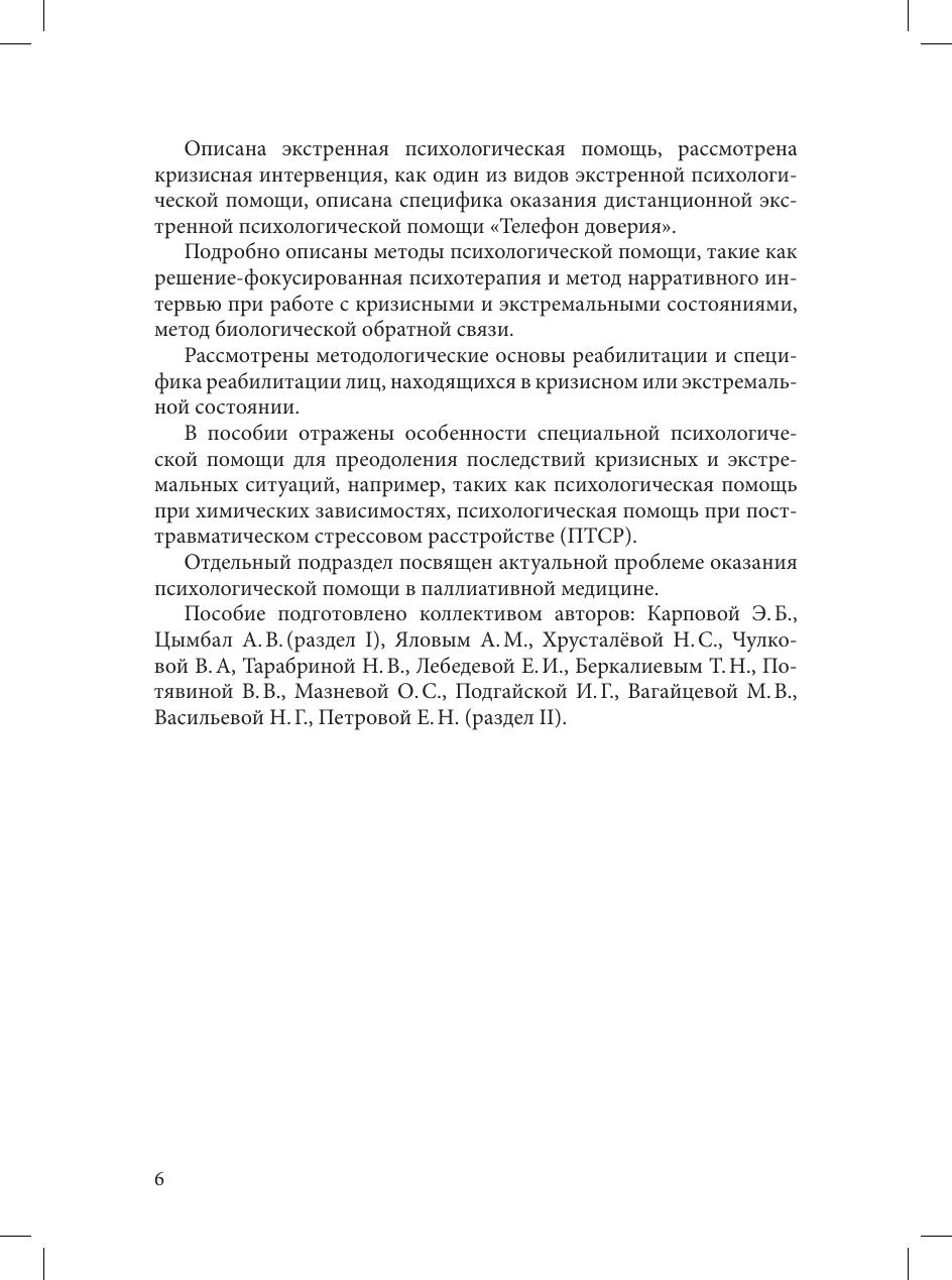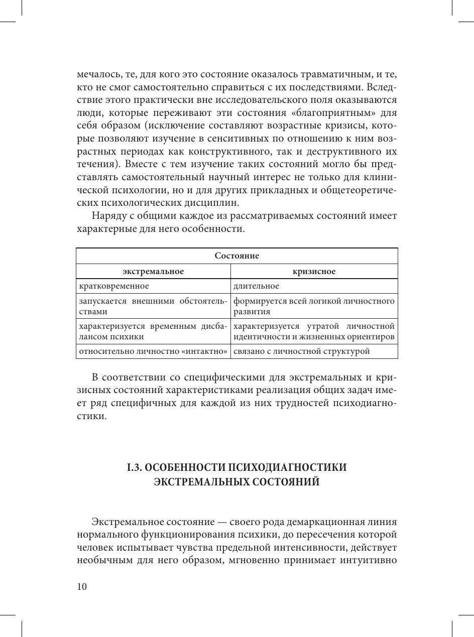 В пособии рассмотрены особенности психодиагностики в кризисных и экстремальных ситуациях, дается ориентация на профессиональную постановку психодиагностических задач и подбор соответствующих диагностических методов, содержится разносторонняя информация, необходимая для овладения различными способами оказания психологической помощи людям, пережившим экстремальные и кризисные ситуации.