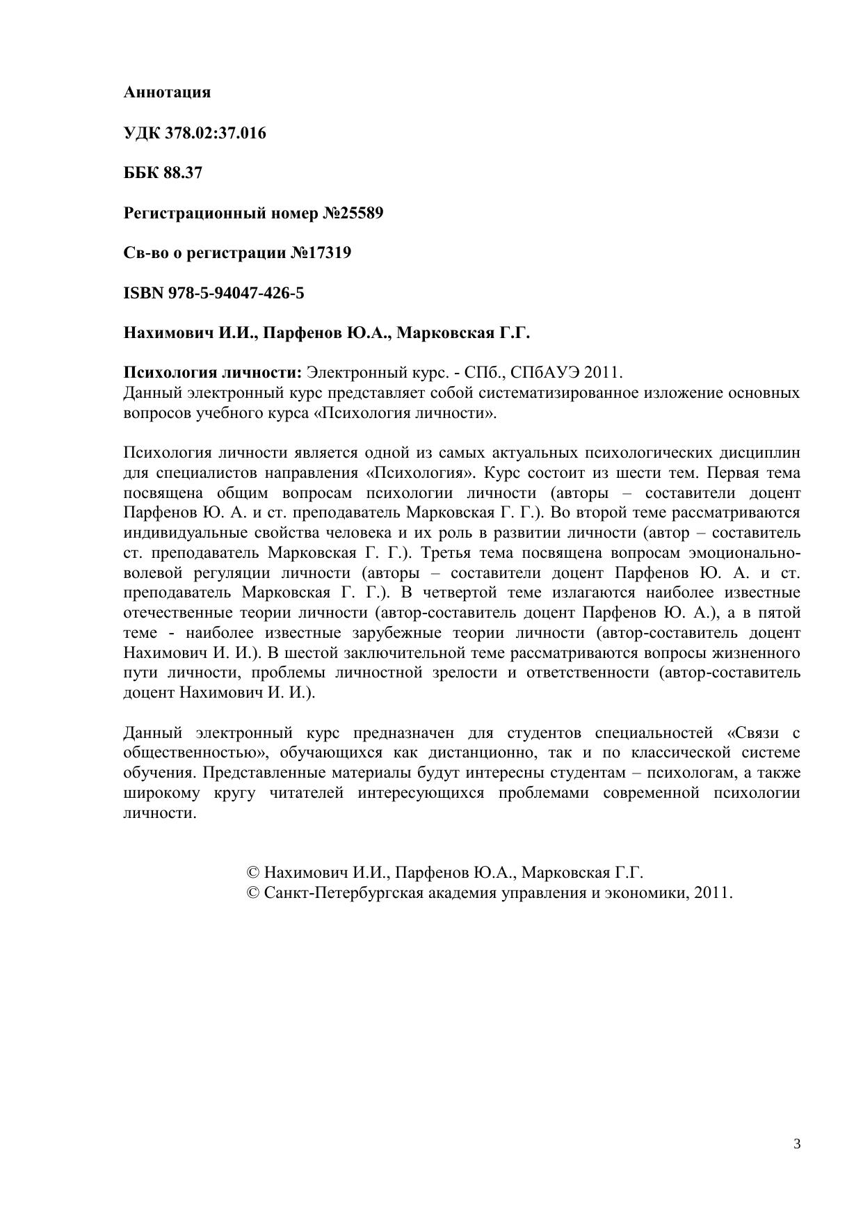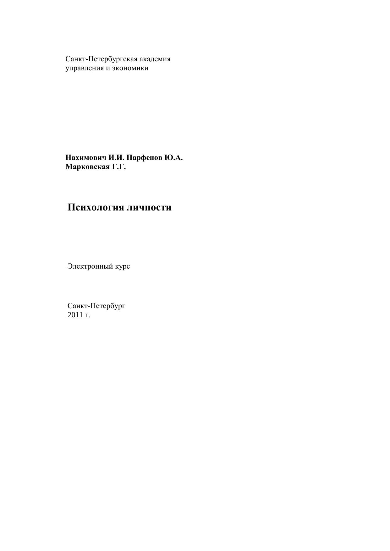 Данный электронный курс представляет собой систематизированное изложение основных вопросов учебного курса «Психология личности». Психология личности является одной из самых актуальных психологических дисциплин для специалистов направления «Психология». Курс состоит из шести тем. Первая тема посвящена общим вопросам психологии личности (авторы – составители доцент Парфенов Ю. А. и ст. преподаватель Марковская Г. Г.). Во второй теме рассматриваются индивидуальные свойства человека и их роль в развитии личности (автор – составитель ст. преподаватель Марковская Г. Г.). Третья тема посвящена вопросам эмоционально-волевой регуляции личности (авторы – составители доцент Парфенов Ю. А. и ст. преподаватель Марковская Г. Г.). В четвертой теме излагаются наиболее известные отечественные теории личности (автор-составитель доцент Парфенов Ю. А.), а в пятой теме - наиболее известные зарубежные теории личности (автор-составитель доцент Нахимович И. И.). В шестой заключительной теме рассматриваются вопросы жизненного пути личности, проблемы личностной зрелости и ответственности (автор-составитель доцент Нахимович И. И.). Данный электронный курс предназначен для студентов специальностей «Связи с общественностью», обучающихся как дистанционно, так и по классической системе обучения. Представленные материалы будут интересны студентам – психологам, а также широкому кругу читателей, интересующихся проблемами современной психологии личности.