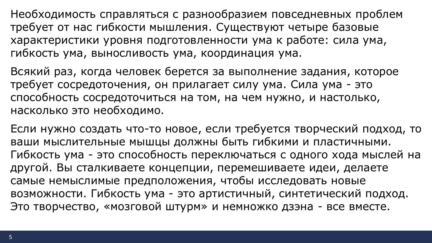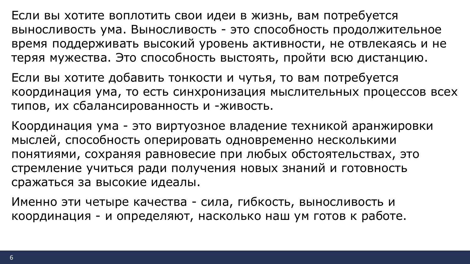Необходимость справляться с разнообразием повседневных проблем требует от нас гибкости мышления. Существуют четыре базовые характеристики уровня подготовленности ума к работе: сила ума, гибкость ума, выносливость ума, координация ума.