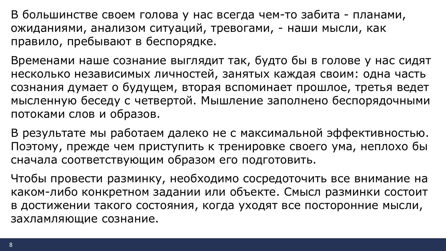 Всякий раз, когда человек берется за выполнение задания, которое требует сосредоточения, он прилагает силу ума. Сила ума – это способность сосредоточиться на том, на чем нужно, и настолько, насколько это необходимо.