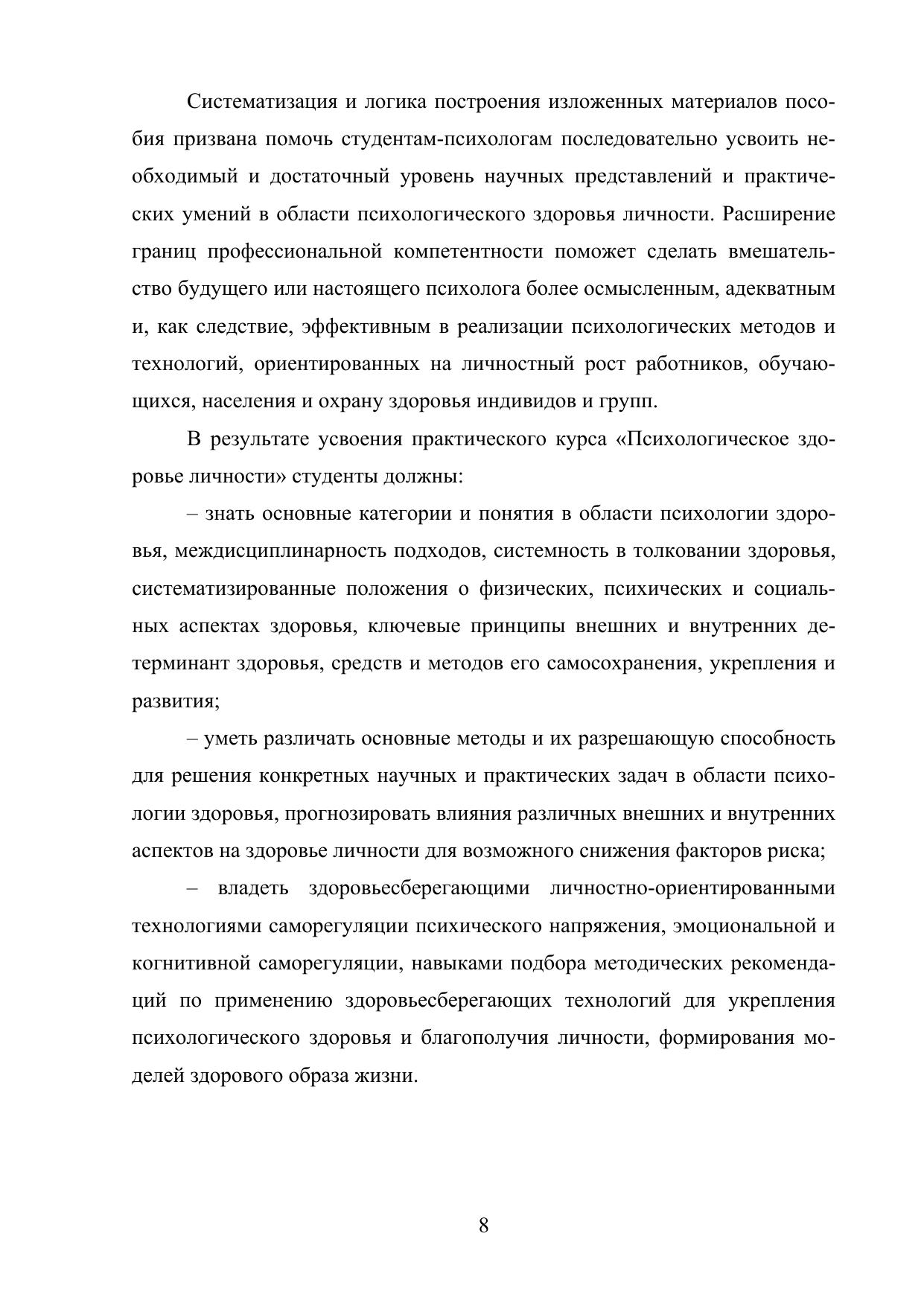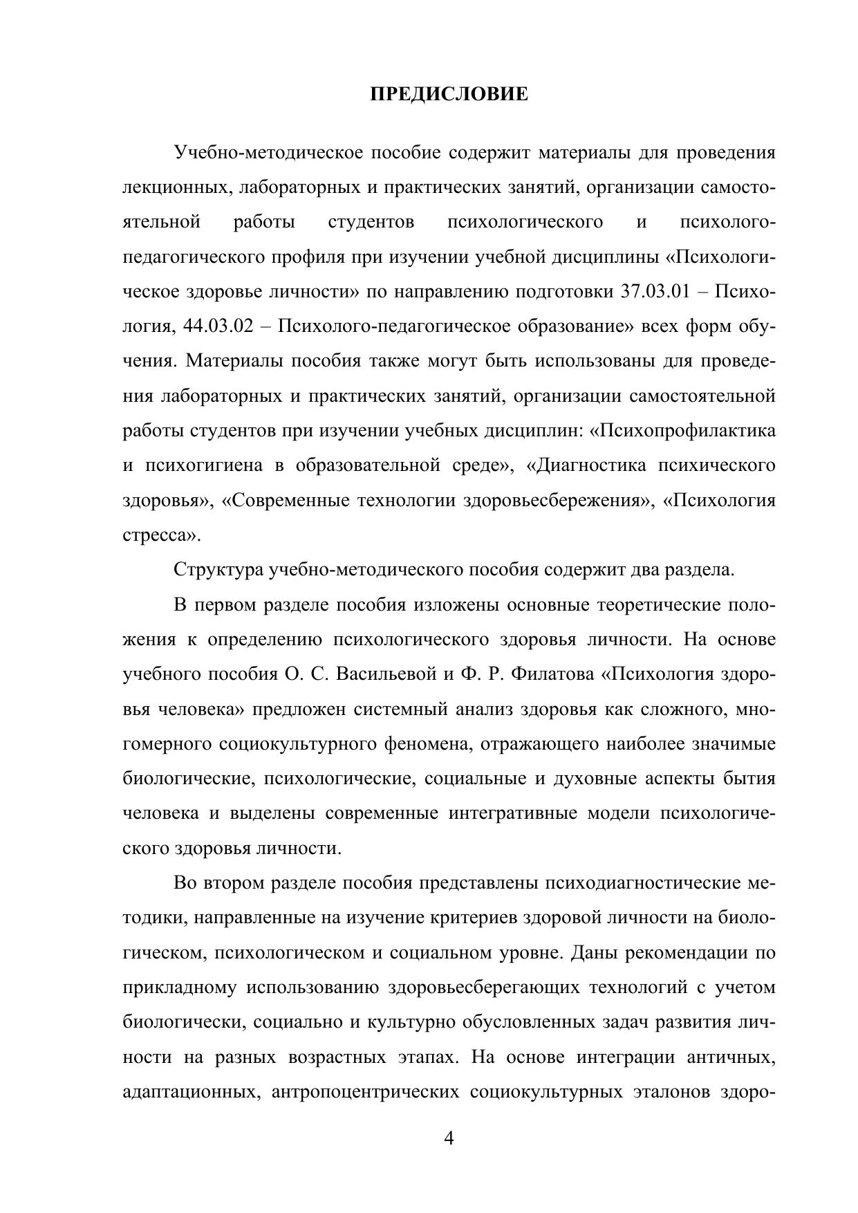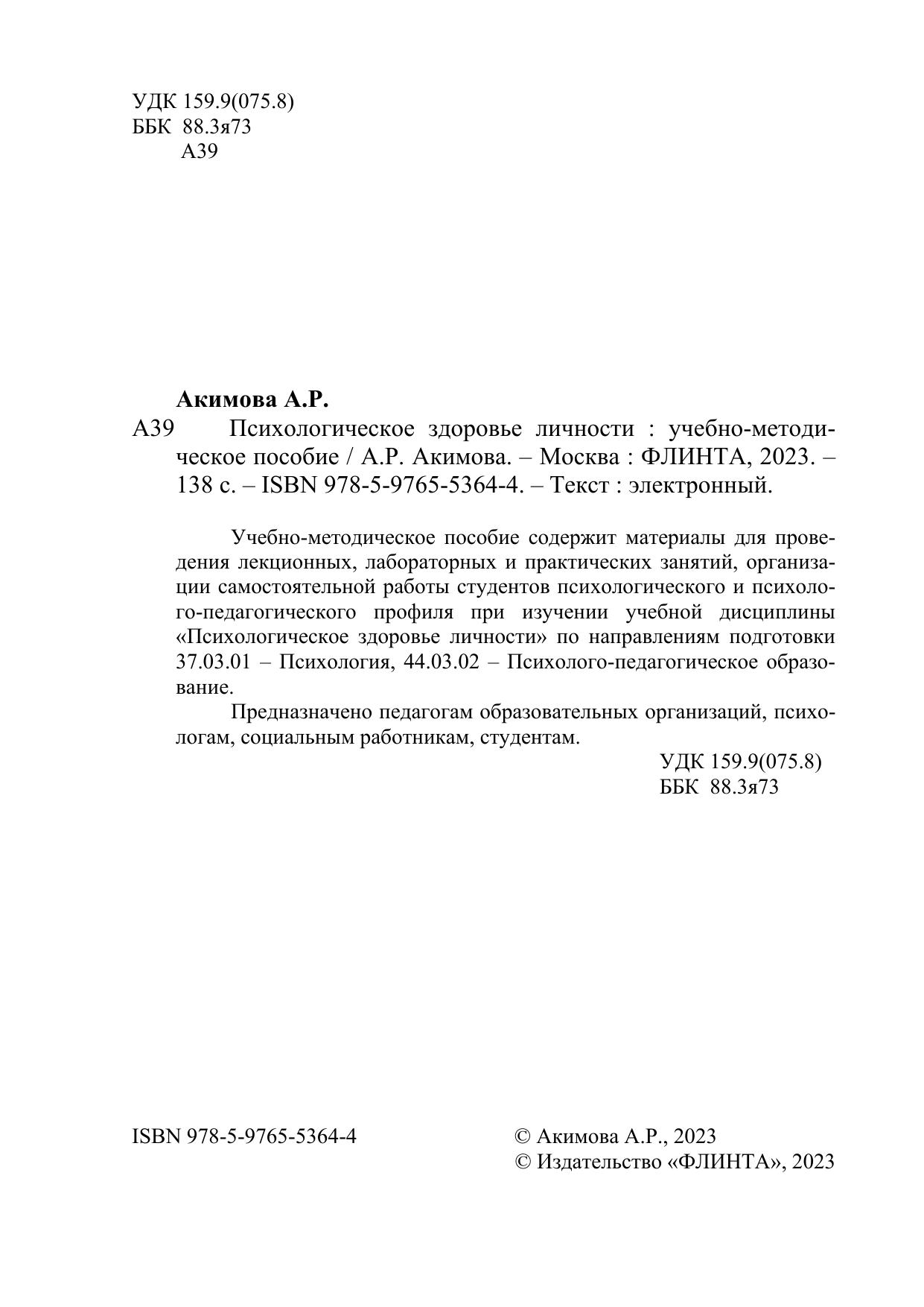Учебно-методическое пособие содержит материалы для проведения лекционных, лабораторных и практических занятий, организации самостоятельной работы студентов психологического и психолого-педагогического профиля при изучении учебной дисциплины «Психологическое здоровье личности» по направлениям подготовки 37.03.01 – Психология, 44.03.02 – Психолого-педагогическое образование.