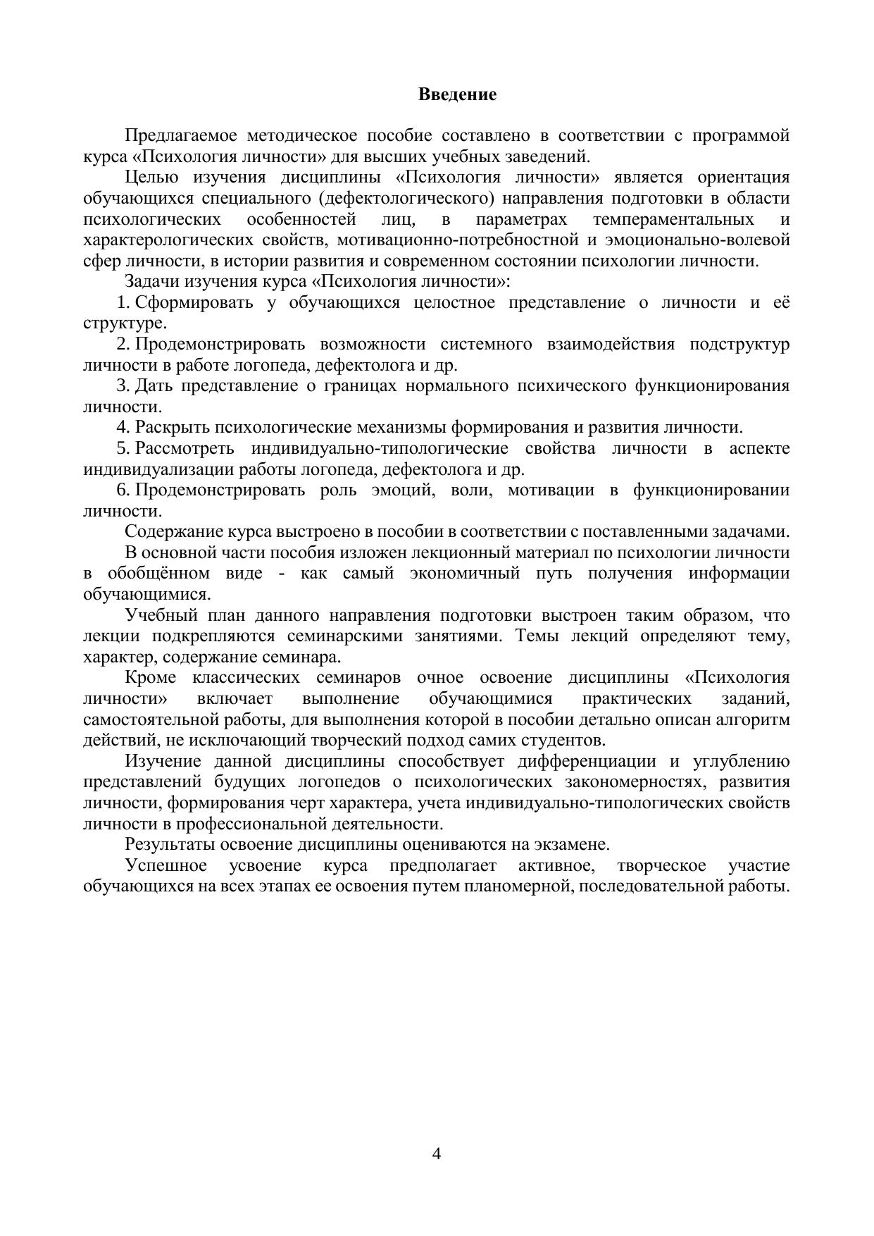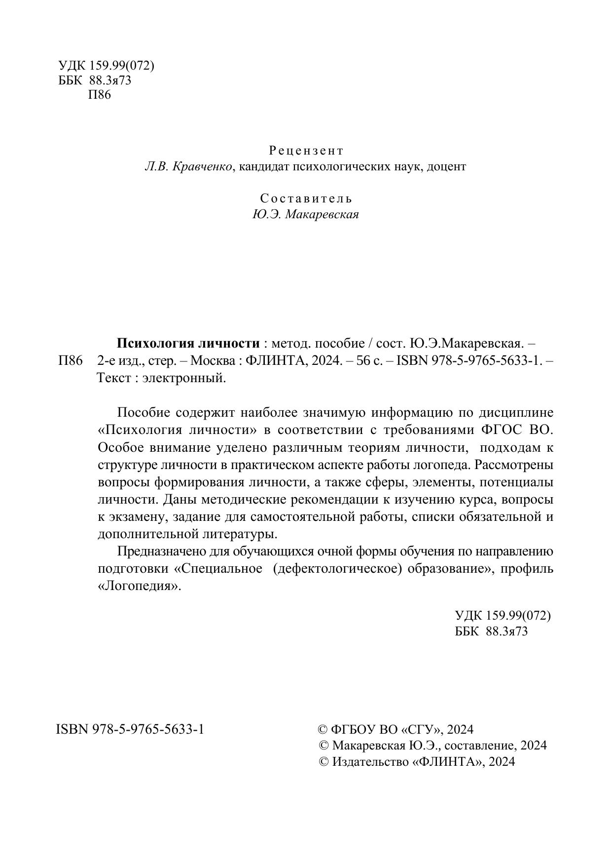 Пособие содержит наиболее значимую информацию по дисциплине «Психология личности» в соответствии с требованиями ФГОС ВО. Особое внимание уделено различным теориям личности, подходам к структуре личности в практическом аспекте работы логопеда. Рассмотрены вопросы формирования личности, а также сферы, элементы, потенциалы личности. Даны методические рекомендации к изучению курса, вопросы к экзамену, задание для самостоятельной работы, списки обязательной и дополнительной литературы. Предназначено для студентов очной формы обучения по направлению подготовки «Специальное (дефектологическое) образование», профиль «Логопедия».