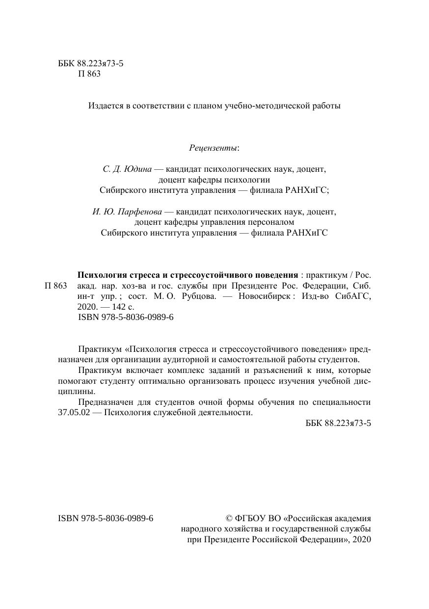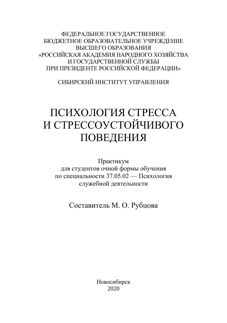 Практикум «Психология стресса и стрессоустойчивого поведения» пред-назначен для организации аудиторной и самостоятельной работы студентов. Практикум включает комплекс заданий и разъяснений к ним, которые помогают студенту оптимально организовать процесс изучения учебной дис-циплины. Предназначен для студентов очной формы обучения по специальности 37.05.02 — Психология служебной деятельности.