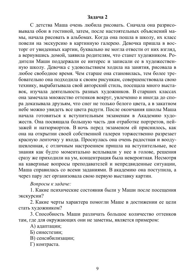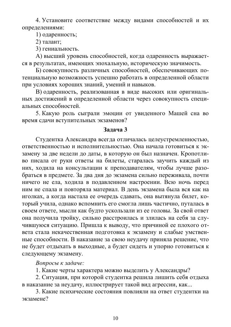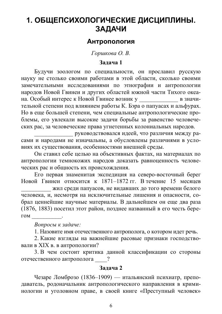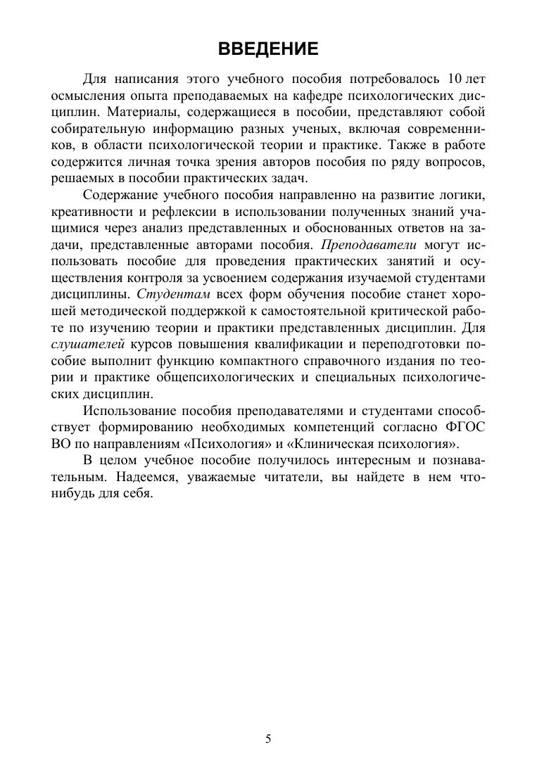 Учебное пособие содержит систематизированные по дисциплинам, преподаваемым психологам, задачи, касающиеся разнообразных аспектов психологической теории и практики и позволяющие закрепить теоретические знания в рамках процедур контроля и самоконтроля. Практически ориентированные кейсы, моделирующие различные ситуации реальной психологической практики, стимулируют проявление профессиональной креативности обучающихся. Материал пособия может использоваться как непосредственно на практических занятиях по приобретению навыков, соответствующих указанным психологическим дисциплинам, так и в самостоятельной работе студентов. Пособие предназначено для студентов высших учебных заведений, обучающихся по направлениям подготовки и специальностям «Психология», «Клиническая психология», «Психология служебной деятельности», а также для преподавателей этих дисциплин и практических психологов, стремящихся повысить свою профессиональную квалификацию.