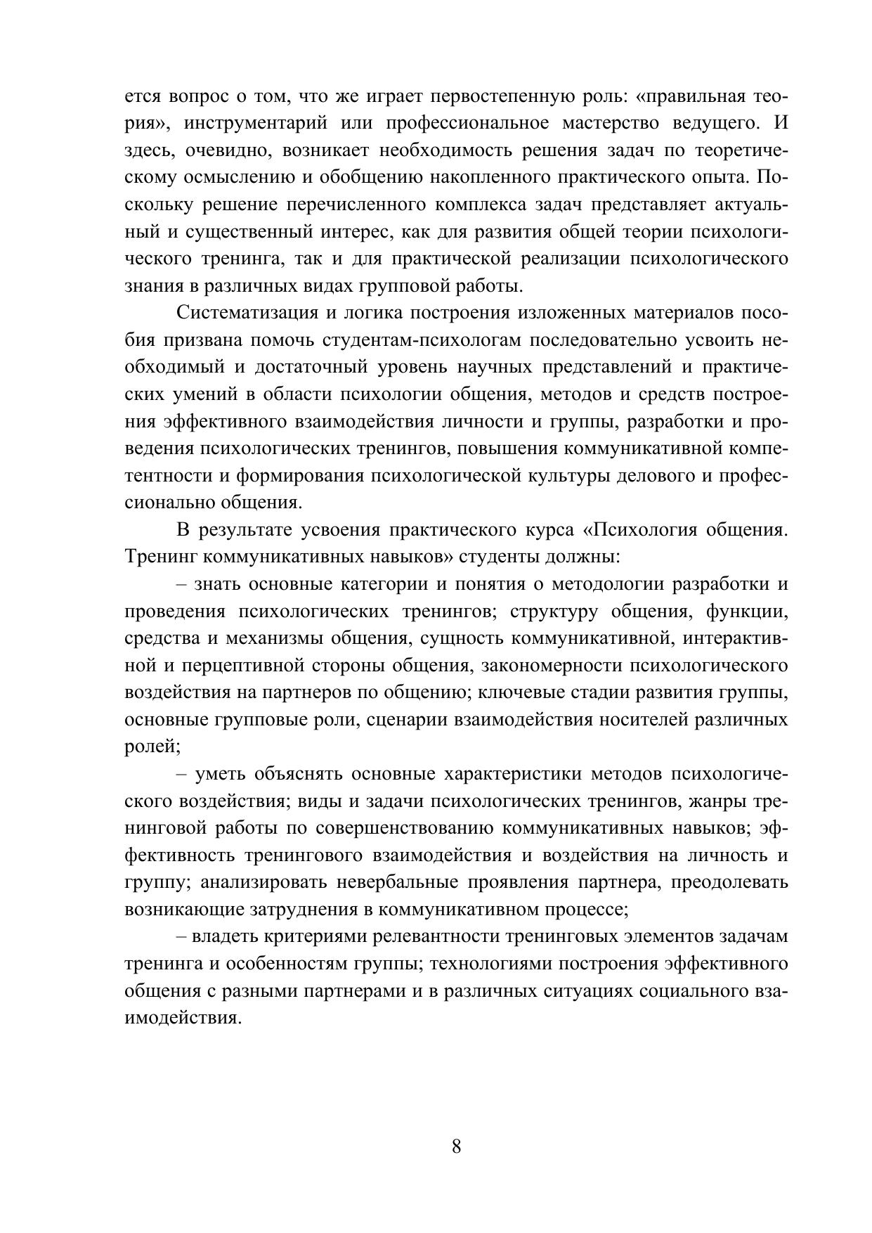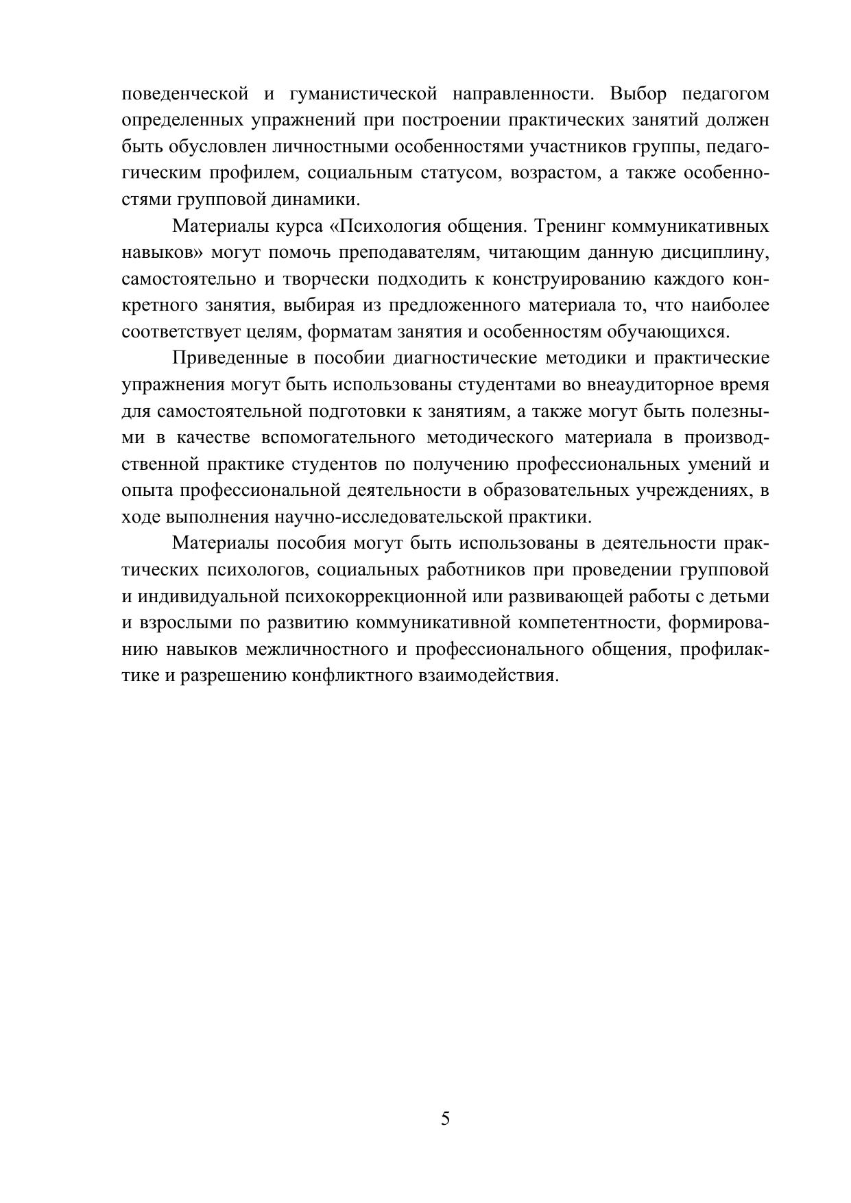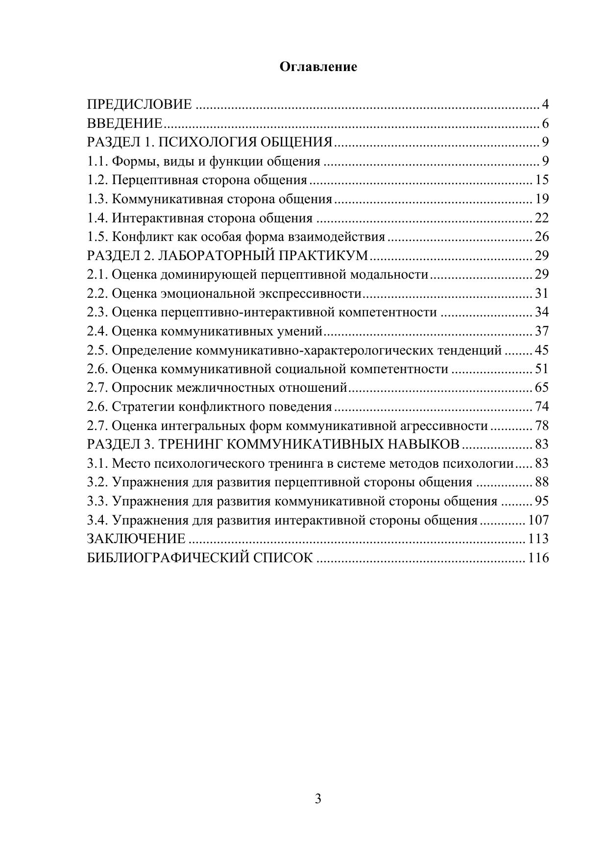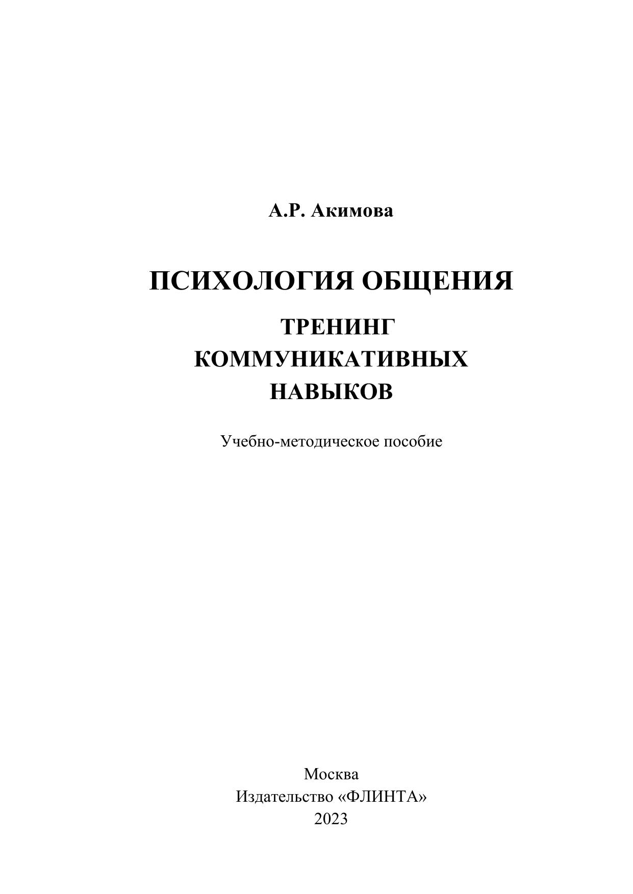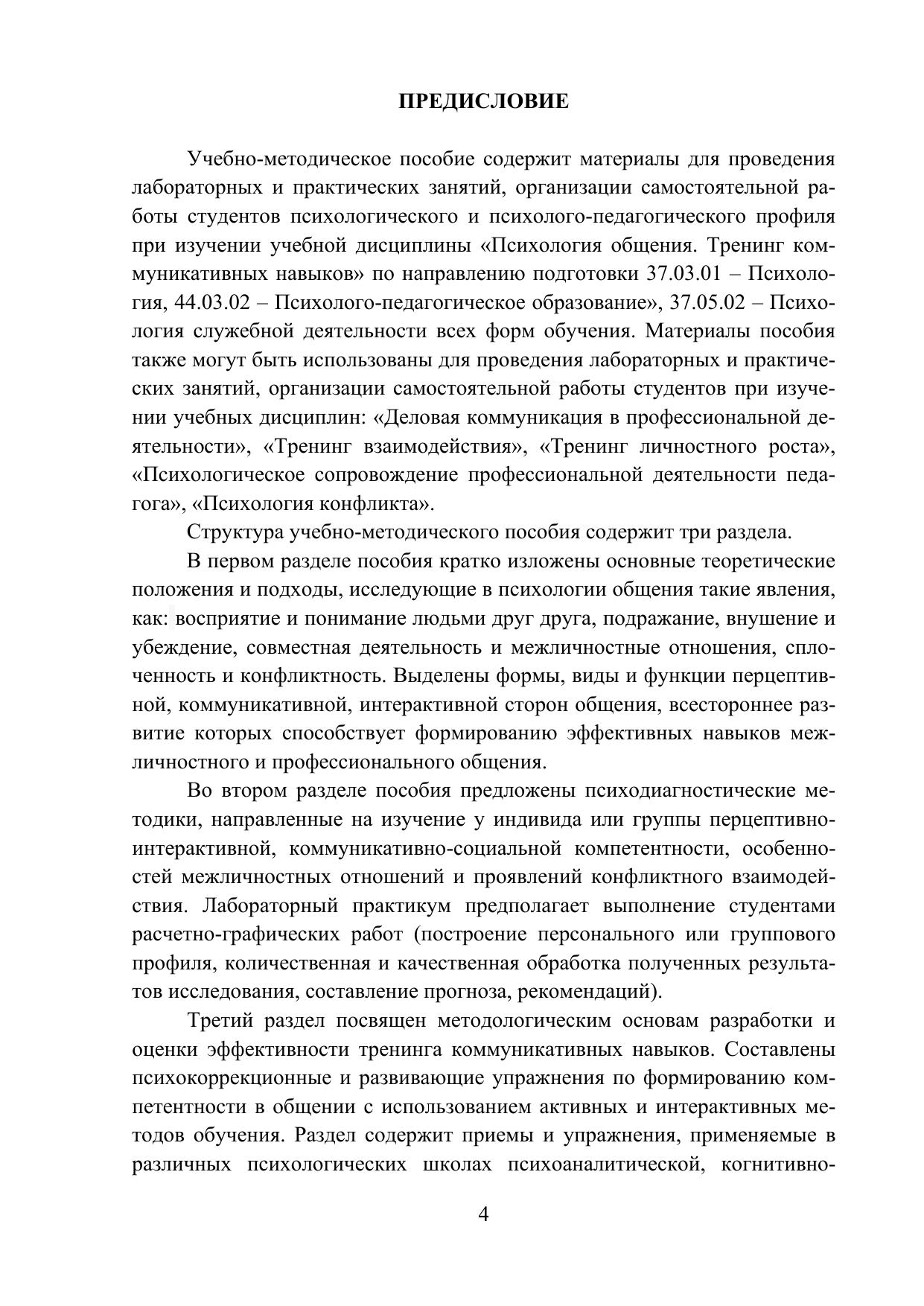 Учебно-методическое пособие содержит материалы для проведения лабораторных и практических занятий, организации самостоятельной работы студентов психологического и психолого-педагогического профиля при изучении учебной дисциплины «Психология общения. Тренинг коммуникативных навыков» по направлениям подготовки 37.03.01 – Психология, 44.03.02 – Психолого-педагогическое образование, 37.05.02 – Психология служебной деятельности всех форм обучения.