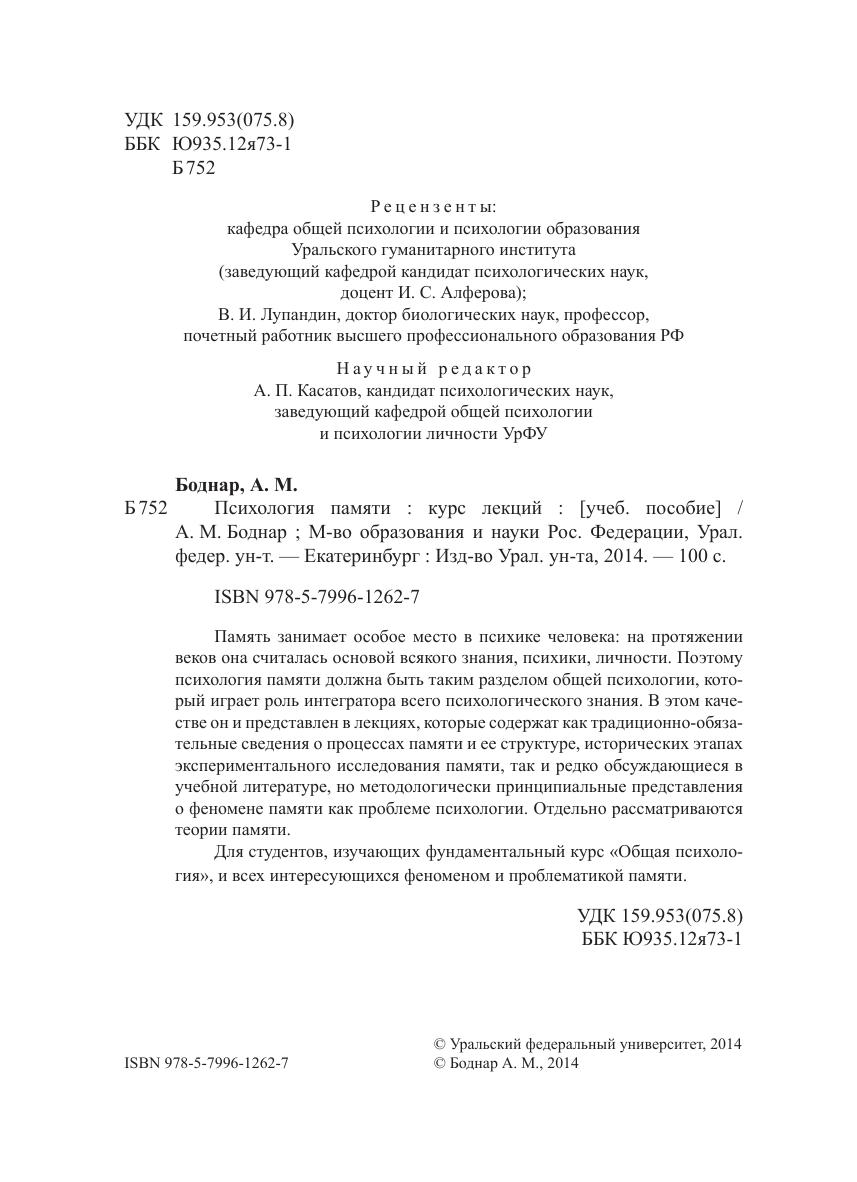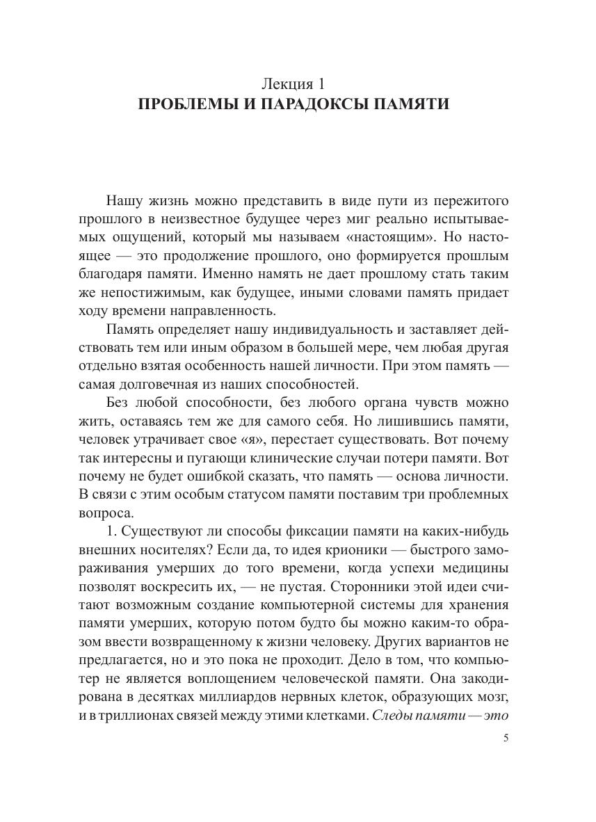 Память занимает особое место в психике человека: на протяжении веков она считалась основой всякого знания, психики, личности. Поэтому психология памяти должна быть таким разделом общей психологии, который играет роль интегратора всего психологического знания. В этом качестве он и представлен в лекциях, которые содержат как традиционно-обязательные сведения о процессах памяти и ее структуре, исторических этапах экспериментального исследования памяти, так и редко обсуждающиеся в учебной литературе, но методологически принципиальные представления о феномене памяти как проблеме психологии. Отдельно рассматриваются теории памяти. Для студентов, изучающих фундаментальный курс «Общая психология», и всех интересующихся феноменом и проблематикой памяти.