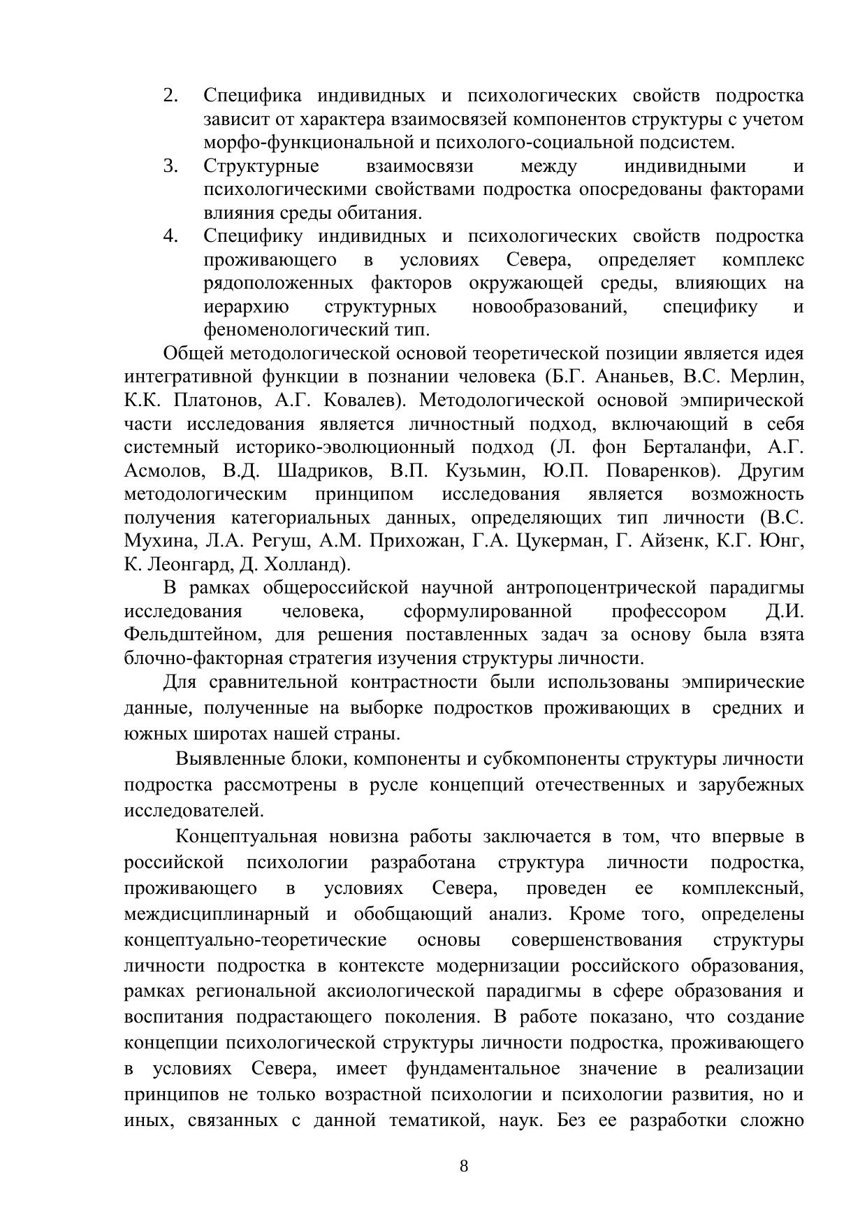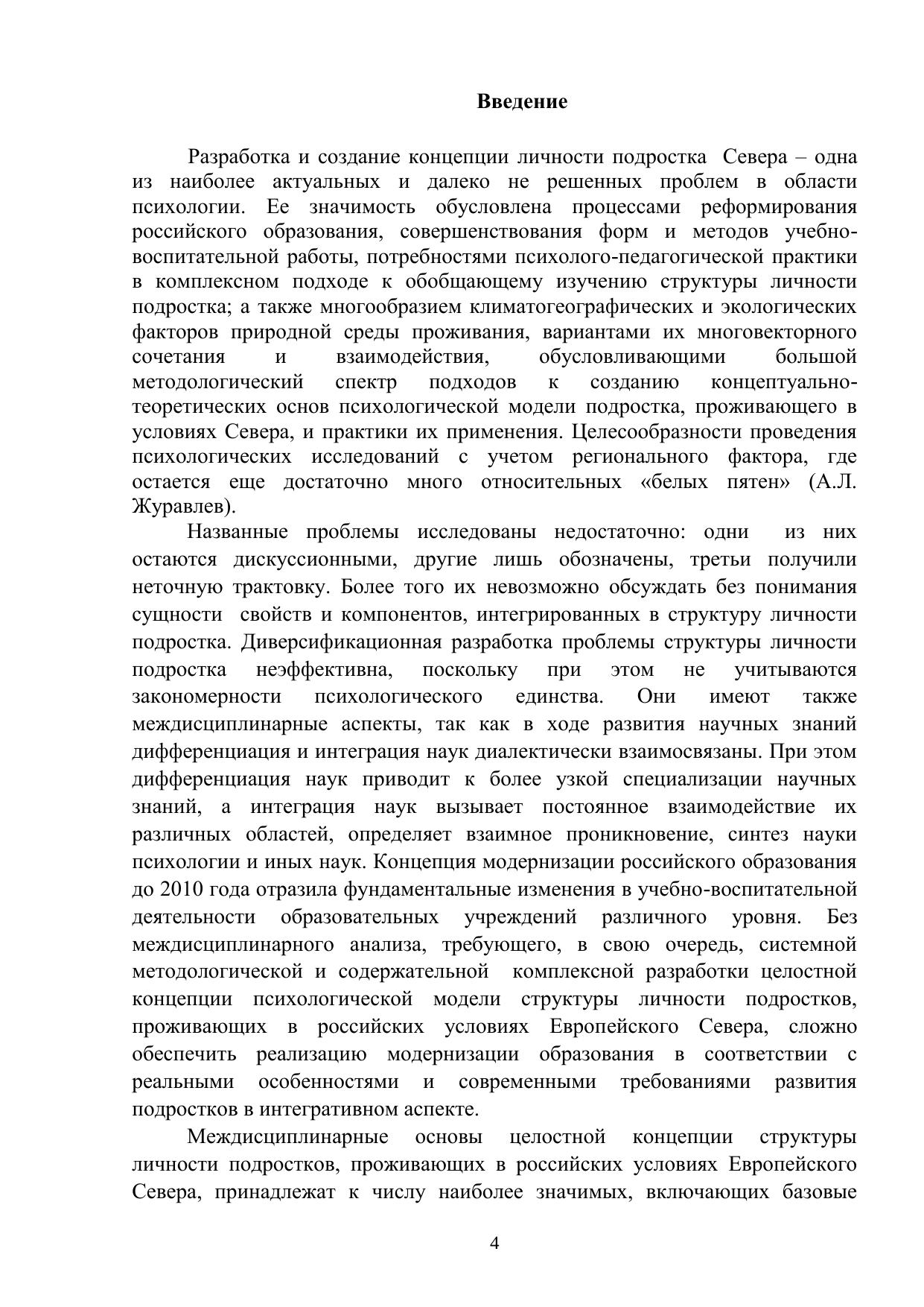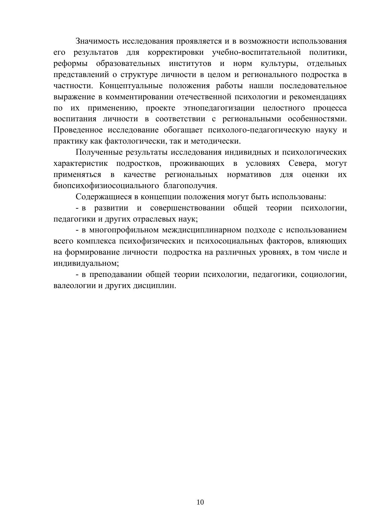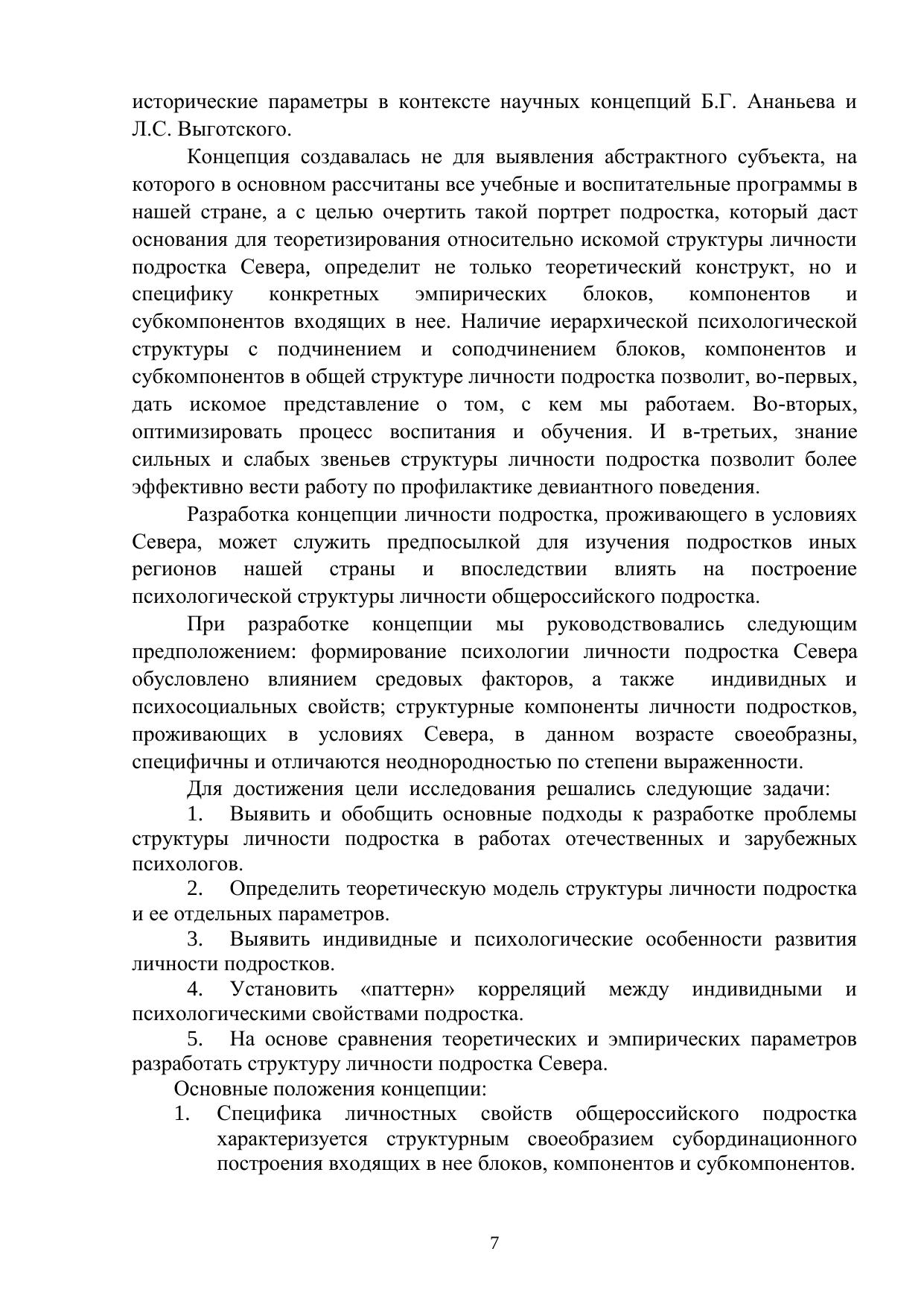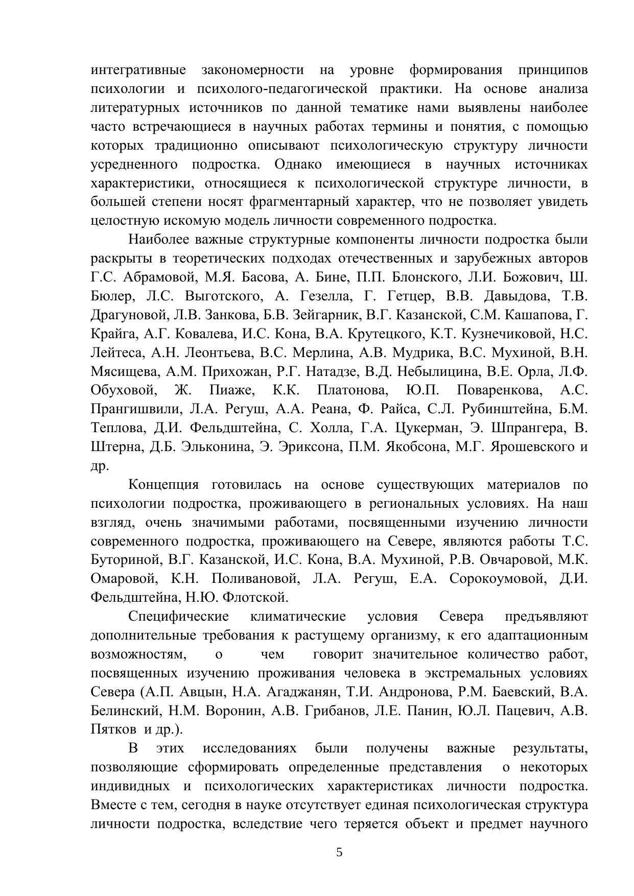 Концепция личностных свойств подростка Севера подготовлена на основе обобщения авторских монографий «Психологические особенности подростков малого города», «Концептуальные подходы к исследованию психологической структуры личности и деятельности подростка», «Психологическая структура личности регионального подростка», «Исследование структуры личности подростка Севера» и статей. Концепция учитывает разнообразие подходов к рассмотрению региональной психологической проблемы в контексте научно-исследовательской деятельности Института психологии Российской Академии Наук, обозначенной в докладе на юбилейной научной конференции директором ИП РАН А.Л. Журавлевым 31 января 2007 года.