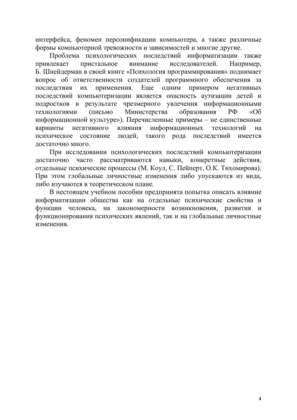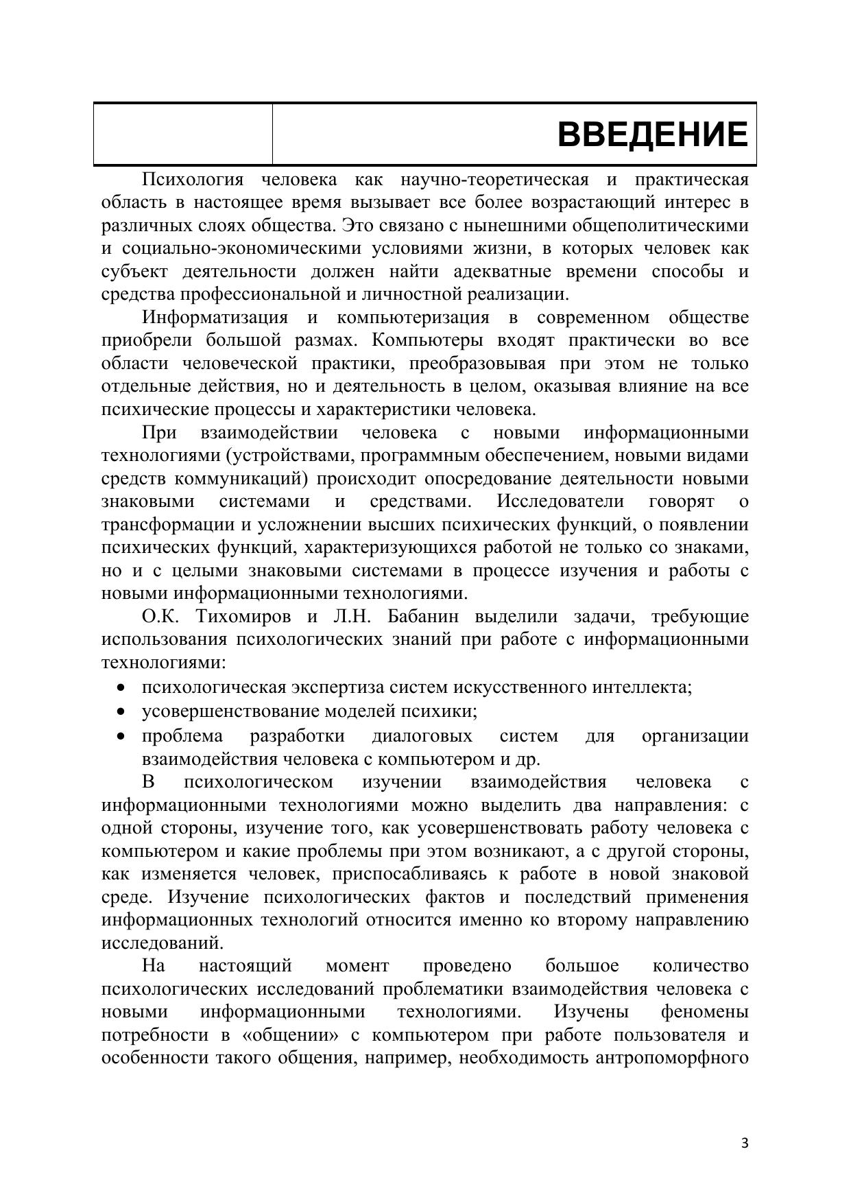 Пособие охватывает теоретический материал, необходимый для усвоения программы курса, и состоит из 2 частей. В первой части рассматриваются вопросы, связанные с предметом, методом и историей психологии, а также психологией познавательных процессов, репродуктивных и творческих процессов, психологией личности, психическими состояниями. Все изложение ведется применительно к особенностям взаимодействия человека и информационных систем в гуманитарной сфере. Пособие адресовано студентам, обучающимся по направлению подготовки 036000 – Интеллектуальные системы в гуманитарной сфере.