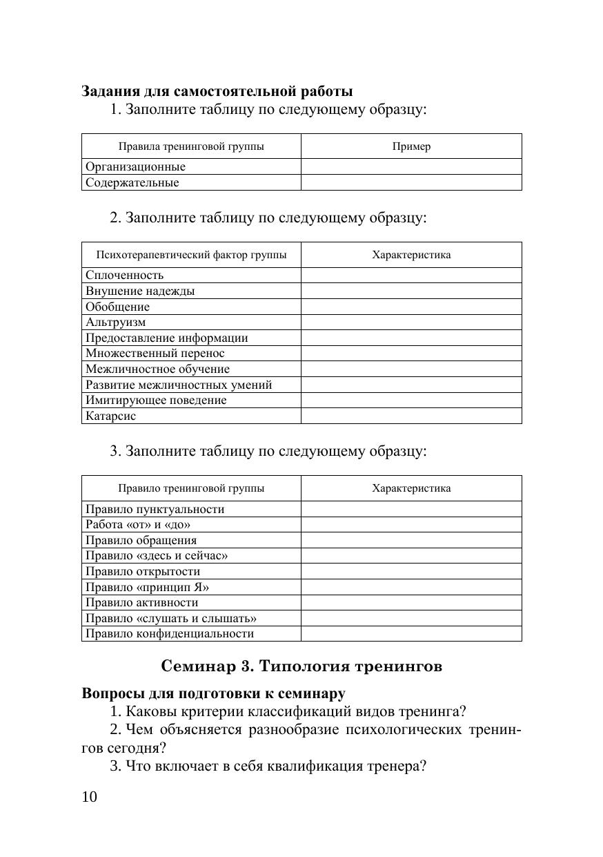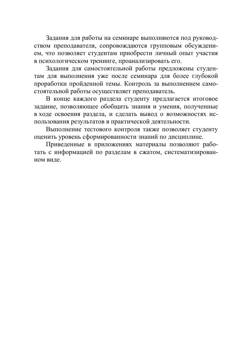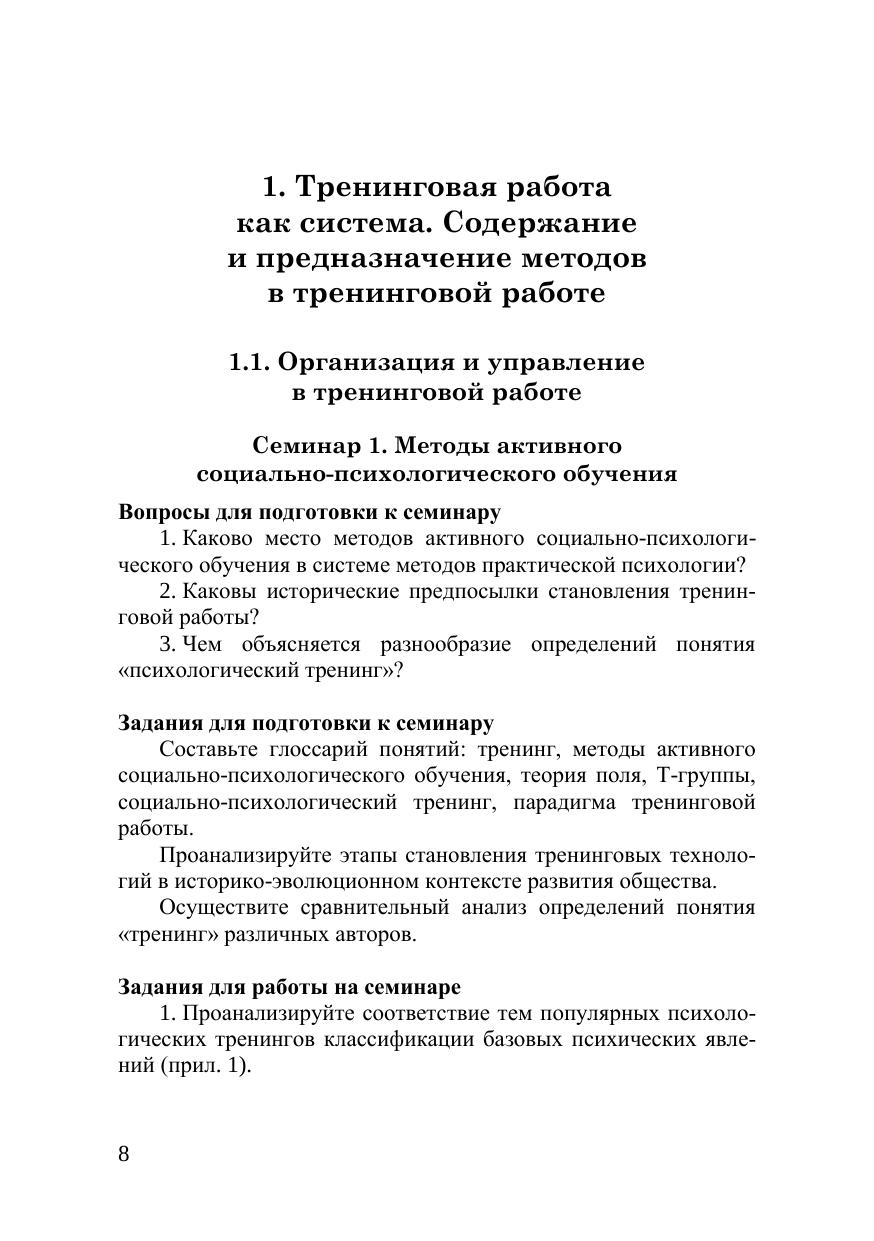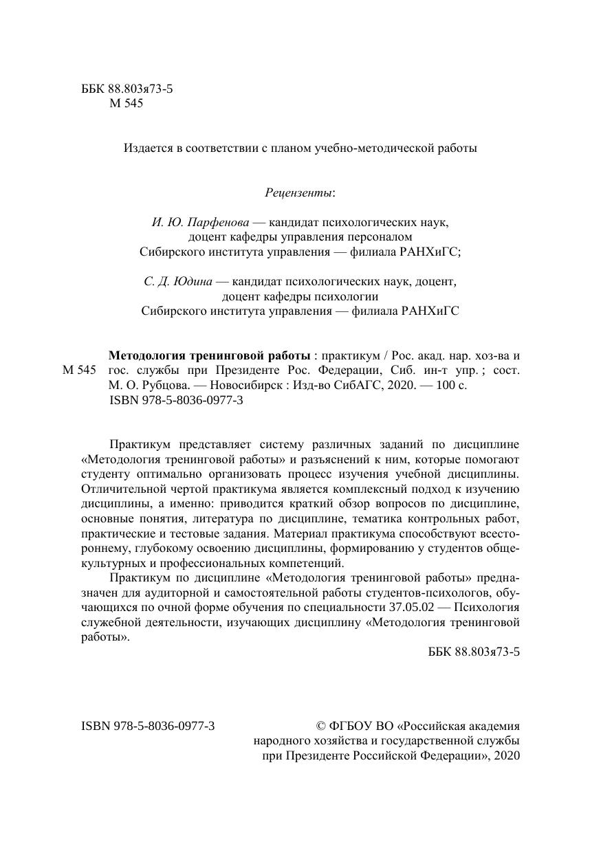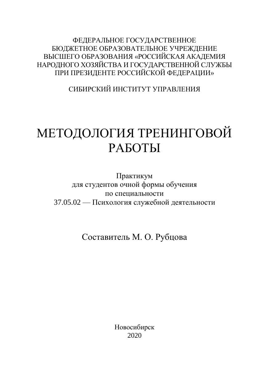 Практикум представляет систему различных заданий по дисциплине «Методология тренинговой работы» и разъяснений к ним, которые помогают студенту оптимально организовать процесс изучения учебной дисциплины. Отличительной чертой практикума является комплексный подход к изучению дисциплины, а именно: приводится краткий обзор вопросов по дисциплине, основные понятия, литература по дисциплине, тематика контрольных работ, практические и тестовые задания. Материал практикума способствуют всесто-роннему, глубокому освоению дисциплины, формированию у студентов обще-культурных и профессиональных компетенций. Практикум по дисциплине «Методология тренинговой работы» предна-значен для аудиторной и самостоятельной работы студентов-психологов, обу-чающихся по очной форме обучения по специальности 37.05.02 — Психология служебной деятельности, изучающих дисциплину «Методология тренинговой работы».