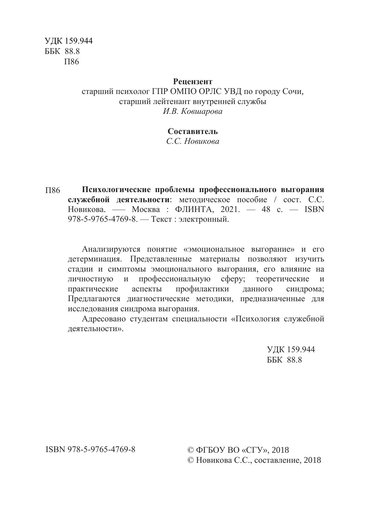 Анализируются понятие «эмоциональное выгорание» и его детерминация. Представленные материалы позволяют изучить стадии и симптомы эмоционального выгорания, его влияние на личностную и профессиональную сферу; теоретические и практические аспекты профилактики данного синдрома; Предлагаются диагностические методики, предназначенные для исследования синдрома выгорания.