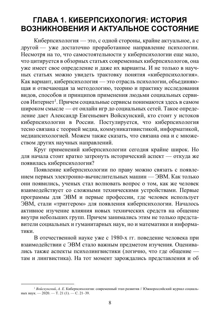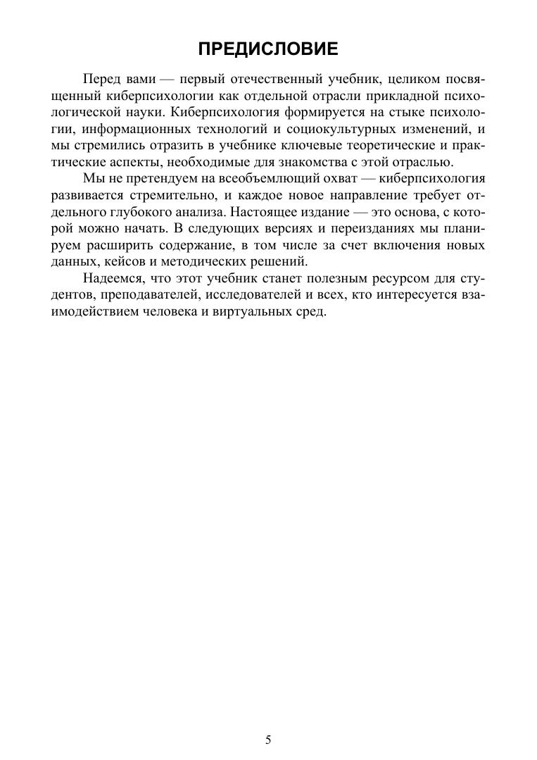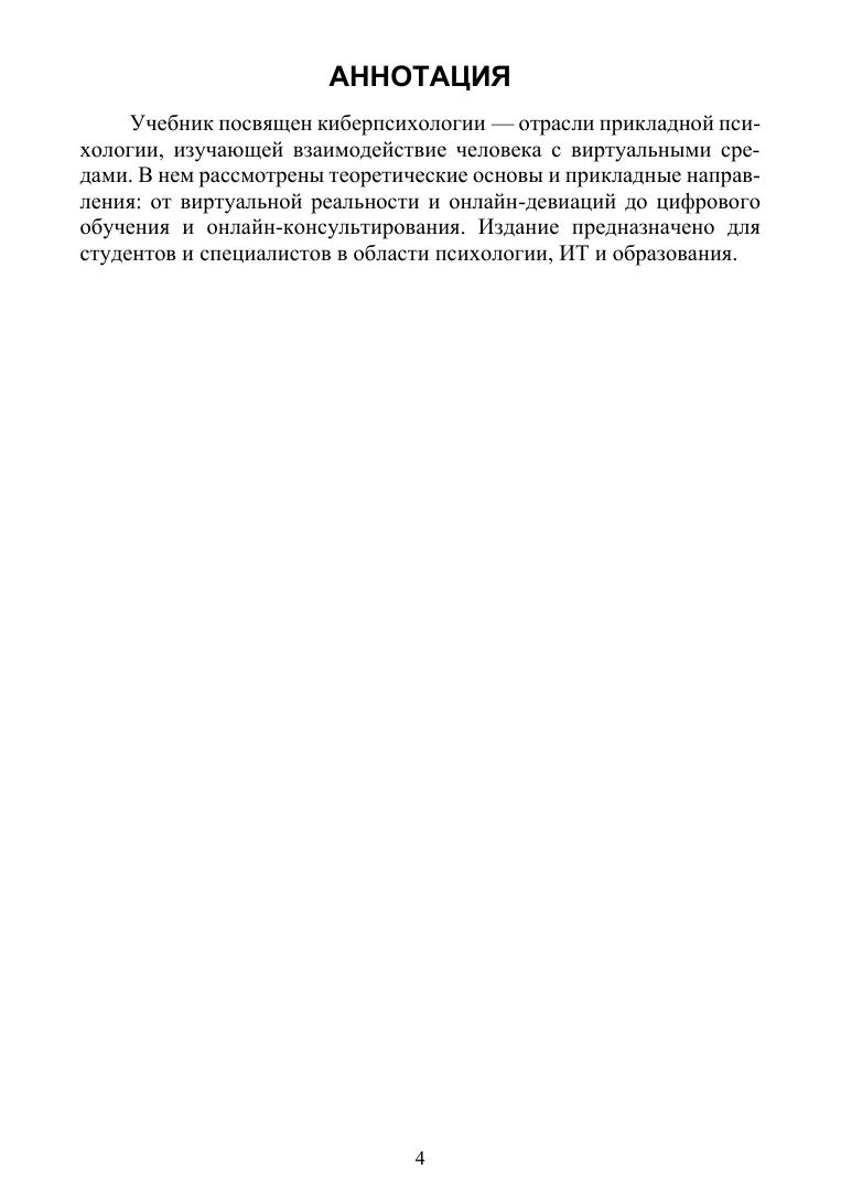Киберпсихология — это отрасль прикладной психологии, изучающая взаимодействие человека с виртуальными средами. Перед вами — первый отечественный учебник, целиком посвященный этой новой отрасли психологической науки. Киберпсихология формируется на стыке психологии, информационных технологий и социокультурных изменений. Поэтому в учебнике рассматривается широкий спектр феноменов: цифровая среда обитания современного человека, методы исследований этой среды, вопросы цифровой зависимости и онлайн-девиаций, практика онлайн-консультирования, влияние цифровых технологий на обучение и коммуникацию и ряд других. Учебник предназначен в первую очередь для студентов вузов, обучающихся на таких направлениях подготовки, как «Психология», «Конфликтология» и «Социология», а также «Клиническая психология». Но будет востребован педагогами-практиками, сследователями и всеми, кто интересуется проблемами взаимодействия человека и виртуальных сред.