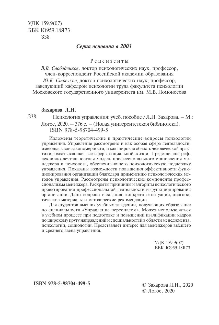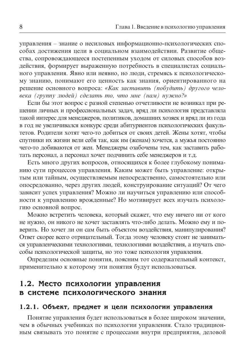 Изложены теоретические и практические вопросы психологии управления. Управление рассмотрено и как особая сфера деятельности, имеющая свои закономерности, и как широкая область человеческой практики, охватывающая все сферы социальной жизни. Представлена рефлексивнодеятельностная модель профессионального становления менеджера и психолога, обеспечивающего психологическую поддержку управления. Показаны возможности повышения эффективности функционирования организаций благодаря применению психологических методов управления. Рассмотрены психологические компоненты профессионализма менеджера. Раскрыты принципы и алгоритм психологического проектирования профессиональной деятельности и функционирования организации. Даны вопросы и задания, конкретные ситуации, диагностические материалы и методические рекомендации. Для студентов высших учебных заведений, получающих образование по специальности «Управление персоналом». Может использоваться в учебном процессе при подготовке и повышении квалификации кадров по широкому кругу направлений и специальностей в области менеджмента, психологии, социологии. Представляет интерес для менеджеров высшего и среднего звена управления.