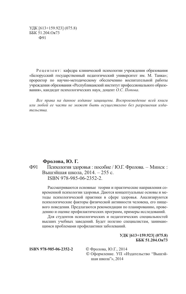 Рассматриваются основные теории и практические направления современной психологии здоровья. Даются концептуальные основы и методы психологической практики в сфере здоровья. Анализируются психологические факторы физической активности человека, его пищевого поведения. Предлагаются рекомендации по планированию, проведению и оценке профилактичеческих программ, примеры исследований. Для студентов психологических и педагогических специальностей вузов. Будет полезно специалистам, занимающимся проблемами профилактики заболеваний.
