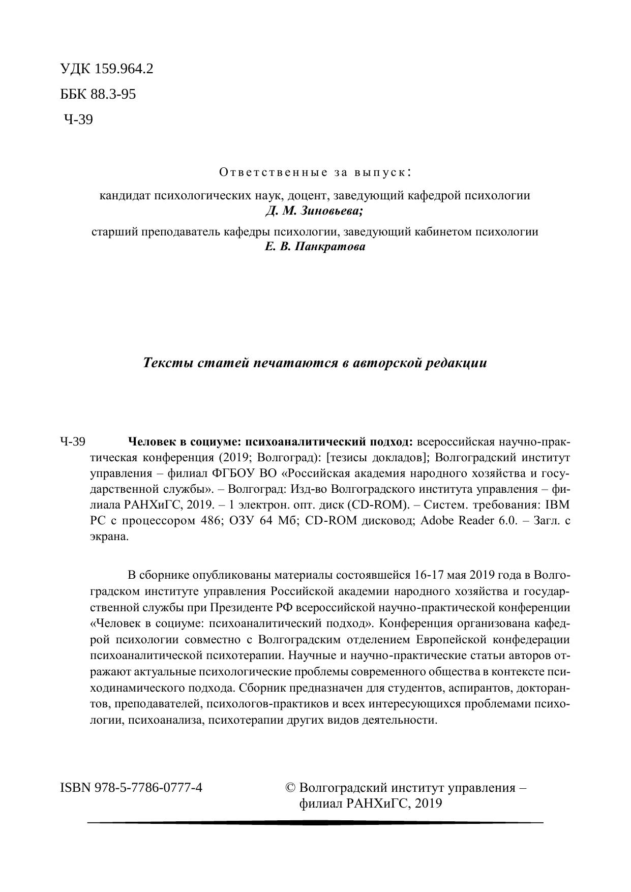 В сборнике опубликованы материалы состоявшейся 16-17 мая 2019 года в Волго-градском институте управления Российской академии народного хозяйства и государ-ственной службы при Президенте РФ всероссийской научно-практической конференции «Человек в социуме: психоаналитический подход». Конференция организована кафед-рой психологии совместно с Волгоградским отделением Европейской конфедерации психоаналитической психотерапии. Научные и научно-практические статьи авторов от-ражают актуальные психологические проблемы современного общества в контексте пси-ходинамического подхода. Сборник предназначен для студентов, аспирантов, докторан-тов, преподавателей, психологов-практиков и всех интересующихся проблемами психо-логии, психоанализа, психотерапии других видов деятельности.